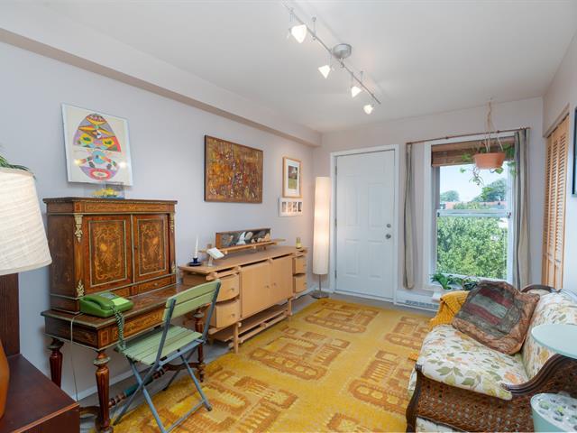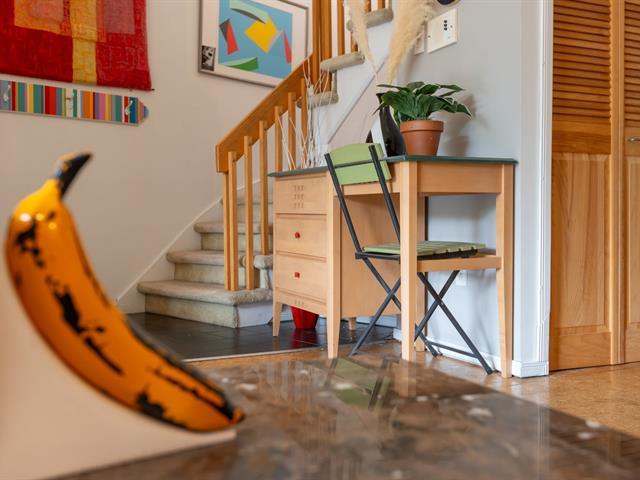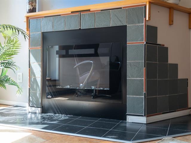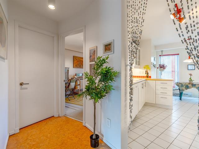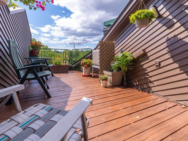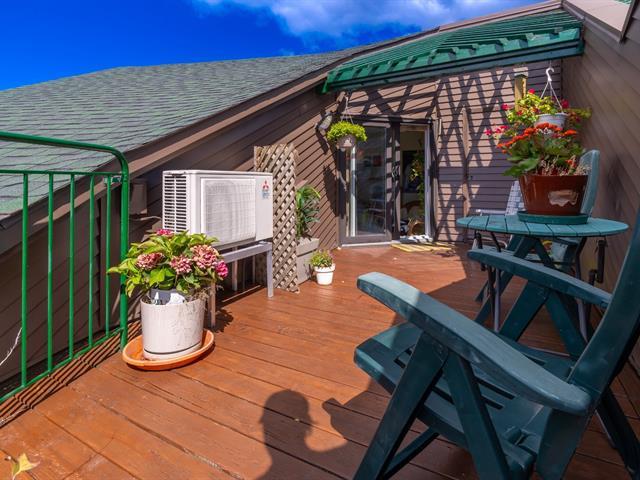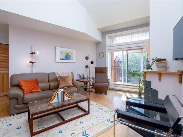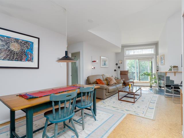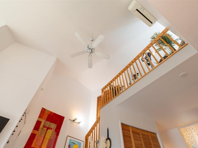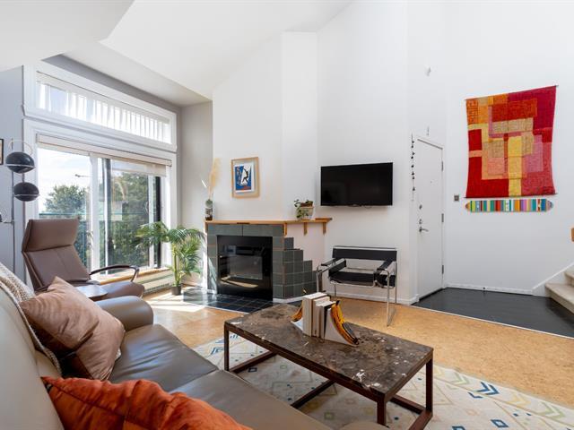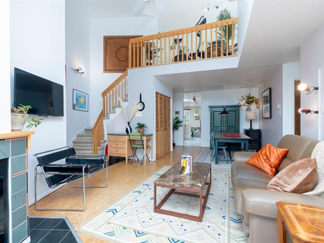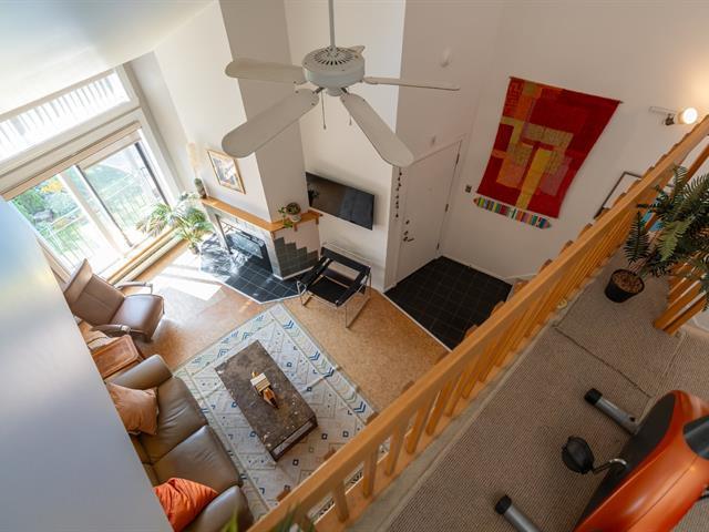 Bright and spacious 1,220 sq. ft. condo with cathedral ceilings, 2 closed bedrooms, and a versatile mezzanine with large storage. Private terrace with stunning views of the Rivière des Prairies and surrounding greenery. Practical kitchen with ample cabinets and large counter, all appliances included. Electric fireplace, wall-mounted A/C, and quality electric baseboards. Includes indoor garage and large storage with 110V outlet, perfect for EV charging. Well-managed condo with affordable fees and taxes. Waterfront complex with bike paths, parks, and quick access to Pie-IX Bridge. Bikes storage. Quick occupancy available. (46092996)