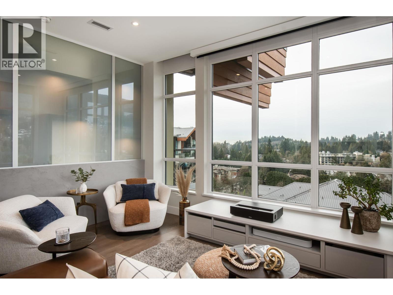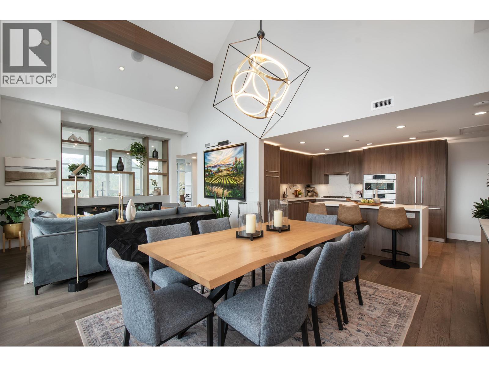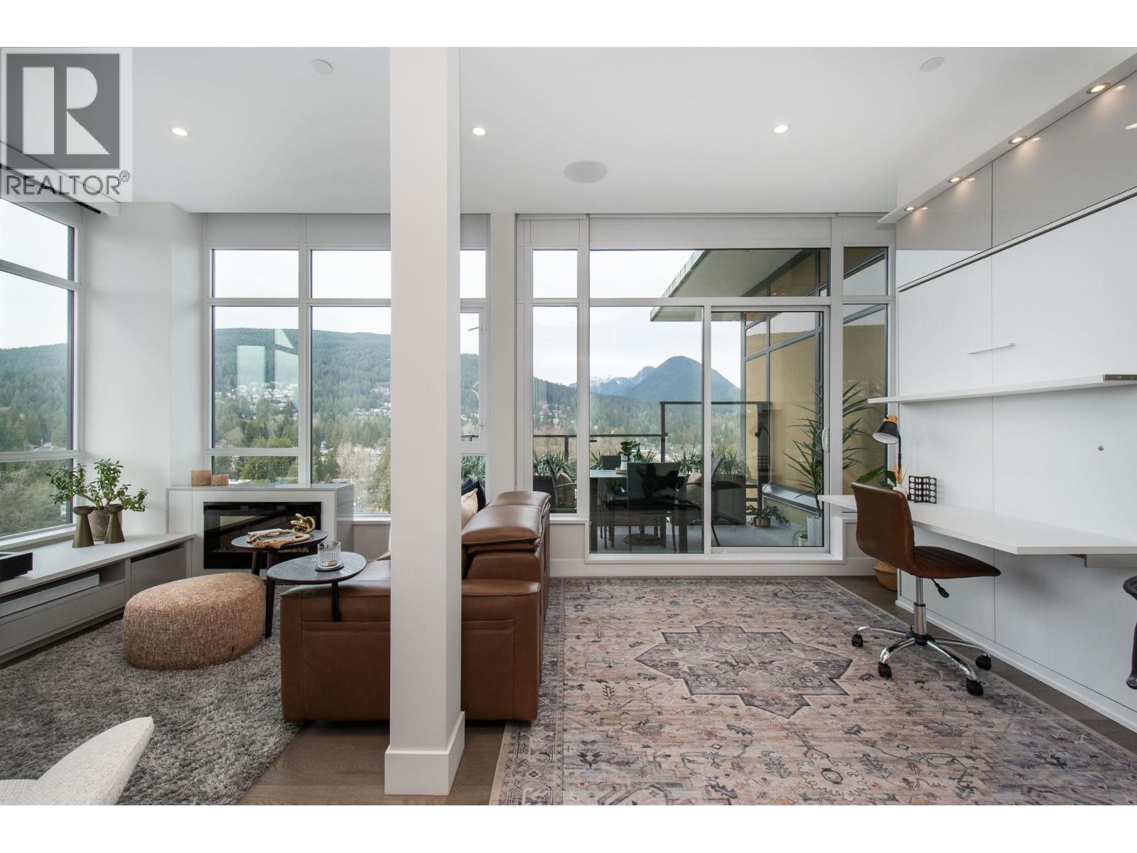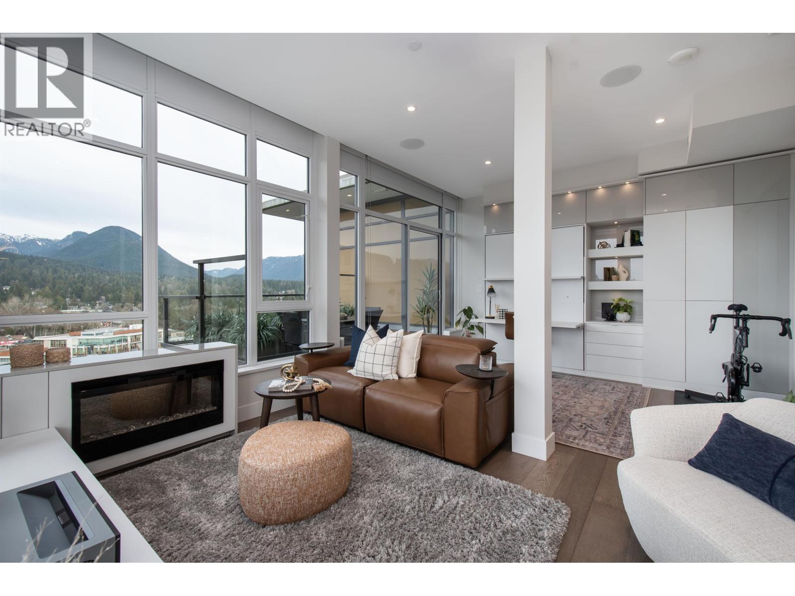 A Lynn Valley penthouse defined by architectural presence, layered living, and quiet luxury in a prime North Vancouver setting. The layout is confidently composed, this is life without compromise. The light-filled living and dining space is enhanced by vaulted ceilings and architectural beams, establishing proportion and scale. A discreetly separated secondary living area is delineated by a linear fireplace and custom smartglass, creating open sight-lines or complete privacy at the touch of a button. The space includes a custom wall bed and desk system, with a media area featuring a drop-down screen and projector for cinema nights. The kitchen integrates seamlessly, supporting daily flow while setting the stage for gathering. A custom built-in bed and feature wall anchor the primary suite. Built by Bosa and thoughtfully enhanced, the home feels measured and enduring throughout. Set atop The Residences at Lynn Valley, steps to trails, cafés, and everyday conveniences, this is design-led living with restraint. (32397376)