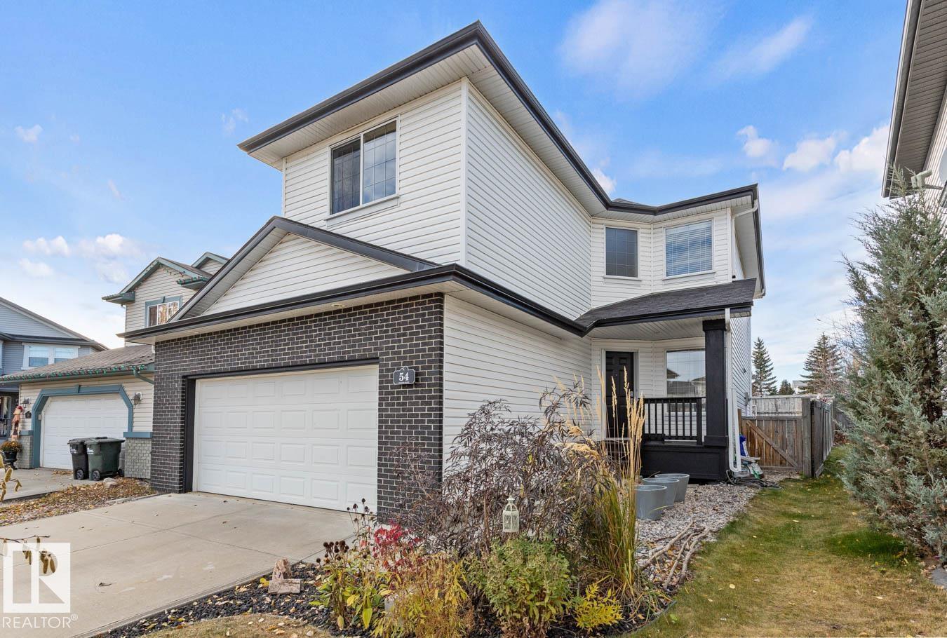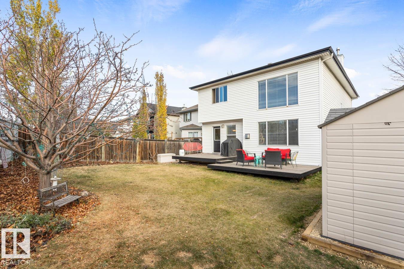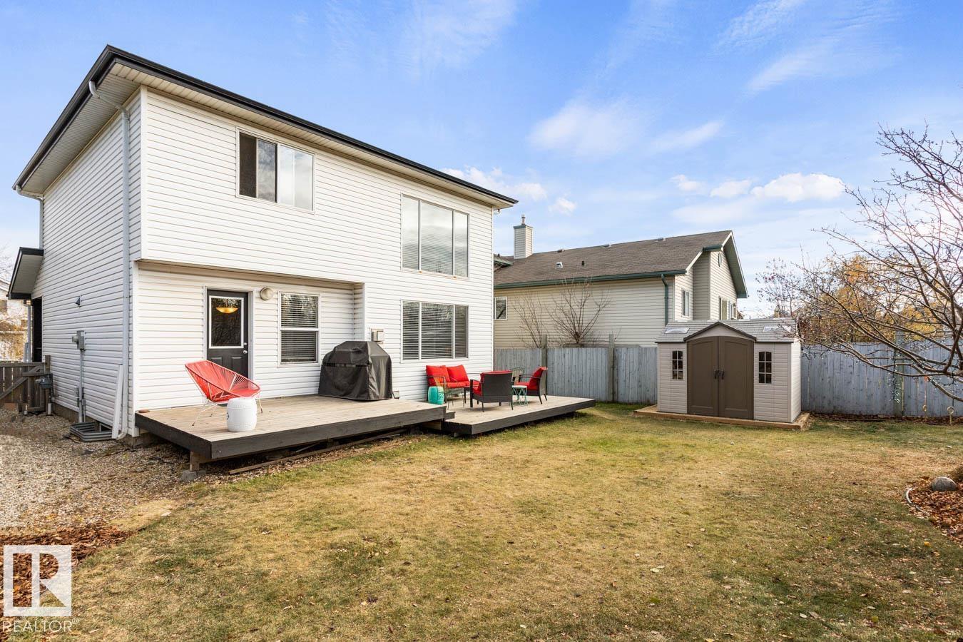 Located in the desirable community of Heritage Hills, this well-maintained home offers 3 bedrooms, 2.5 baths, and a NEW ROOF. Step inside to a bright, functional floor plan featuring luxury vinyl plank flooring and an abundance of natural light. The kitchen showcases plenty of white cabinetry, stainless steel appliances, a corner pantry, and island overlooking the dining area with cozy fireplace and a family-sized living room with soaring two-storey ceilings. Upstairs, the king-sized primary suite features dual closets and a private ensuite. Two additional generous bedrooms, a 4-pc main bath, and convenient upper-floor laundry complete the level. The unfinished basement provides excellent potential for a rec room or additional bedrooms & bathroom with RI plumbing. Enjoy the west-facing, fully fenced and landscaped yard with entertaining-sized deck and storage shed. Fantastic location close to parks, schools, Heritage Hills Dog Park, wetlands trails, and all amenities. (33784800)