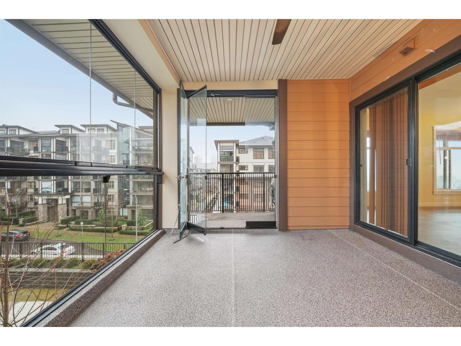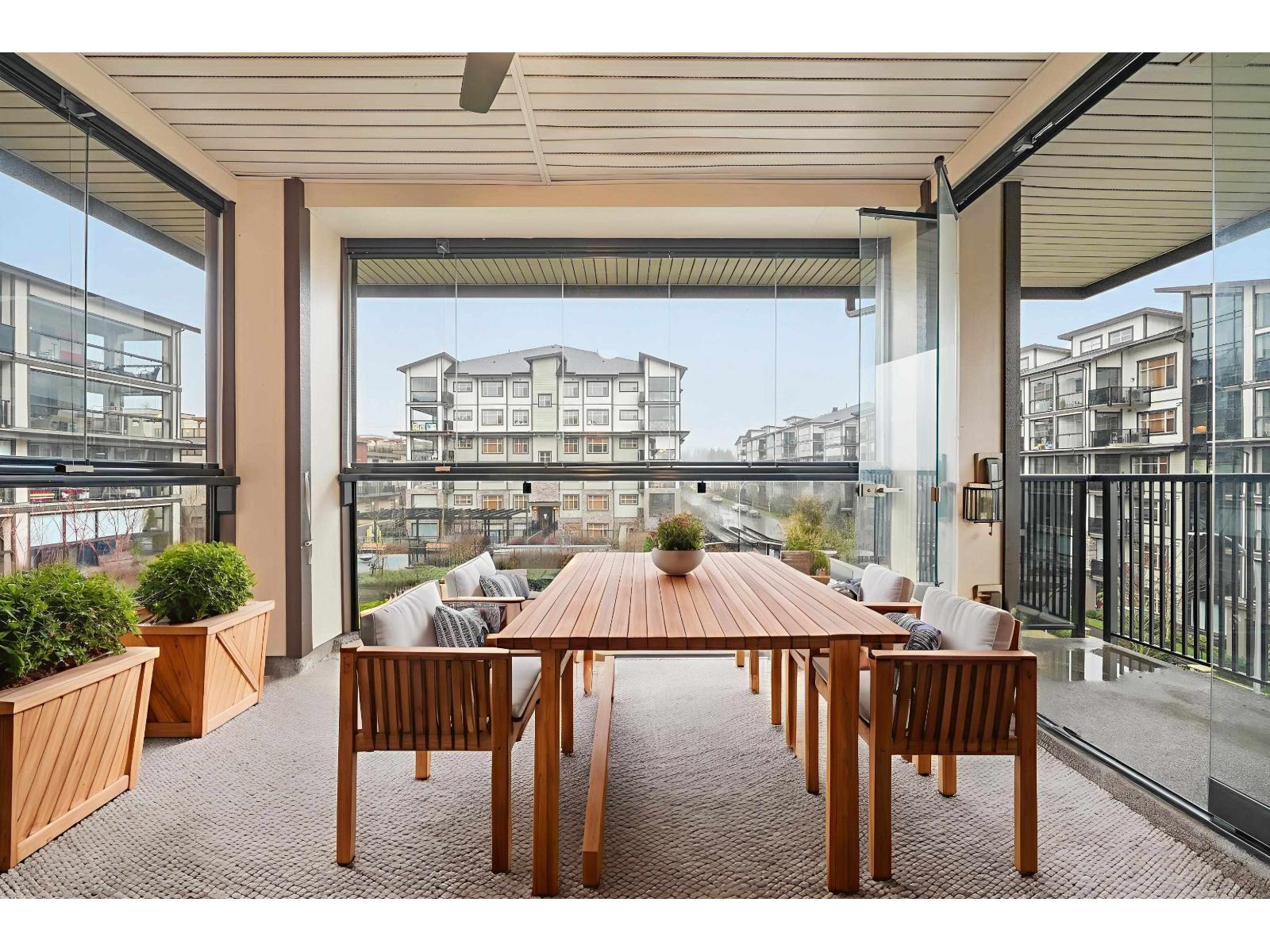 Welcome to Yorkson Park! 4th floor living in the heart of Willoughby Heights! This spacious 2 BED + DEN + 2 BATH home offers thoughtfully designed interiors with laminate flooring throughout, a cozy fireplace, A/C in every room, and a versatile den ideal for a home office. The south-facing glass-enclosed solarium is the standout feature, with retractable panels that flood the space with natural light all day and create seamless indoor/outdoor living, perfect for summer entertaining or a sheltered year-round retreat, complete with a natural gas BBQ hookup. Includes 2 parking stalls + a massive roll-up storage locker. Steps to Carvolth Exchange, Yorkson Park, restaurants, shops, and everyday services, comfort and convenience all in one! Open House: Sat Feb 7, 2-4PM. (32399815)
