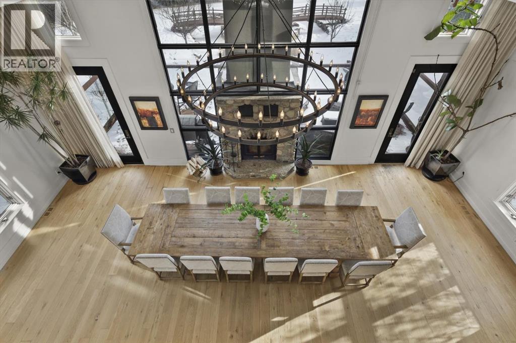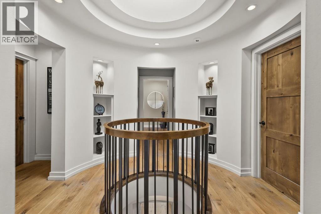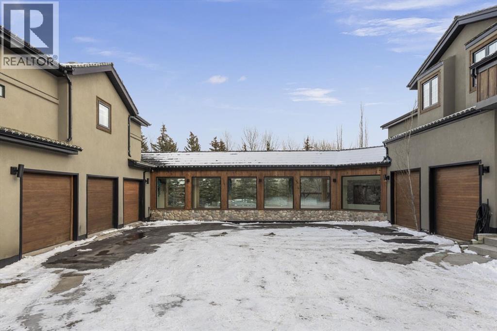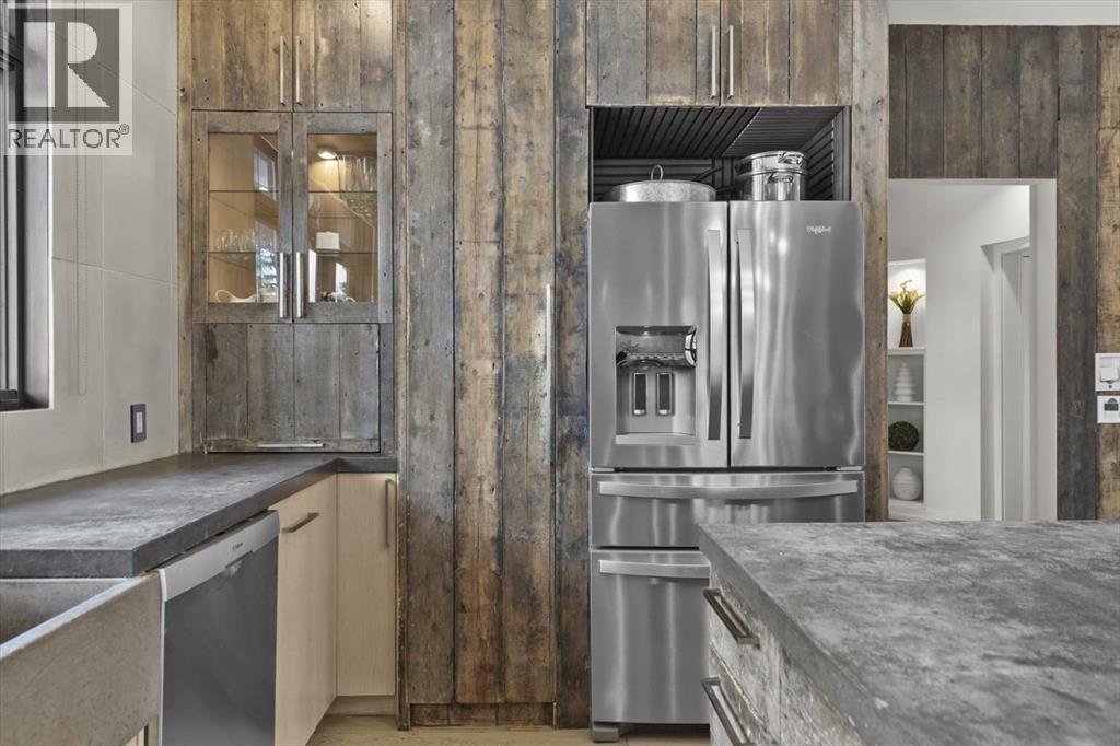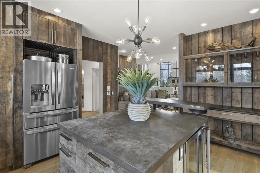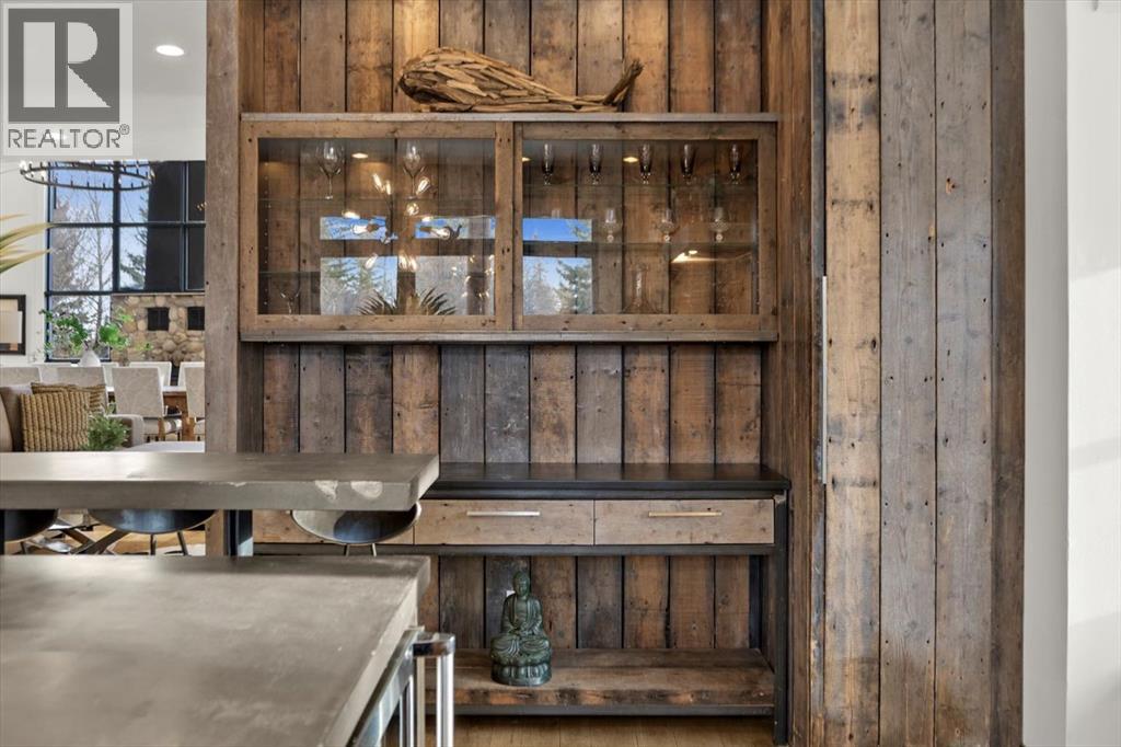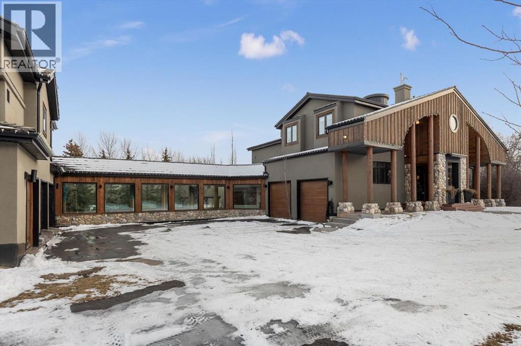 Some homes are designed for function, others for style - this one was designed for something more. Set on just over two acres in Bearspaw, this residence reveals its character the moment you arrive: sweeping curves in the architecture, river rock columns, and a presence that promises there's a story around every corner.Step inside and a circular skylight draws your eye upward, casting light through a graceful rotunda that anchors the home. Those architectural curves continue throughout - in hallways, railings, and built-in niches designed for art and treasured pieces.The main level presents two interconnected living spaces with remarkable flexibility. The larger room, currently configured as an expansive dining area easily seating 14, features soaring ceilings, a river rock fireplace, and walls of windows. The adjacent sitting area offers a more intimate scale. These spaces can easily trade purposes - a generous living room with traditional dining to the side, or kept as designed for those who entertain on a grand scale.Throughout the home, reclaimed barn-board sourced from England creates warmth against contemporary elements - concrete countertops, sleek fixtures, clean architectural lines. It's a considered contrast that feels both grounded and refined. The kitchen embodies this aesthetic, aged wood cabinetry meeting industrial concrete surfaces, a breakfast nook tucked into the window.The primary suite offers a spa-inspired ensuite with pebble stone walls, open shower, and deep soaker tub. Two additional bedrooms, family bathroom and laundry facilities share the upper level, accessed from curved hallways with a striking circular opening overlooking the rotunda.The walkout level opens to casual gathering space, a fourth bedroom, bathroom, exercise area and a very unique dual wine cellar and cigar humidor. A glass breezeway connects the main house to a secondary garage with self-contained guest suite above - Murphy beds and lounge space equally suited a s creative studio or home office. For the collector: a separate garage bay accessed by fingerprint recognition, purpose-built for a prized vehicle.Outside, the property unfolds with equal intention. In-ground pool, hot tub, and firepit create spaces for every season. Circling a stone platform at the heart of the grounds, a moat crossed by two wooden bridges - a meditative feature that speaks to the thoughtfulness woven throughout.For the right person, this won't simply be a beautiful property. It will feel like home. (31597538)