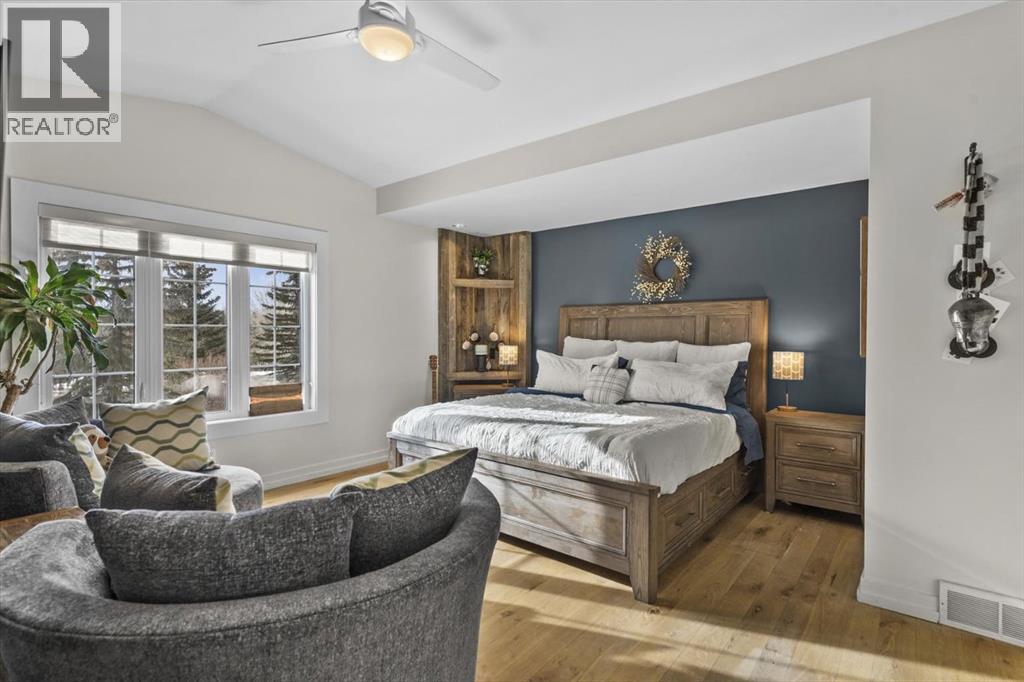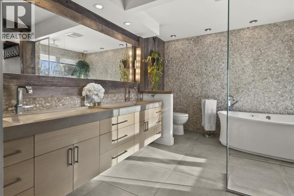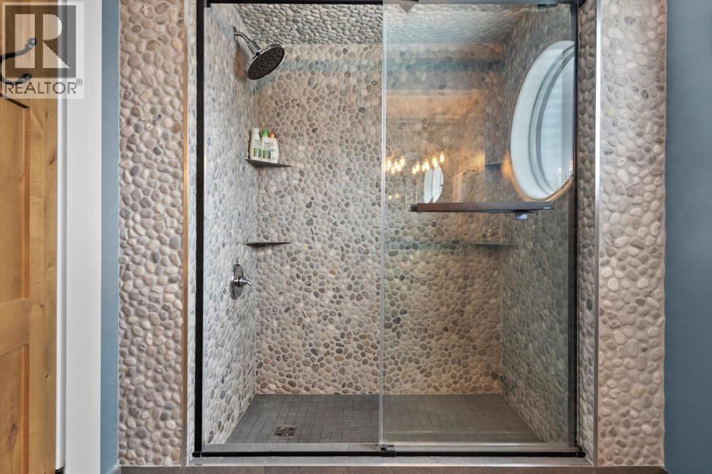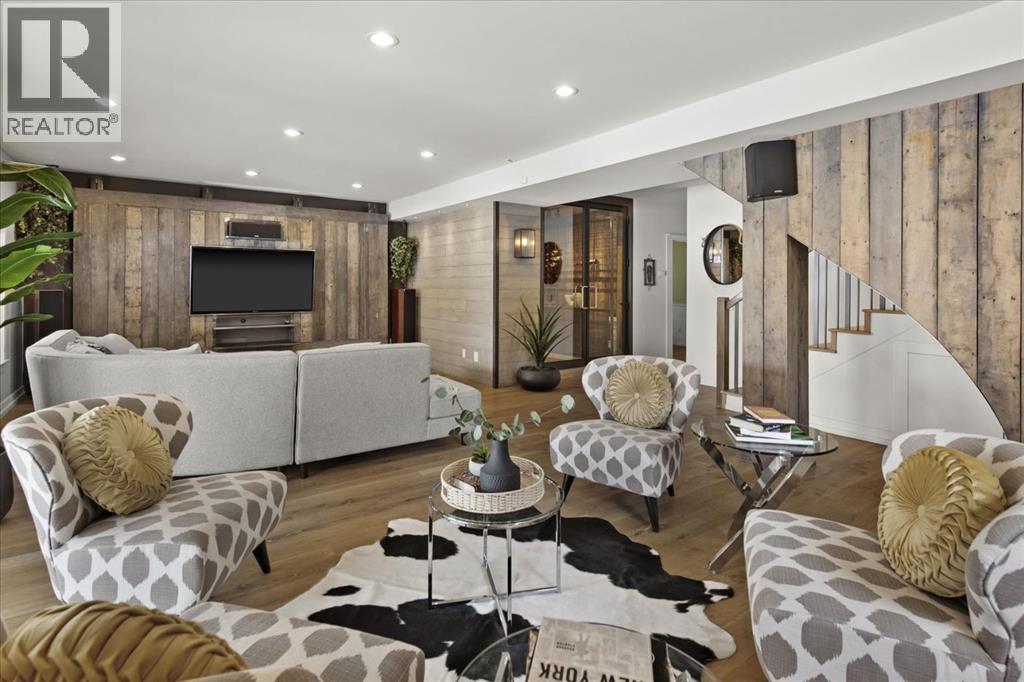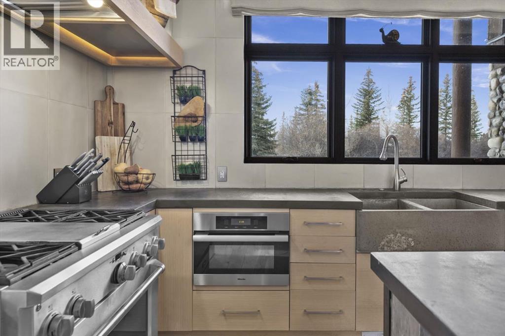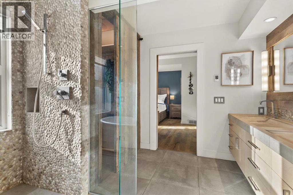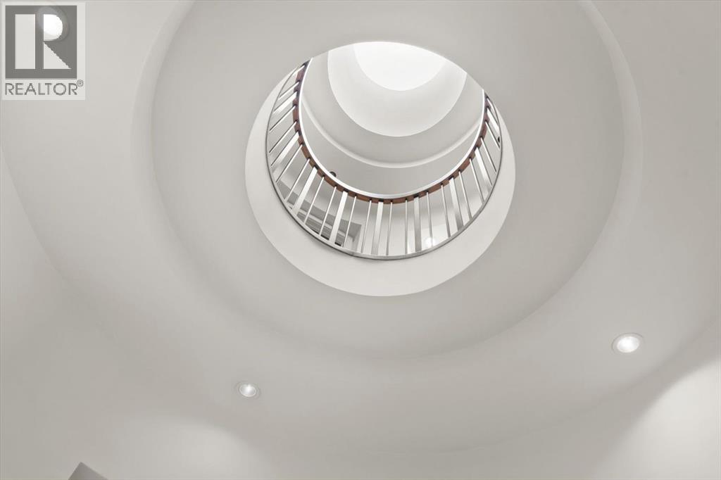 Some homes are designed for function, others for style - this one was designed for something more. Set on just over two acres in Bearspaw, this residence reveals its character the moment you arrive: sweeping curves in the architecture, river rock columns, and a presence that promises there's a story around every corner.Step inside and a circular skylight draws your eye upward, casting light through a graceful rotunda that anchors the home. Those architectural curves continue throughout - in hallways, railings, and built-in niches designed for art and treasured pieces.The main level presents two interconnected living spaces with remarkable flexibility. The larger room, currently configured as an expansive dining area easily seating 14, features soaring ceilings, a river rock fireplace, and walls of windows. The adjacent sitting area offers a more intimate scale. These spaces can easily trade purposes - a generous living room with traditional dining to the side, or kept as designed for those who entertain on a grand scale.Throughout the home, reclaimed barn-board sourced from England creates warmth against contemporary elements - concrete countertops, sleek fixtures, clean architectural lines. It's a considered contrast that feels both grounded and refined. The kitchen embodies this aesthetic, aged wood cabinetry meeting industrial concrete surfaces, a breakfast nook tucked into the window.The primary suite offers a spa-inspired ensuite with pebble stone walls, open shower, and deep soaker tub. Two additional bedrooms, family bathroom and laundry facilities share the upper level, accessed from curved hallways with a striking circular opening overlooking the rotunda.The walkout level opens to casual gathering space, a fourth bedroom, bathroom, exercise area and a very unique dual wine cellar and cigar humidor. A glass breezeway connects the main house to a secondary garage with self-contained guest suite above - Murphy beds and lounge space equally suited a s creative studio or home office. For the collector: a separate garage bay accessed by fingerprint recognition, purpose-built for a prized vehicle.Outside, the property unfolds with equal intention. In-ground pool, hot tub, and firepit create spaces for every season. Circling a stone platform at the heart of the grounds, a moat crossed by two wooden bridges - a meditative feature that speaks to the thoughtfulness woven throughout.For the right person, this won't simply be a beautiful property. It will feel like home. (31597538)