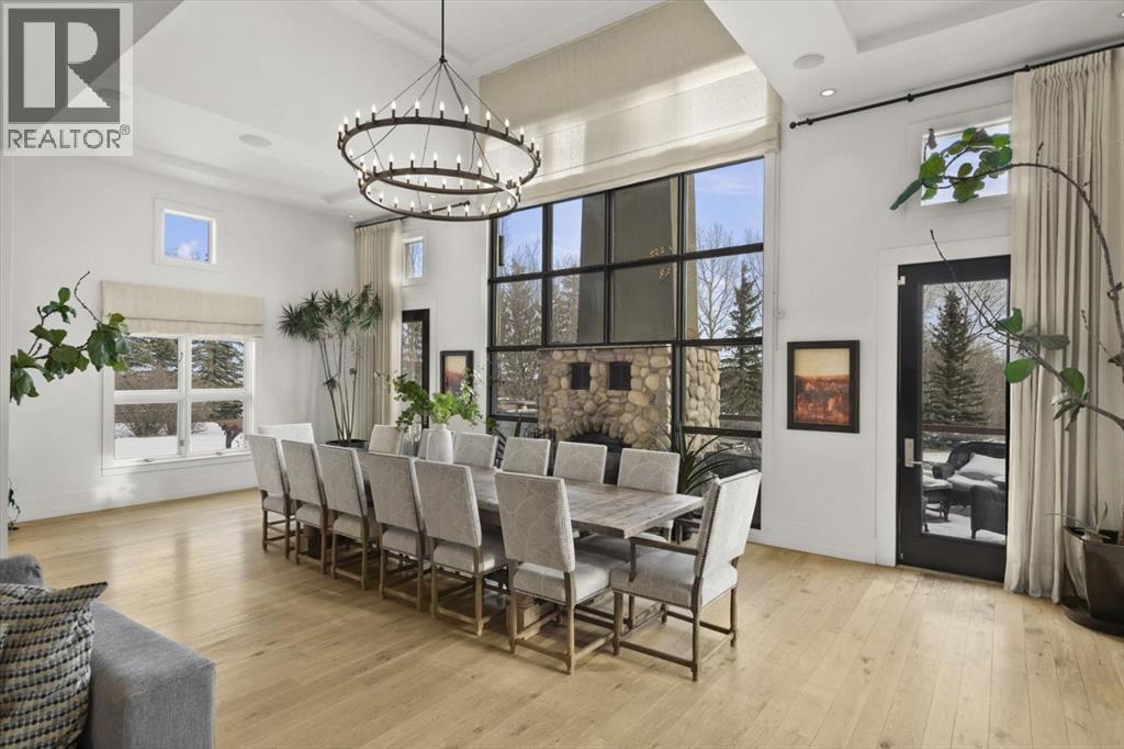 This dining space easily seats 14, and features soaring ceilings, river rock fireplace and walls of windows