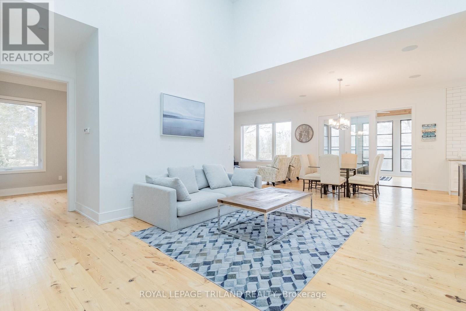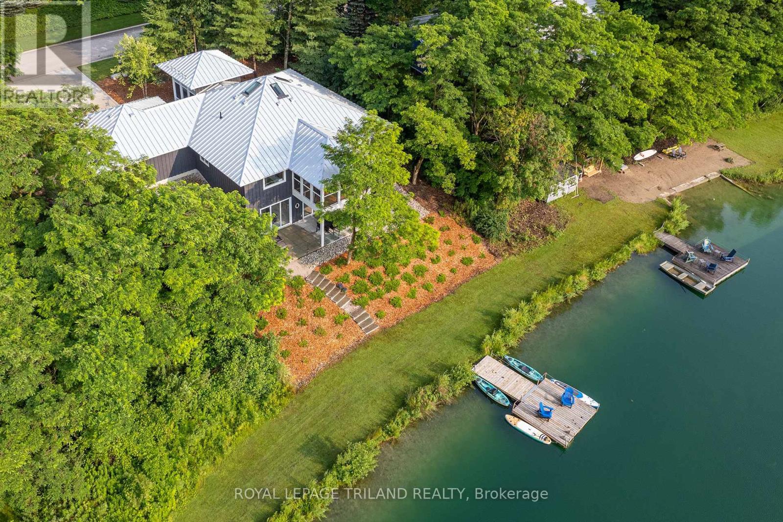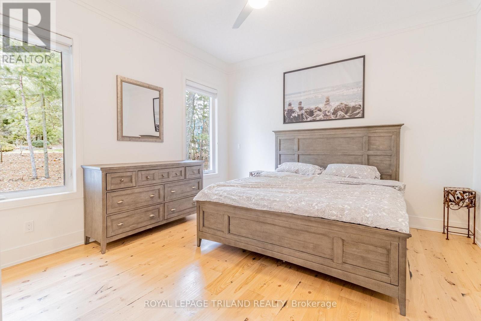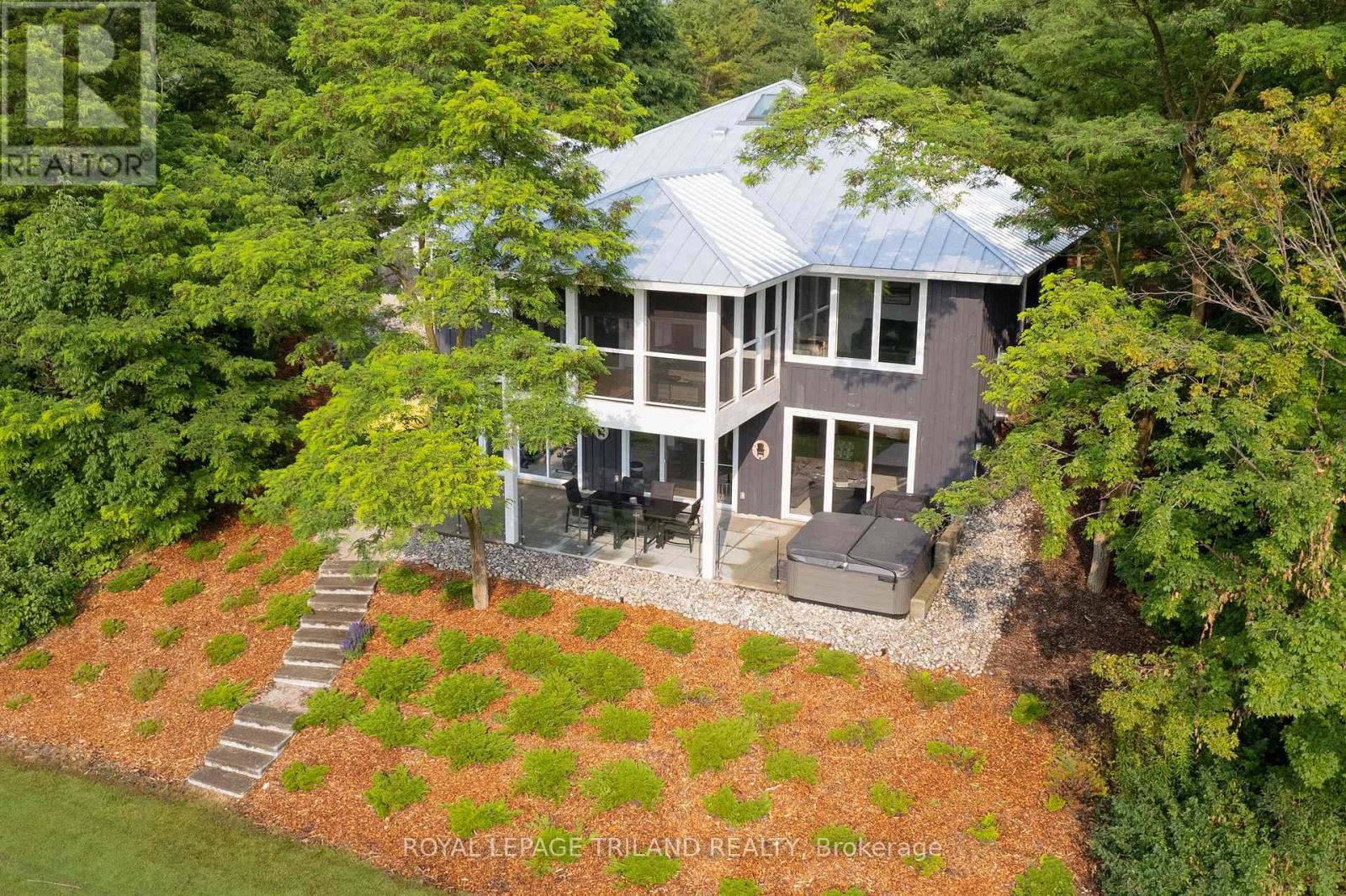 MUSKOKA IN GRAND BEND | WATERFRONT ON PRIVATE LAKE w/ SPECTACULAR VIEWS | FULLY FURNISHED TURNKEY PACAKAGE | STEPS TO SANDY BEACH ACCESS: Welcome to Wee Lake, Grand Bend's best kept secret featuring a crystal clear sparkling blue spring fed private lake for swimming, paddle boarding, fishing & kayaking + stellar skating & family hockey in the winter + access to the Ausable River for even better fishing! Fall in love with this young custom 4 bed/4bath walk-out bungalow, one of only 5 lakefront properties nestled into this secluded subdivision, which is a small & quiet single cul de sac community on the beachside of the HWY. With only 36 parcels total & lake access limited to Wee Lake residents (sharing 1/36 ownership of lake), this tranquil & peaceful naturally fed sparkling phenomenon is barely used. This stunning architecturally designed custom masterpiece fronts the lake w/ 134' of priceless linear water frontage. Providing exceptional main floor living framing-in nonstop lake views + a sprawling lower level walking out to your included hot tub & swimming/fishing dock just 50 ft from your poured concrete patio, this is a 10+! The layout is brilliant, w/ soaring main level ceilings inc. an impressive 20+ ft vault & 10 ft ceilings throughout rest of main, a stellar master suite w/ ensuite/walk-in, laundry w/ sink + 2nd laundry in lower, 2 more main level bedrooms (one w/ a 1/2 bath ensuite/ ideal for home office), 2 sunrooms (guest sleepers), 2 gas fireplaces, lower level walk-out w/ bed & full bath + wall to wall windows - simply perfect. Imagine sipping your morning coffee while the kids or grandkids swim off your private dock w/ the dogs enjoying their fenced in yard / dog run. As an ideal family get away, short term rental money maker, or principal residence in the booming beach town of Grand Bend, this is a winner, just to steps to one of our most secluded area beach access points, the Pinedale Rd beach path. Turnkey package including furniture & appliances! (42064921)