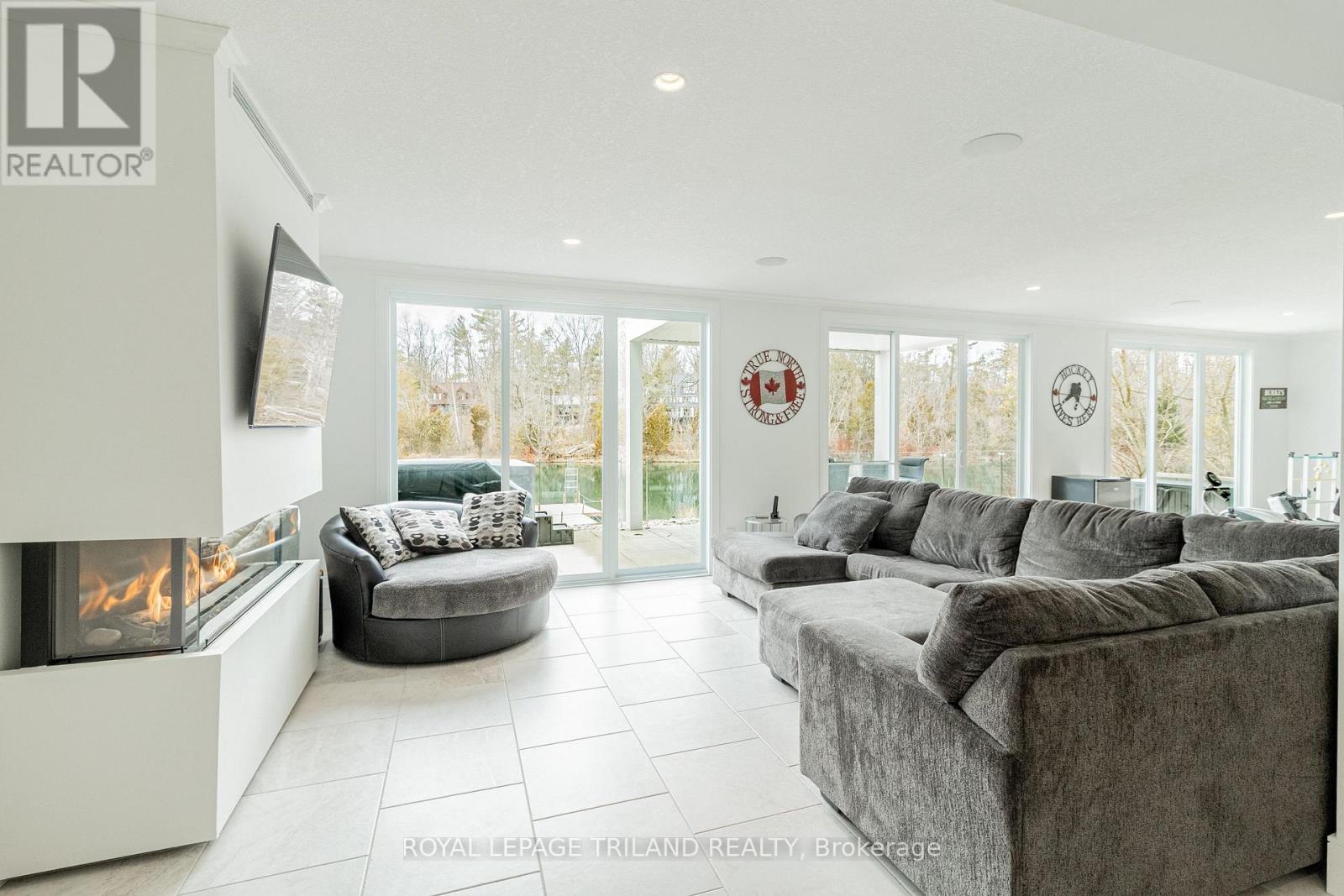 Living area with gas fireplace overlooking lake