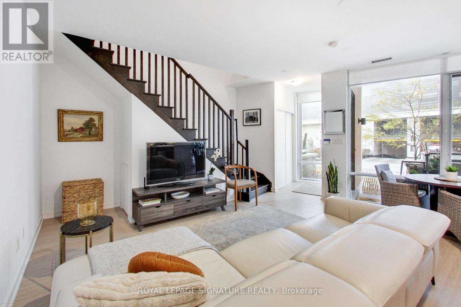 Stunning 2-storey, 2-bedroom plus den, 2-bath townhouse-style condo offering nearly 1,300sqft of bright, modern living in the heart of Liberty Village. This rare multi-level layout features a private street-level entrance, a spacious front terrace ideal for outdoor dining, and an additional upper-level balcony off the loft. The open-concept main floor boasts soaring ~10ft ceilings, wide-plank flooring, floor-to-ceiling windows, and a sleek contemporary kitchen with full-size stainless steel appliances, quartz counters, subway tile backsplash, and excellent storage. The second level includes an expansive open loft-perfect for a home office-plus two generous split-plan bedrooms. The primary suite impresses with floor-to-ceiling windows, a walk-in closet and second full closet, and easy access to a beautifully finished 4-piece bathroom with deep soaker tub. The second bedroom, enclosed with sliding glass doors, offers great privacy and storage. A second modern bathroom features a glass-enclosed walk-in shower. Full-size in-suite laundry, upgraded flooring, modern lighting, and abundant natural light throughout. 30 Ordnance Street is uniquely tucked beside acres of connected parkland, giving residents a rare sense of openness and calm while still being just steps from the vibrant heart of Liberty Village. It feels like its own private enclave, close to everything, yet pleasantly set apart. With direct access to some of the city's best walking and biking paths, it's ideal for anyone who values nature and lifestyle in equal measure. Great walking and bike path access. Steps to parks, Garrison Crossing, King West, groceries, cafes, TTC, GO Transit, and the waterfront. A rare opportunity to own a stylish multi-level home in one of Toronto's most vibrant neighbourhoods. A 91 Walk Score means 30 Ordnance is a walker's paradise where daily errands do not require a car. (42065637)