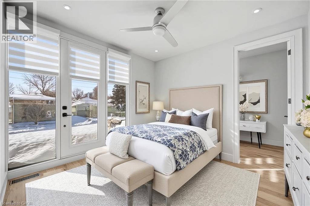 Bedroom featuring light wood finished floors, a ceiling fan, recessed lighting, and access to outside