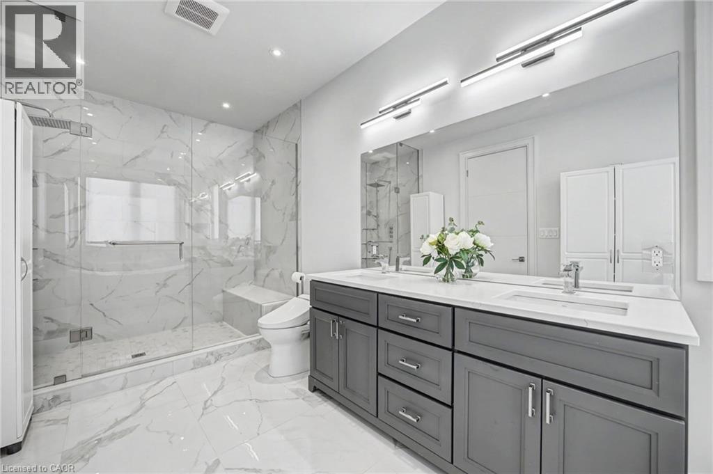 Bathroom featuring double vanity, a marble finish shower, and recessed lighting
