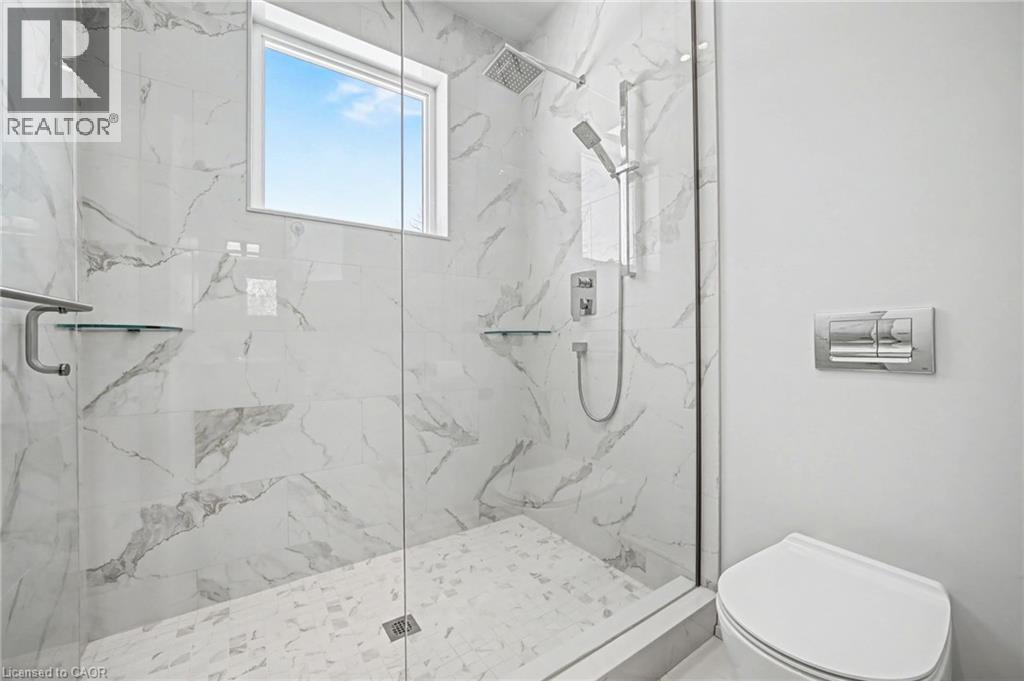 Bathroom featuring toilet and a marble finish shower