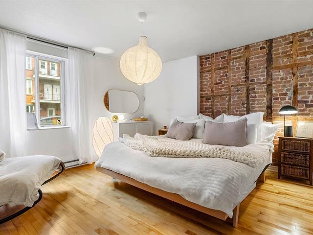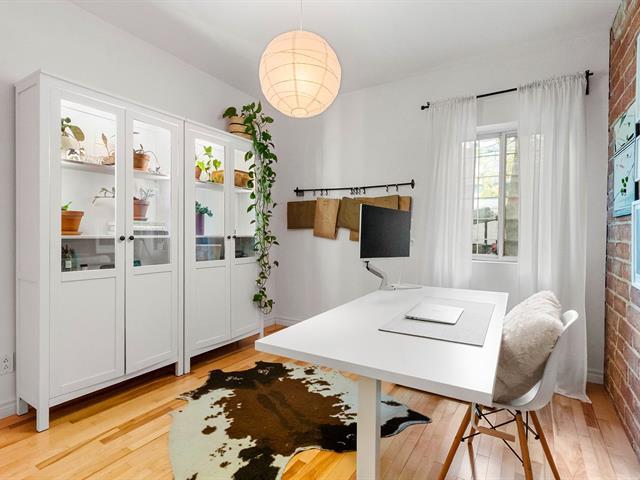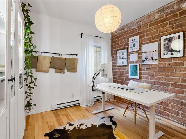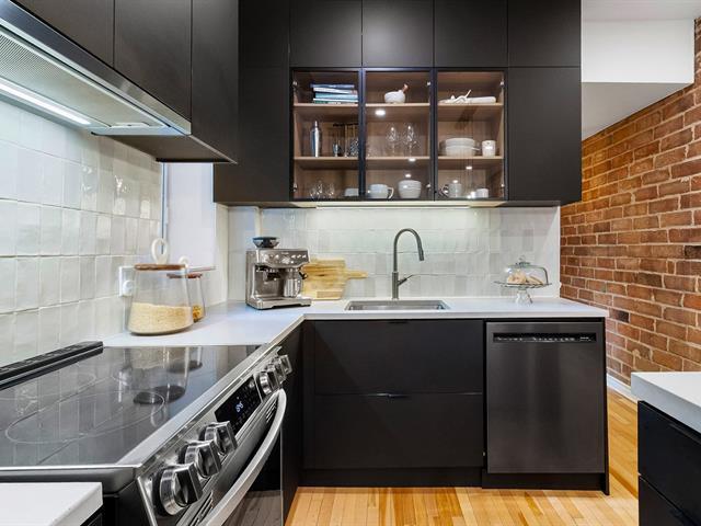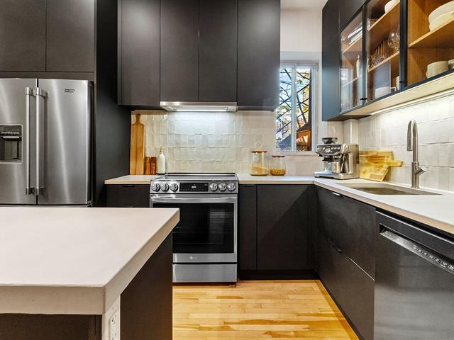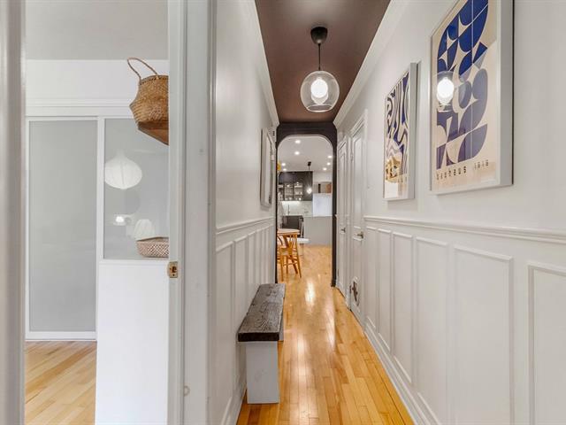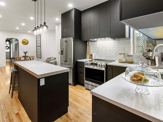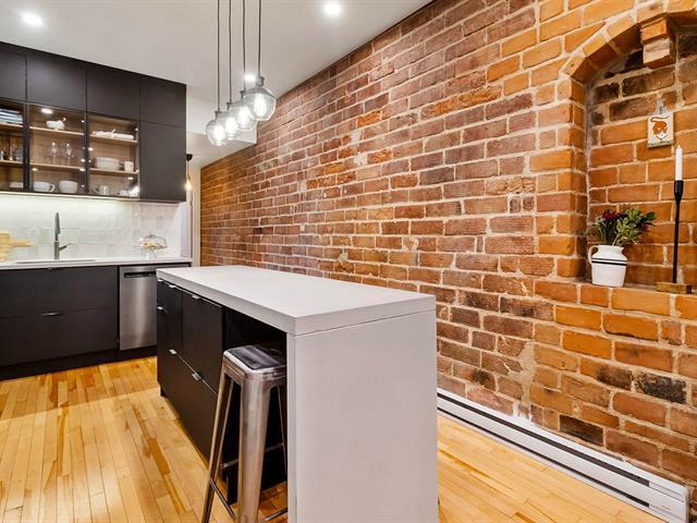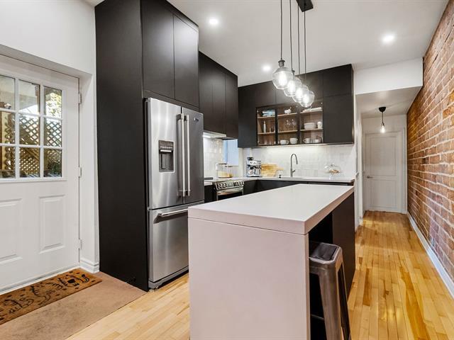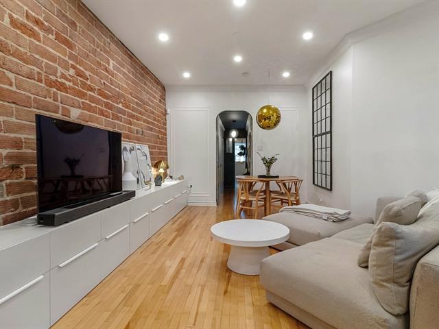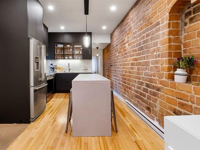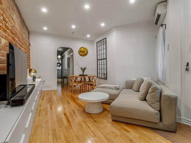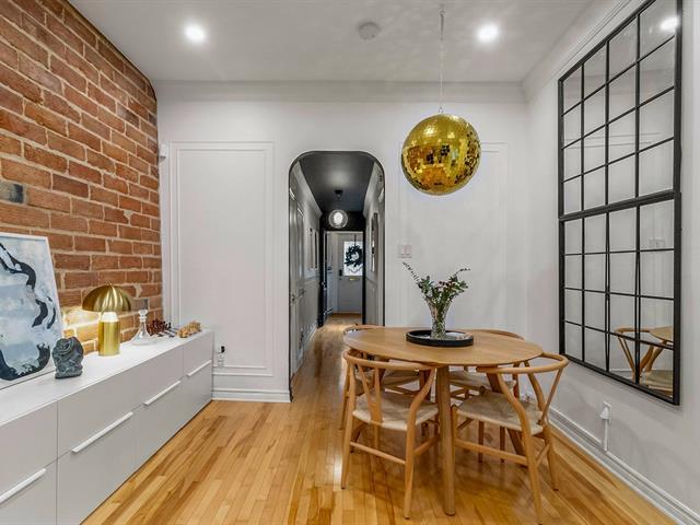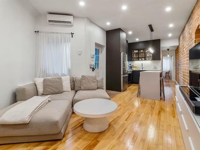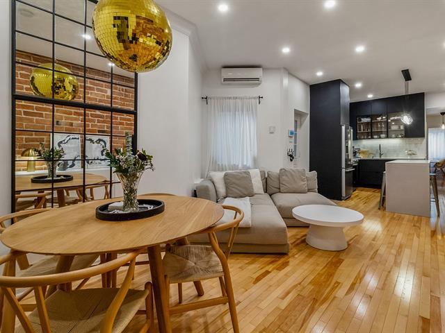 Warm and inviting unit with undeniable character. Its harmonious design blends charm and modern style, featuring hardwood floors and an exposed brick wall. The contemporary kitchen is thoughtfully designed and stands out with its clean, modern lines. The open-concept living area brings together the living room, dining room, and kitchen, creating a welcoming and well-designed space. 3 bedrooms, a rare find, along with a spacious basement offering versatile storage possibilities. A large, private landscaped yard leading to two private parking spaces. Within walking distance of services and public transportation. An urban lifestyle at its best (47349547)