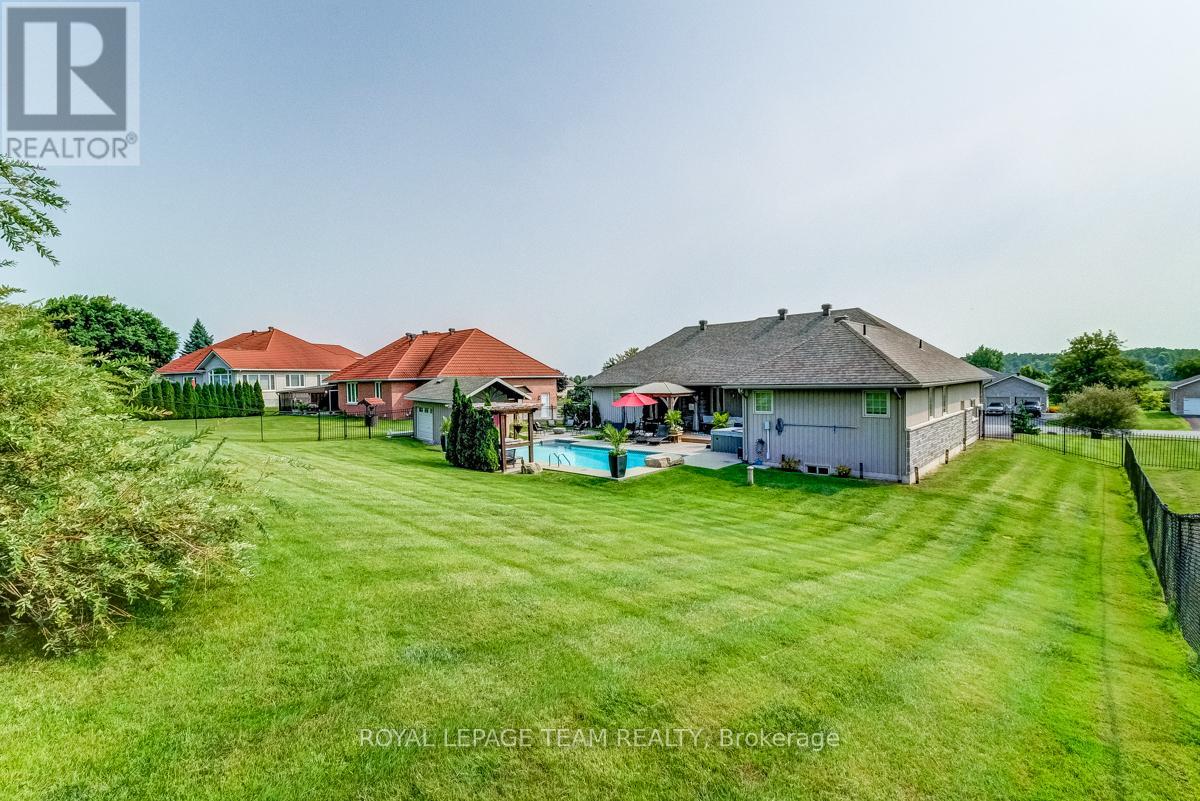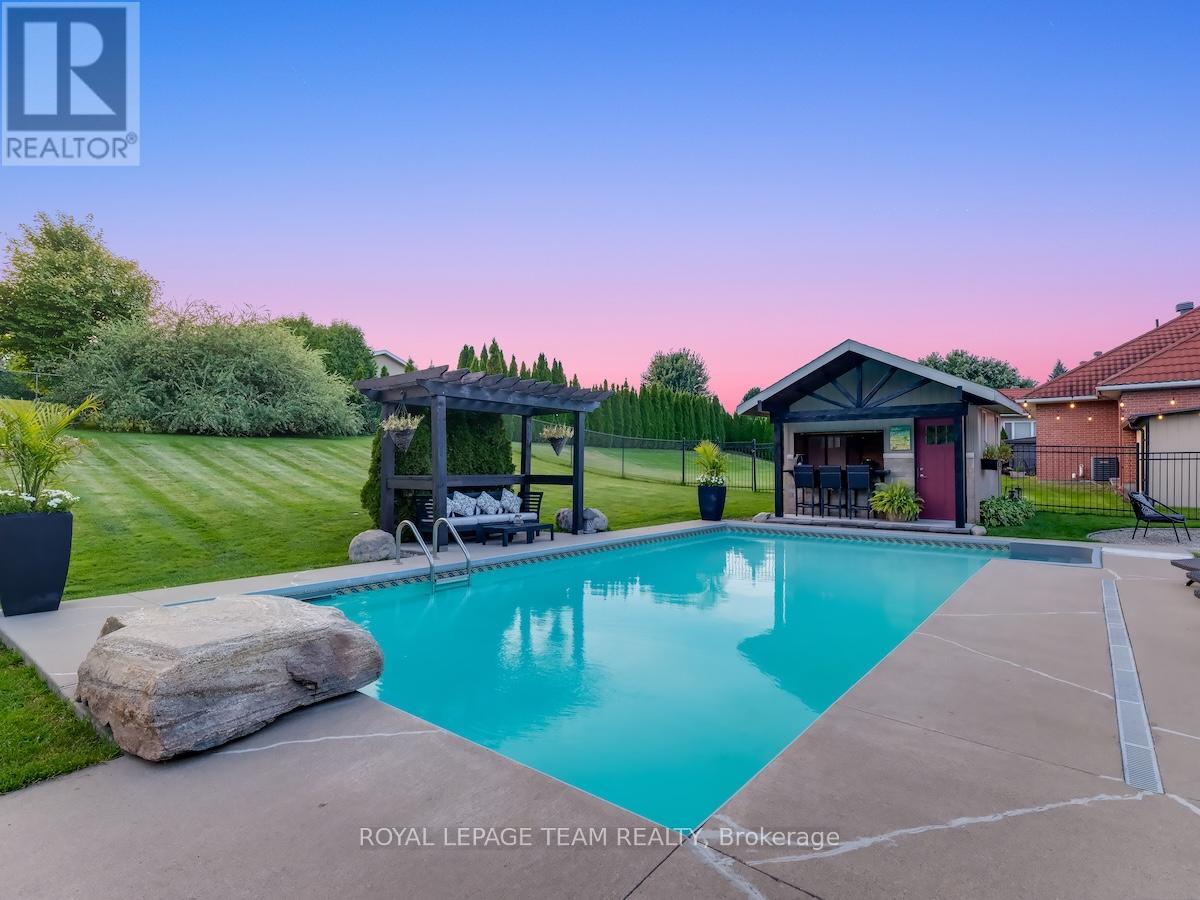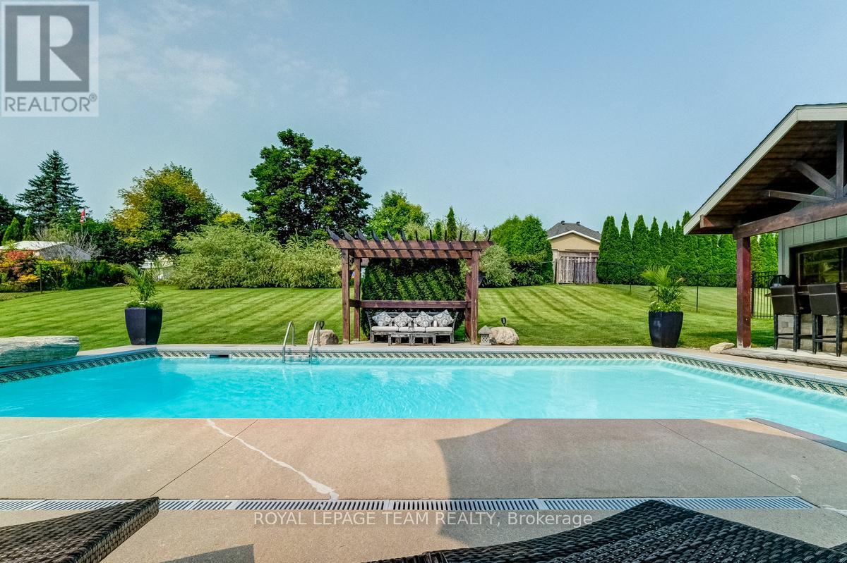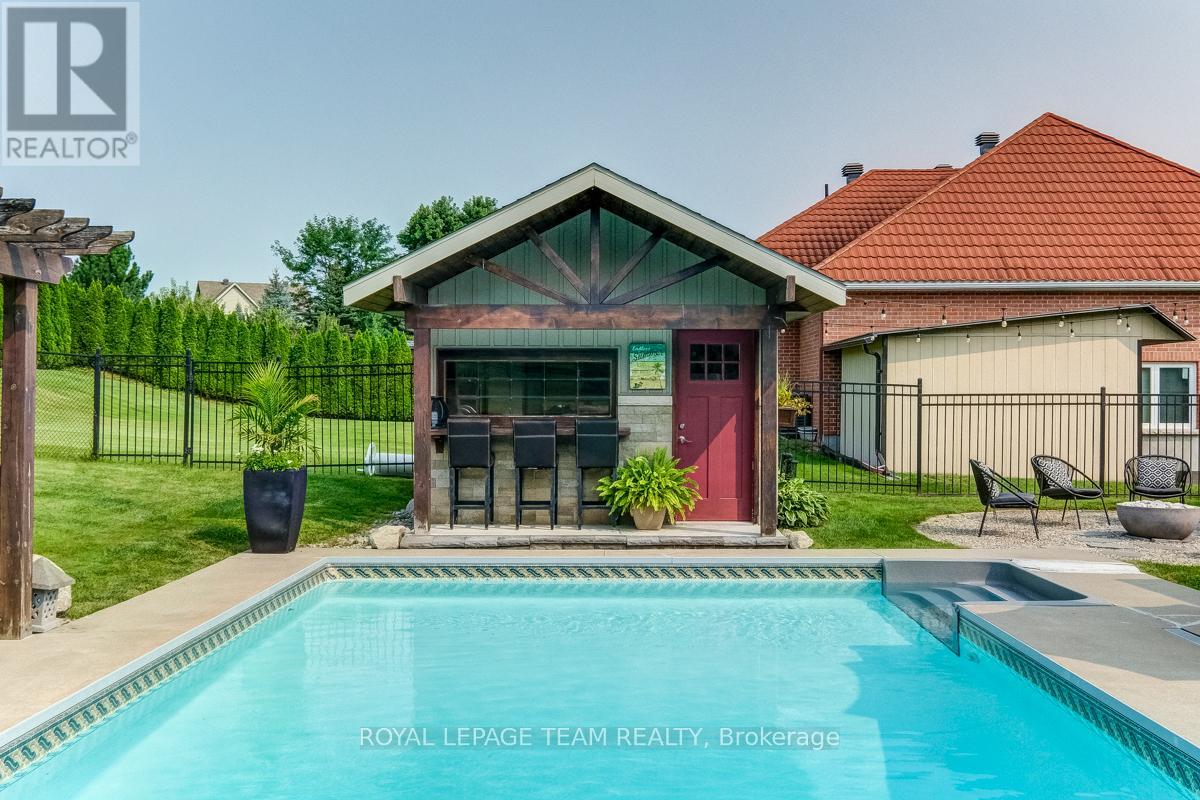 Remarkable custom bungalow makes a striking first impression with outstanding curb appeal & timeless design. Expertly crafted with quality workmanship to balance sophistication and everyday comfort. The home has been refreshed with newly refinished floors and fresh paint, giving it a bright feel throughout. Thoughtfully designed layout filled with premium features creates an atmosphere well suited to daily family life & entertaining. Central foyer connects spaces together, adjacent a front bedroom or den/office accented by custom millwork, a refined formal dining area, and an impressive great room boasting 16-foot vaulted ceilings and a cozy gas fireplace. Open concept kitchen fit for a chef offers quartz countertops, high-end cabinetry and appliances, a large peninsula with seating, and a generous eat-in area.Tucked privately away from the main living spaces, the primary suite is a peaceful retreat with a spa-inspired ensuite bath. Two additional bedrooms are located in their own wing, sharing a full bath and creating a functional, family-friendly layout. Finished laundry and mudroom off the double garage adds everyday practicality with plenty of storage & organization space. Fully finished basement elevates this home's versatility, offering a dynamic recreation area complete with a dry bar, games zone, home gym, and a unique mini rink with skateable tiles. With room for potential additional bedrooms and a bathroom already roughed in, the lower level is ready to adapt to changing family needs. Outdoors, the backyard is nothing short of a private resort. Designed for year-round enjoyment, it features a 16x32 heated saltwater pool with pool house & bar, a relaxing hot tub, fire pit, a large partially covered deck, and an expansive lawn ideal for children and pets. Set in the family-friendly community of North Gower, home is surrounded by parks, golf courses, excellent schools, with shopping and dining minutes away. Quick access to Highway 416, Kemptville & Barrhaven. (42069479)
