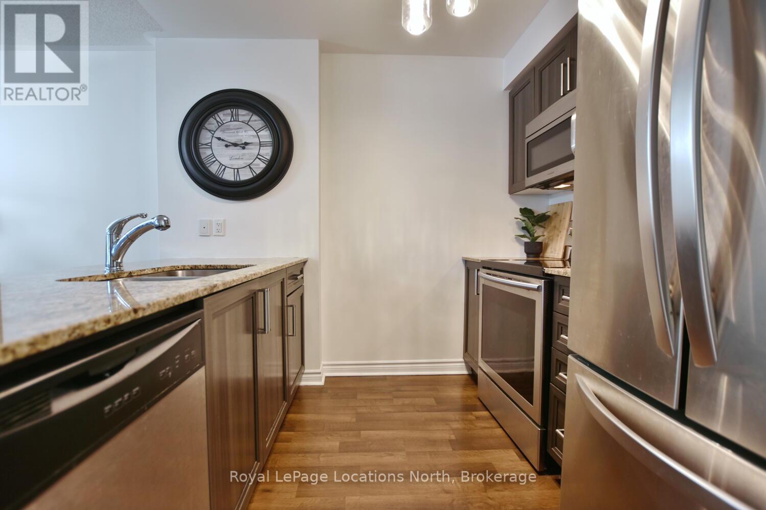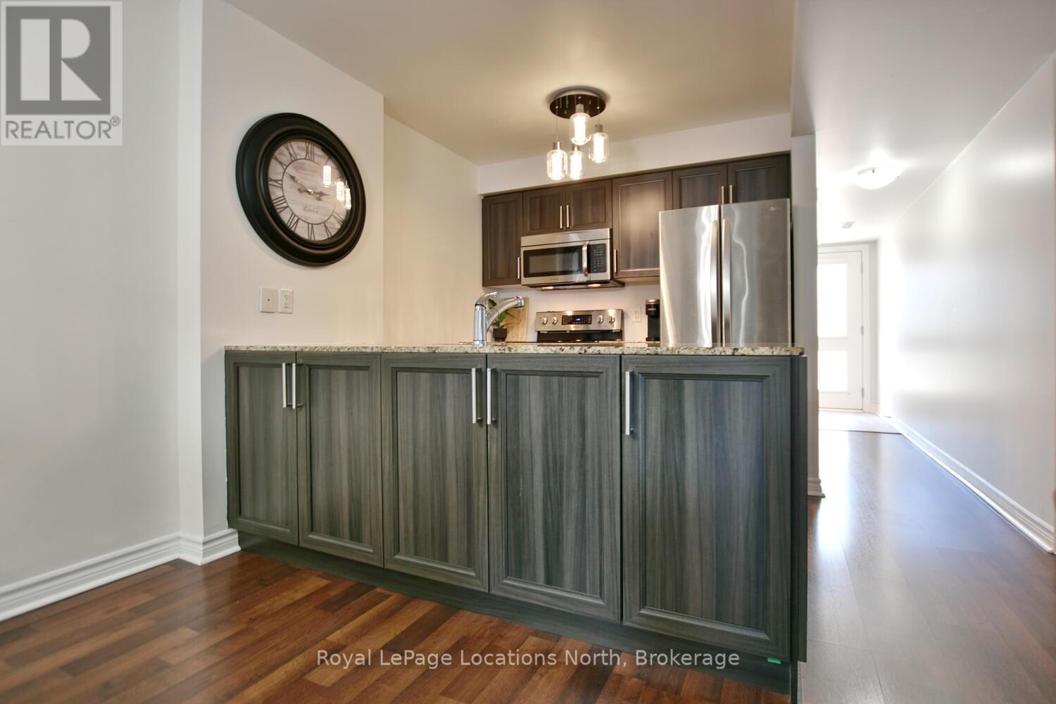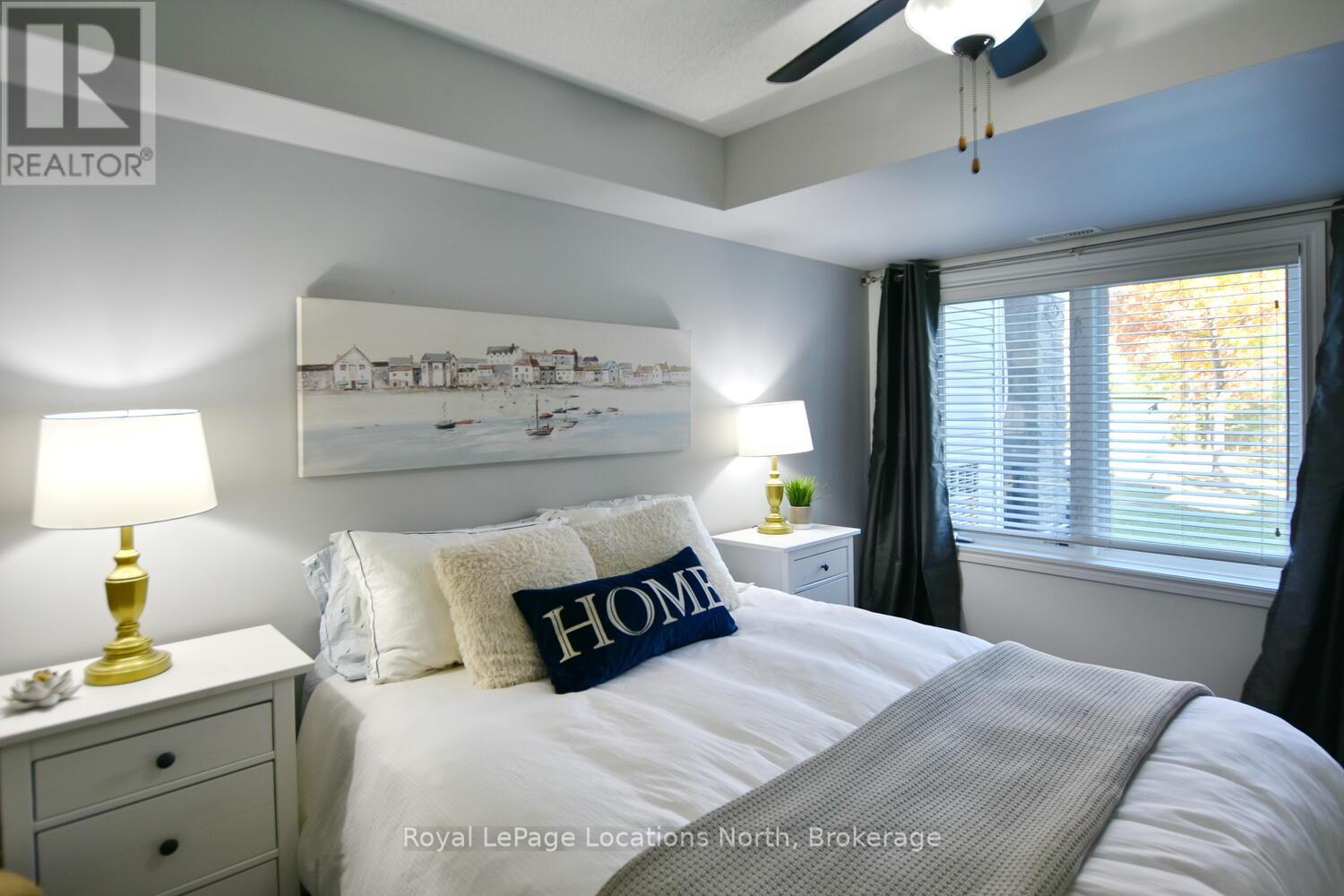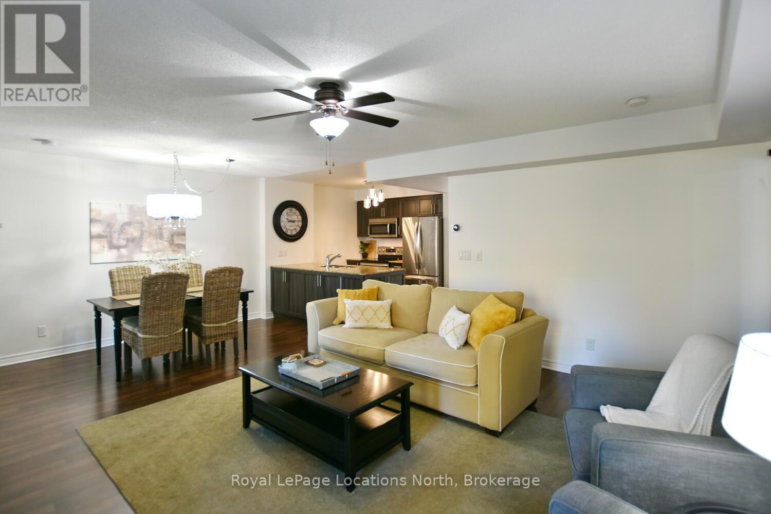 Welcome to your perfect four-season retreat in Collingwood! This modern, open-concept 2-bedroom, 2-bath condo offers effortless main-floor living with no stairs-ideal for those seeking convenience, comfort, and a carefree lifestyle. Thoughtfully designed, this popular floor plan features neutral, timeless finishes and a bright, airy layout that flows seamlessly from the kitchen through to the living and dining areas. The inviting great room includes a cozy gas fireplace for those crisp winter evenings and walkout access to a private patio-perfect for morning coffee or après-ski relaxation. The spacious kitchen offers plenty of counter space and open sightlines that make entertaining easy. Both bedrooms are a good size, with the primary suite featuring an ensuite bath and closet space. Enjoy the convenience of an in-suite laundry room and an oversized locker ideal for bikes, skis, or outdoor equipment. Set in one of Collingwood's most desirable condo communities, this property is designed for year-round enjoyment. In summer, take advantage of the heated outdoor saltwater pool, scenic walking trails, and quick access to Georgian Bay just across the road. In winter, you're only minutes from Blue Mountain's world-class ski slopes, cozy cafés, and boutique shopping in downtown Collingwood. Additional amenities include an exercise room, kayak storage, and plenty of visitor parking. With affordable condo fees that include water and sewer, this low-maintenance home offers unbeatable value for those seeking a weekend getaway, full-time residence, or smart investment in a thriving four-season community. Experience the best of Collingwood living-where golf, skiing, trails, and waterfront adventures are all at your doorstep. Move in and start enjoying the relaxed, active lifestyle you've been dreaming of! (42069817)