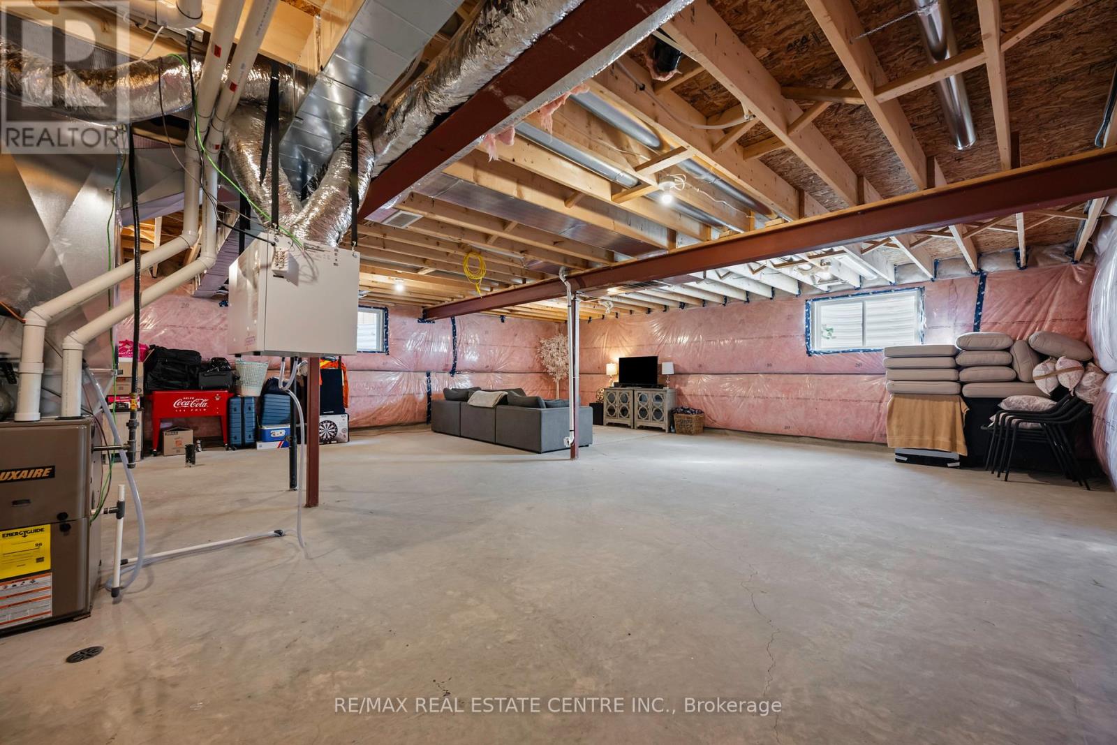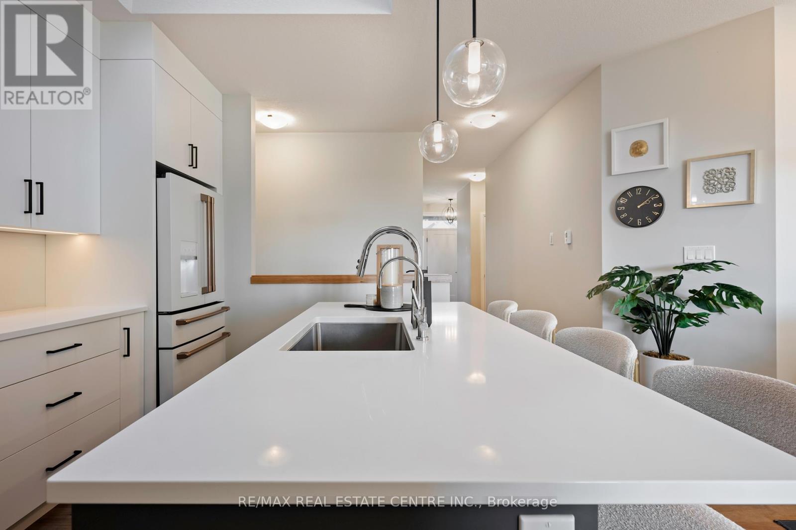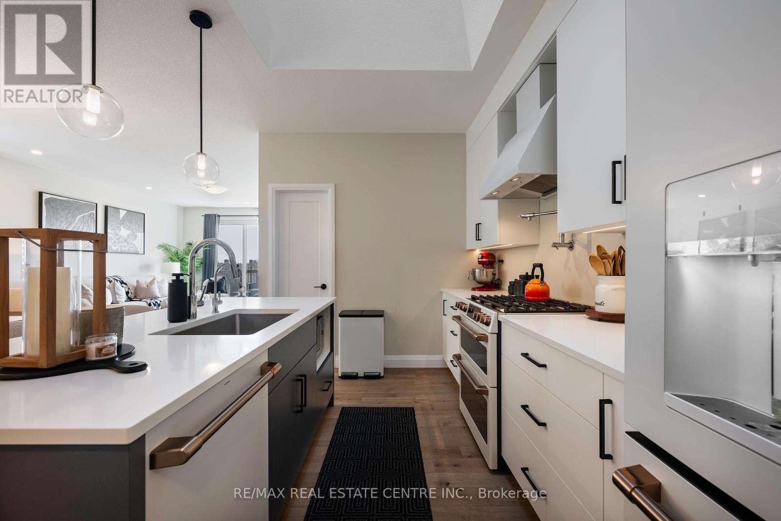 Welcome to Mayberry Hill, one of Grand Valley's most welcoming communities by Thomasfield Homes. This recently built Paisley model bungalow sits on a 38-foot lot and blends clean, classic style with a layout that simply works. Inside, the home feels open and bright thanks to large windows and a smart floor plan that makes the most of every inch. The kitchen is a standout-crisp white cabinetry, a contrasting island, under-cabinet lighting, and a pantry for everyday storage. Matte white GE Cafe appliances with brushed gold accents, including a 30-inch gas range with double oven, counter-depth French-door refrigerator, and ultra-quiet dishwasher, tie everything together with a premium finish. Timeless white quartz counters and soft lighting add to the clean, inviting feel. The main living area flows naturally to the backyard deck-perfect for morning coffee or quiet evenings outdoors. Both bedrooms are spacious, with the primary offering a walk-in closet and private ensuite featuring double vanities and upgraded tile. The main floor laundry with LG WashTower keeps chores simple and efficient. Engineered hardwood and ceramic floors, upgraded fixtures, quartz counters, and thoughtful lighting bring an elevated touch throughout. The large, open basement with big windows is ready for your ideas-whether you need more living space, a gym, or a guest suite. With its welcoming front porch, bright interiors, and functional design, this home delivers easy living in one of Grand Valley's most loved neighbourhoods. Perfect for first-time buyers or those looking to downsize without compromise. (42070001)