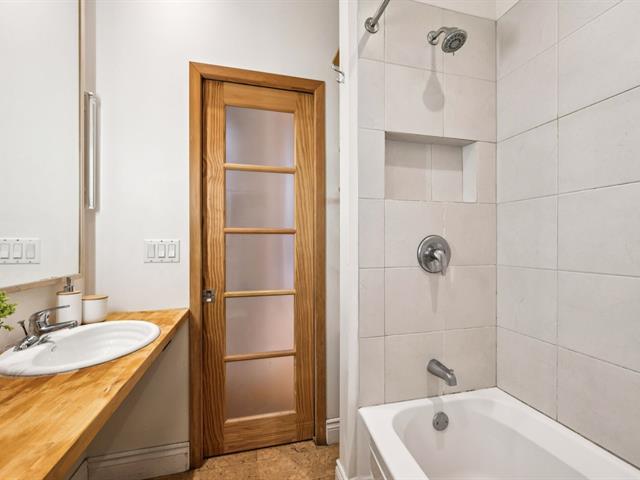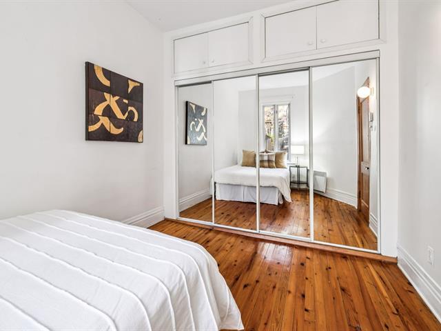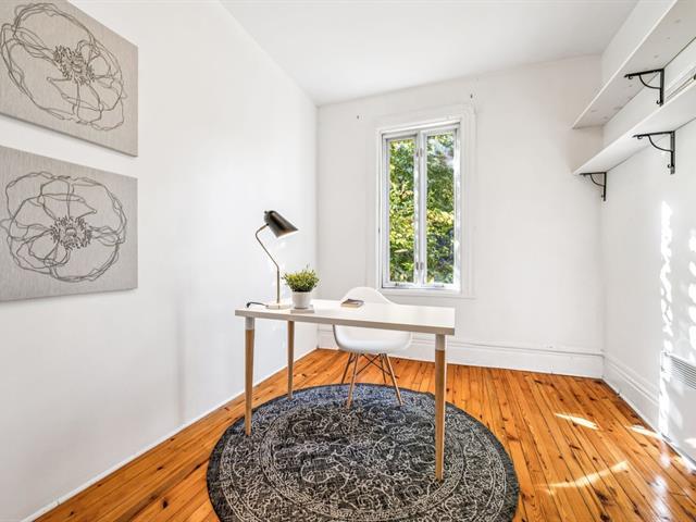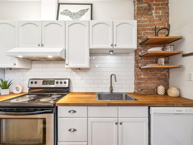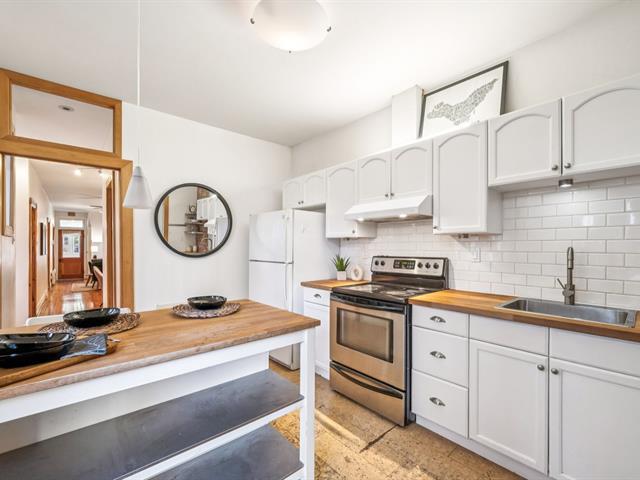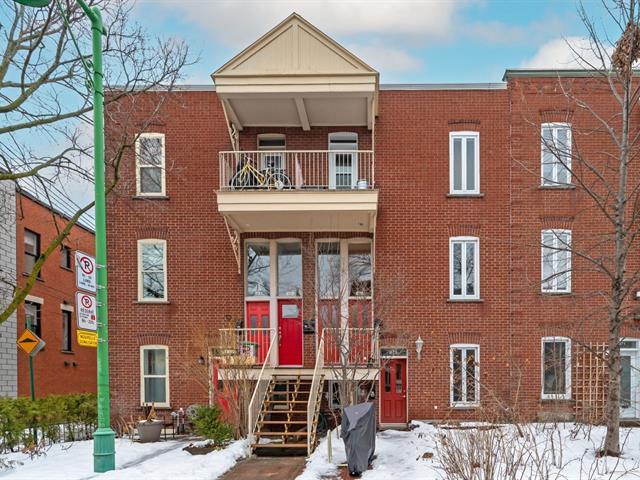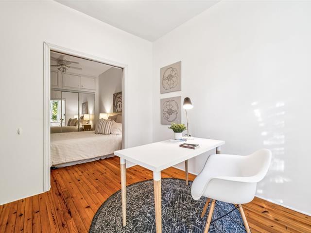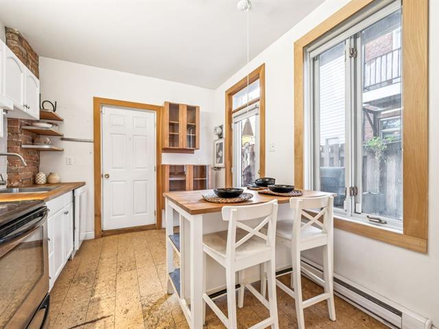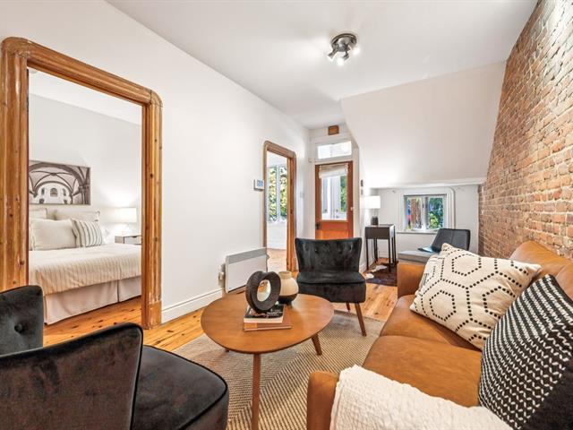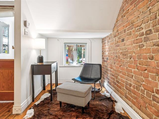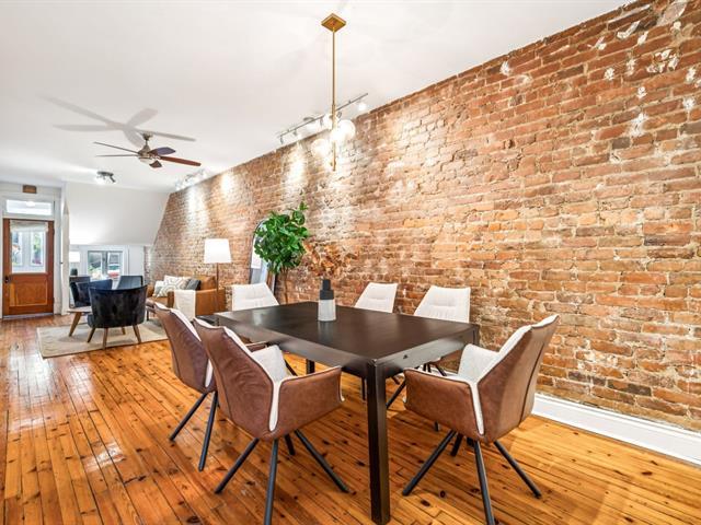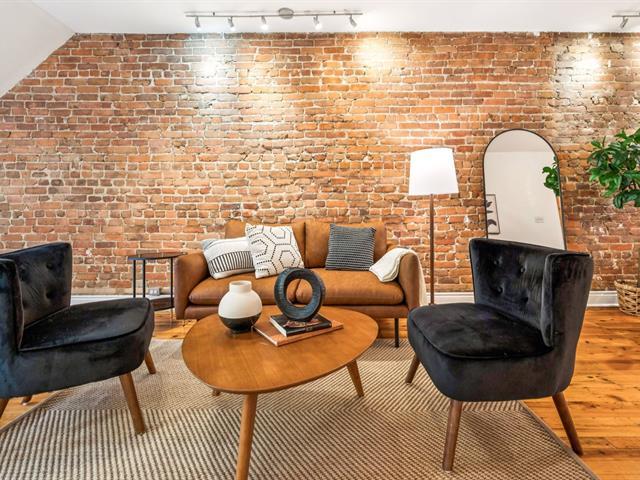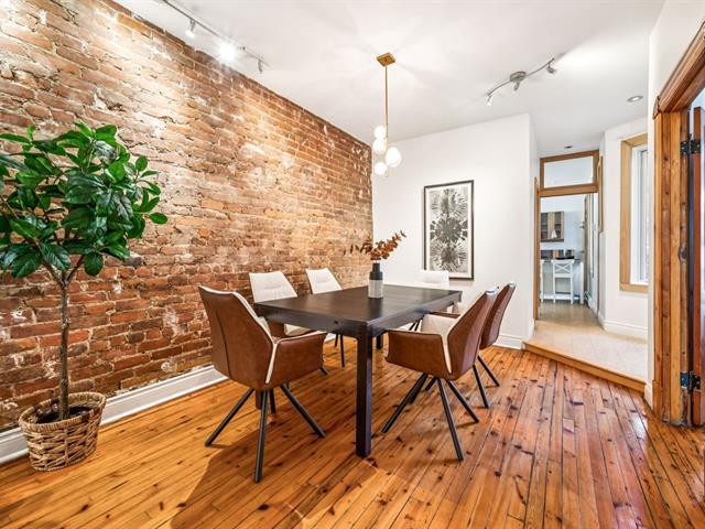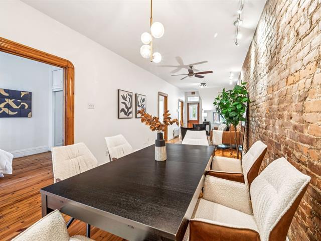 Ground floor unit located just steps from the metro, Kennedy Park (with pool), Collège Stanislas, and the new Université de Montréal campus. Featuring a kitchen adjacent to a private terrace, perfect for outdoor dining. A spacious open-concept living area combines the dining room and living room, enhanced by an exposed brick wall that adds charm and character. The primary bedroom is located at the back for added privacy, while a second double bedroom with office space and sliding glass door offers versatility and comfort. A second front terrace and a garage complete this exceptional living space. (53696318)