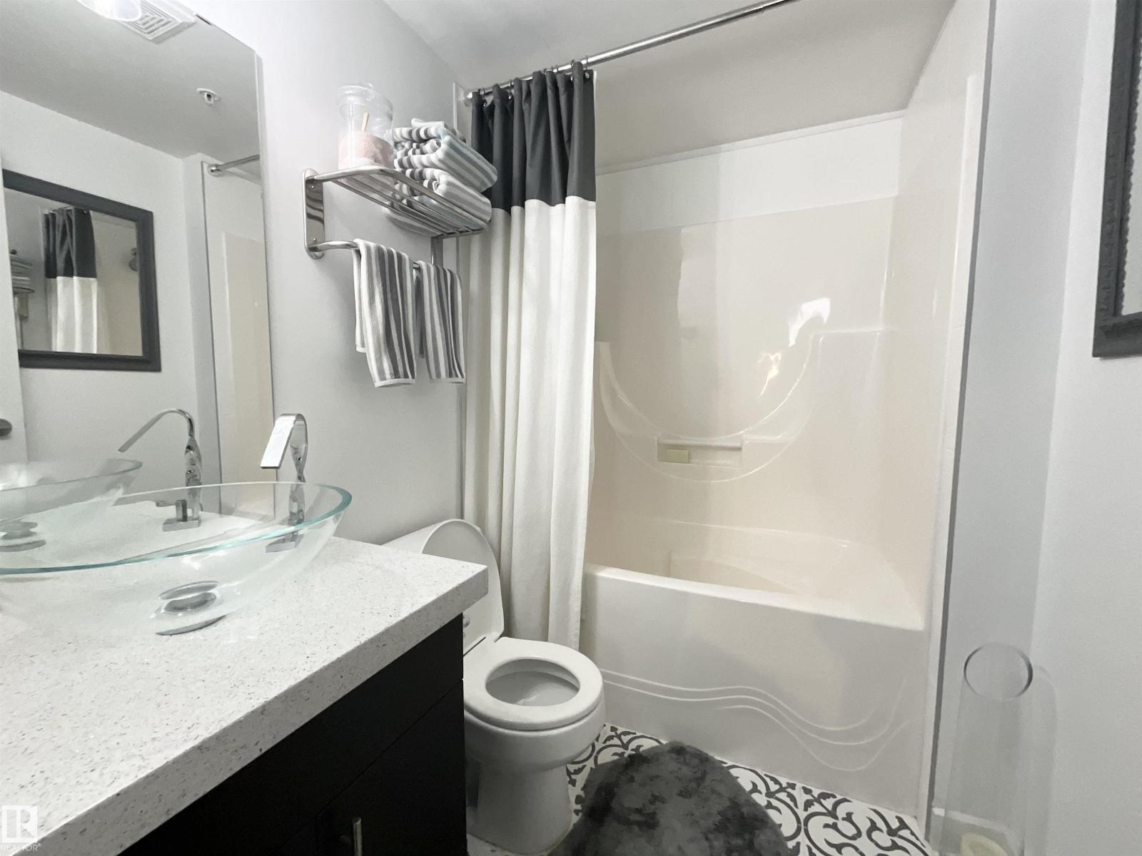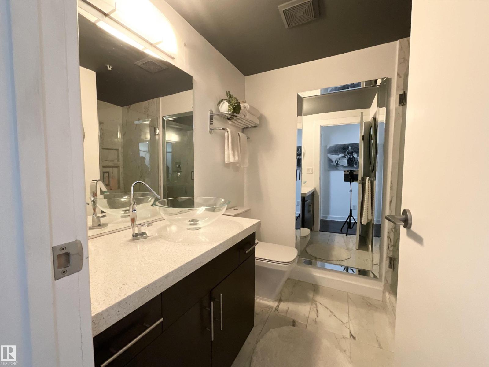 Experience downtown living at its absolute finest in this gorgeous high rise condo in the heart of Edmonton's city center. The pride of ownership is evident as this unit has been impeccably maintained and upgraded since it was constructed. The kitchen is open and bright with granite countertops and stainless steel appliances. Convenient barstool seating off the kitchen counter, with plenty of space for an additional dining room table. The main 3-piece washroom contains quartz countertops, marble flooring, and a spacious standup shower. The primary bedroom contains a sizeable closet, and an ensuite with a full bath and upgraded vanity. The centerpiece of the living room is a stunning, built-in electric fireplace, perfect to cozy up to around the holidays. Or, relax outside on the enormous balcony with breathtaking views of the city and skyline. Located steps away from shopping, grocery stores, Rogers Place, ICE District, and the LRT station. Titled, indoor parking to keep the vehicle warm and free of snow. (33790633)