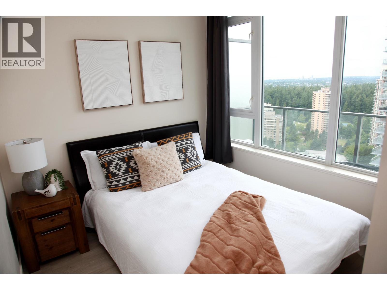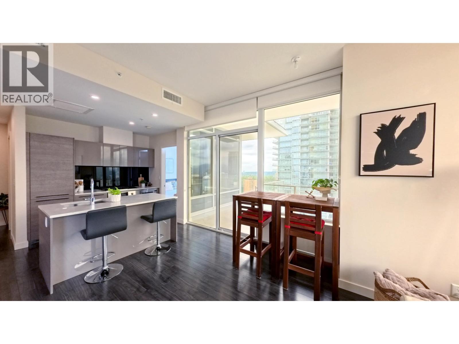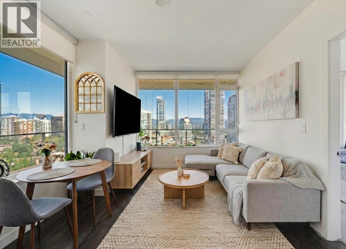 Welcome to Gold House North Tower. This elegant home features close to 10´ ceilings, wide-plank laminate flooring, and a wraparound balcony of almost 350 square ft with panoramic views of the city and mountains. Thoughtfully designed with opposite-side bedrooms for added privacy, the unit showcases custom Italian Armony Cucine cabinetry with soft-close hardware, premium Bosch appliances, and state-of-the-art central air conditioning and heating. Enjoy over 40,000 square ft of resort-style amenities including a 24-hour concierge, fitness and yoga studio, sound-insulated study/music rooms, social lounges, and expansive outdoor terraces. Steps to Metrotown SkyTrain, shopping, dining, library, and Central Park. Includes 1 parking (option to rent a 2nd) and 1 storage locker. Open House Feb 7-8 @ 2-4pm! (32405051)