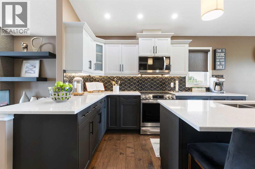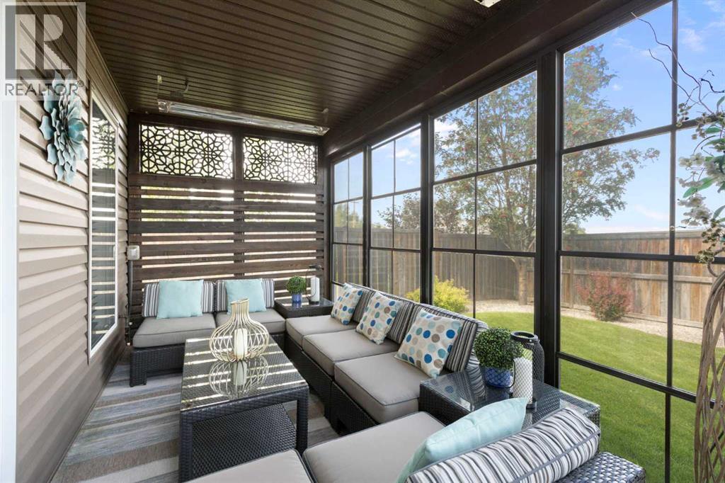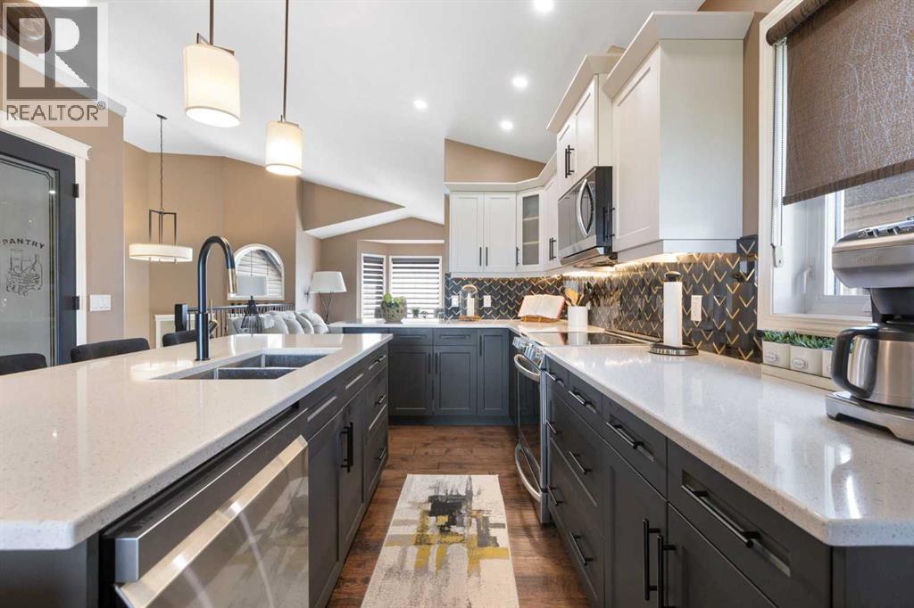 Exquisite 5-bedroom, three bathroom walkout! Welcome to a home where elegance meets comfort, and every detail has been thoughtfully curated. Perfectly positioned with no neighbors behind, this stunning bi-level offers a serene backdrop of wide open space and a long list of luxurious upgrades. From the moment you arrive, you’ll be charmed by the freshly landscaped yard, the new roof and eavestroughs, the new modern garage door and the oversized garage. Inside, natural light floods the open-concept main floor, where rich quartz counters sparkle against stainless steel appliances, and soft-close cabinetry with custom pullout drawers adds both refinement and function. Gather by the sleek electric fireplace or step onto the raised composite deck, adorned with glass railings and a gas line, to savor golden summer evenings and uninterrupted views. The primary retreat feels like a sanctuary, crowned with soaring 12 ft vaulted ceilings and a spa-inspired ensuite that invites you to unwind in luxury. Two additional bedrooms and a full bath complete the main level with both warmth and style. The second bedroom has a secret storage area behind the bookcase, designed for a play area, extra bed space or storage. The fully finished walkout basement is designed for both relaxation and celebration. Heated floors, a cozy electric fireplace, and a welcoming rec room with wet bar and pool table set the stage. Step into the luminous three-season sunroom with infrared heating and enjoy the beauty of every season while overlooking your private, fully landscaped backyard. Two spacious bedrooms and full bath complete the lower level. Every comfort has been considered—central A/C, central vac, and a brand-new 75-gallon hot water tank are among the many thoughtful upgrades. With its timeless finishings, gracious flow, and an idyllic setting, this Strathmore home is more than a residence—it’s a lifestyle. (31602250)