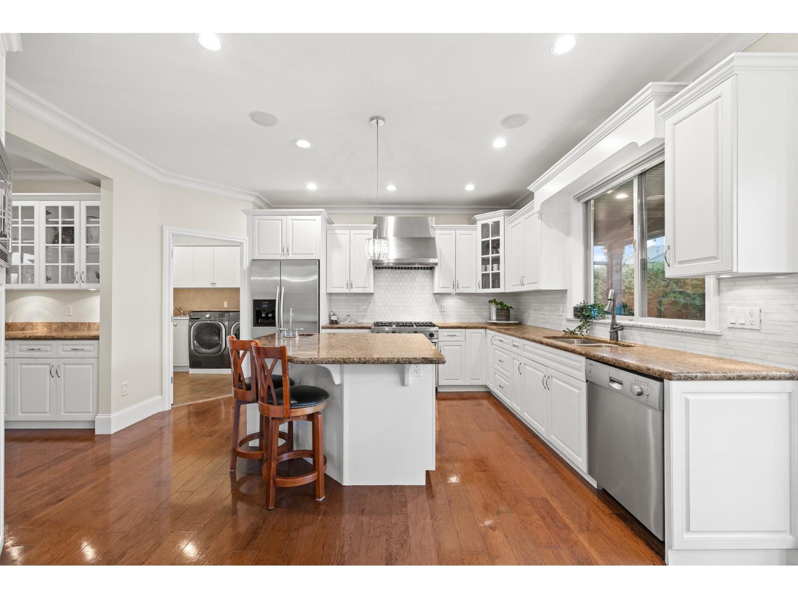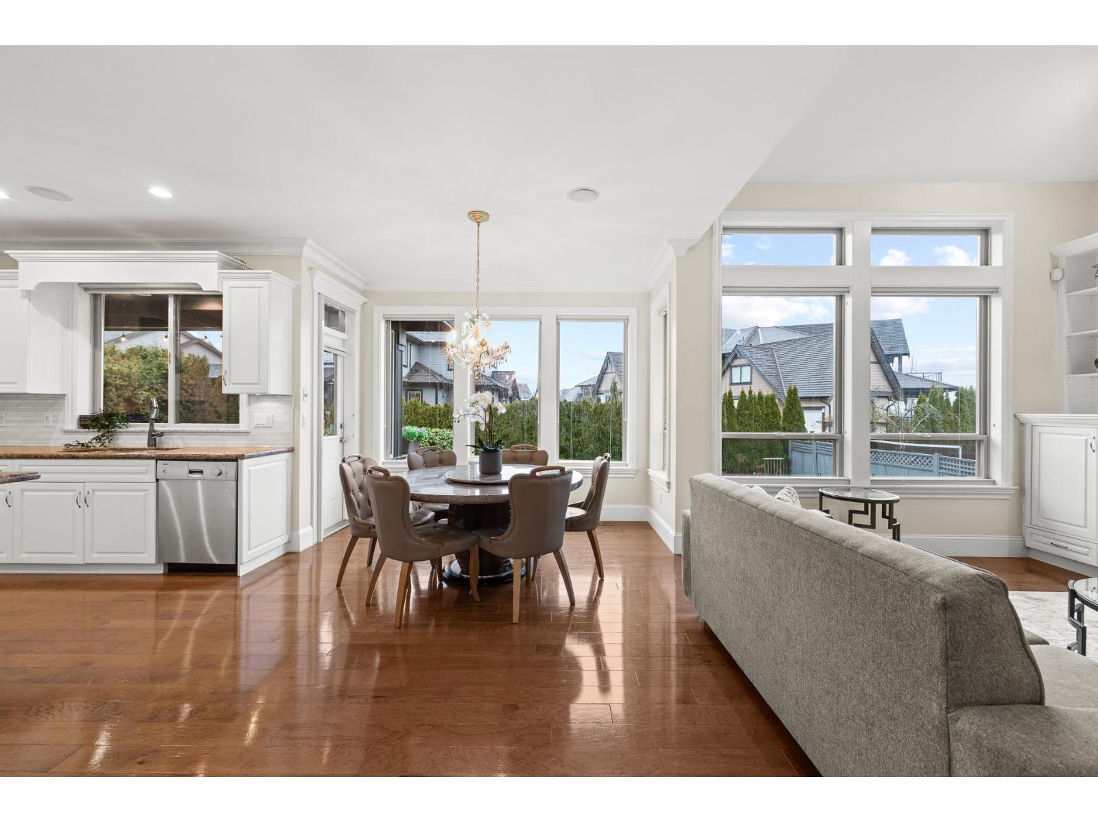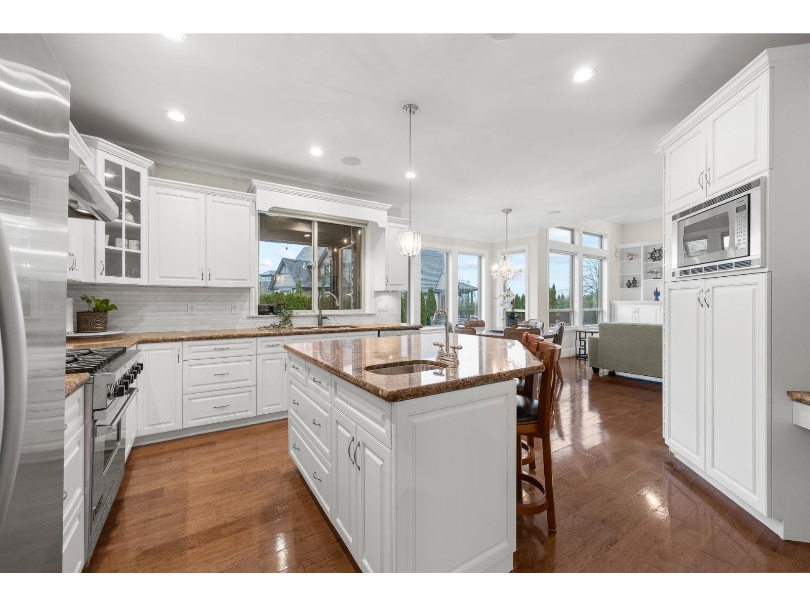 Custom Raymond Bonter-designed home in prestigious Morgan Creek, offering 5,800+ sqft on a 10,017 sqft lot with northeast-facing backyard and mountain views. Elegant 2-storey layout w/ vaulted ceilings, formal living & dining, gourmet kitchen with granite counters, stainless steel appliances, large island, & butler's pantry. Family room with built-ins & gas fireplace, plus main-floor den/office. Upper level features 4 spacious bedrooms, each with a full ensuite. Lower level includes 2 rental suites - 3-bedroom suite & a studio suite. Features air conditioning, built-in vacuum, security system, double garage with gated breezeway, & in-ground sprinklers. Prime location near Morgan Creek Golf Course, Southridge Private School, shopping, & amenities. (32405806)