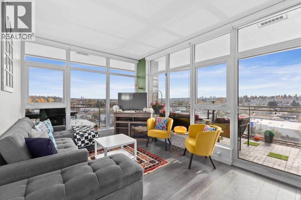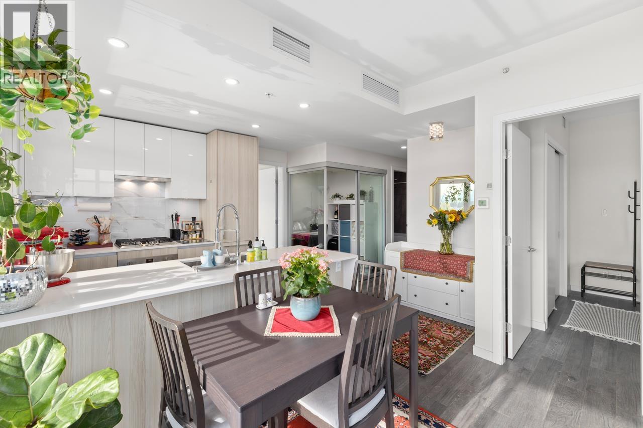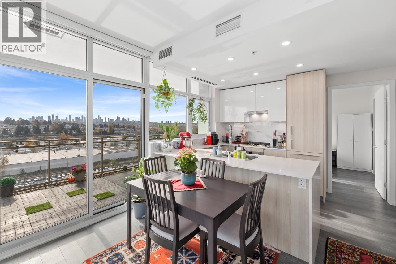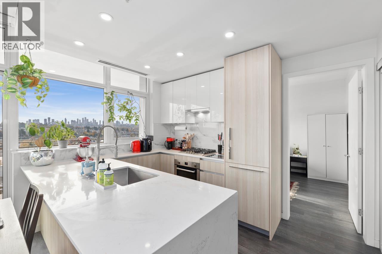 Welcome to Etoile, where modern elegance meets effortless Brentwood living. This rare 2 bed+ den, 2 bath corner home invites you to live both indoors and out, featuring 879 sqft of refined interior space and an extraordinary 377 sqft wrap-around balcony. Soaring ceilings and wall-to-wall windows frame sweeping city and mountain views, while a sleek kitchen with Bosch appliances and a waterfall island anchors the home. The den offers the perfect work-from-home retreat. Unwind in spa-inspired bathrooms or entertain under the stars on your heated terrace. Resort-style amenities include a fitness centre, steam rooms, outdoor pool, hot tub, and concierge. Steps to SkyTrain, Brentwood, parks, cafes, restaurants, and Whole Foods. Urban living, elevated. (32406051)