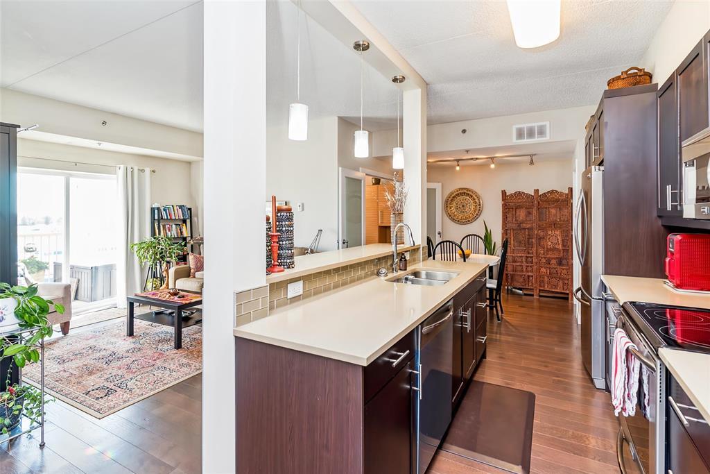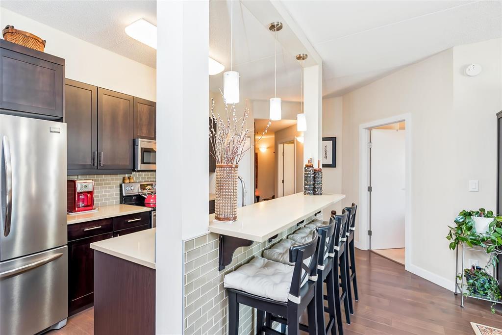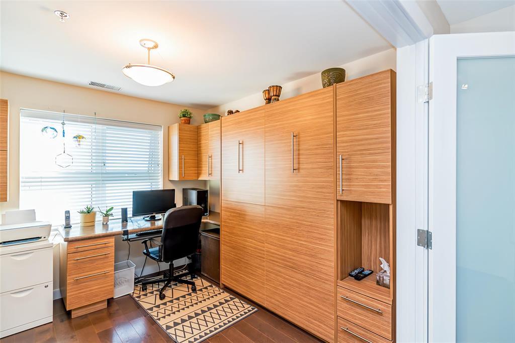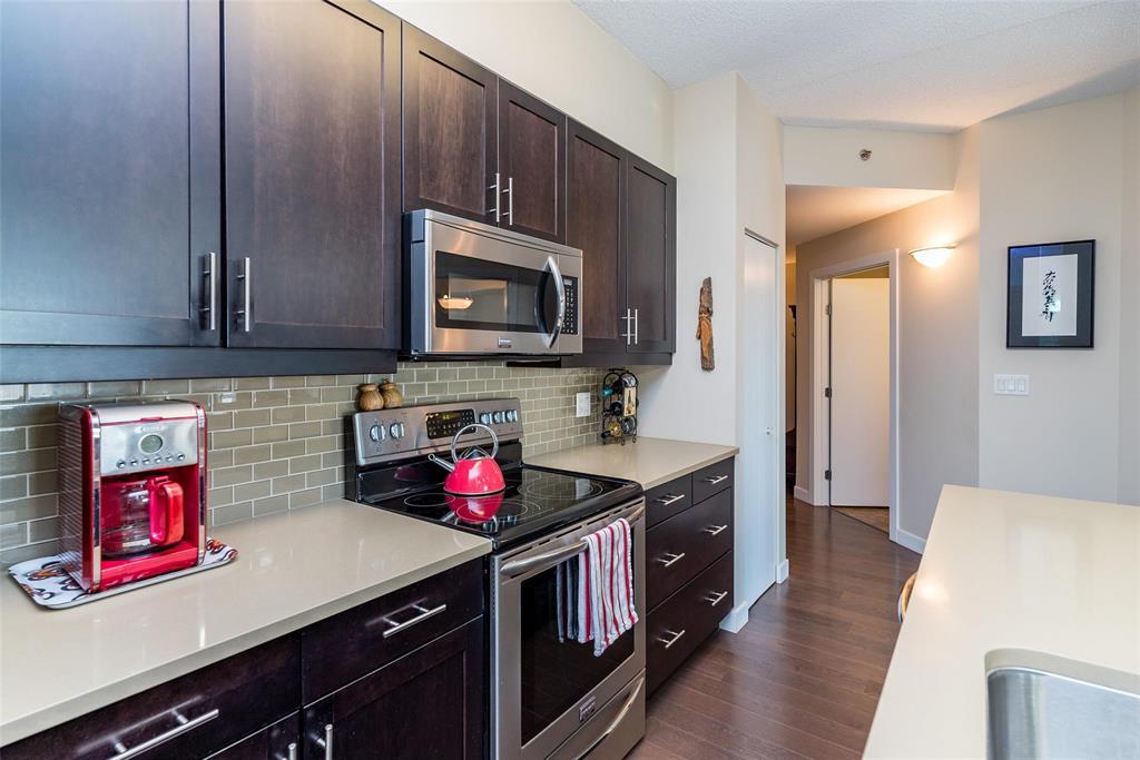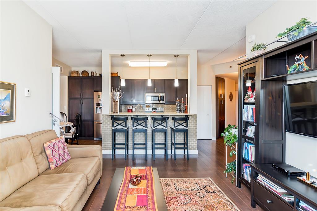 2F//Winnipeg/A beautifully maintained 907 sqft 1-bedroom plus den condo at Oxbow on the Seine, offering 2 parking spots, an open-concept layout, espresso kitchen with quartz counters, a sunny south-facing exposure, superior concrete & steel construction, 2 parking stalls and a prime location steps from Seine River trails. The espresso-toned kitchen features quartz countertops, subway tile backsplash, stainless steel appliances, and a generous breakfast bar with seating for four, perfect for casual meals or entertaining. Hardwood floors, high ceilings, and large windows enhance the airy feel throughout. The primary bedroom is impressively spacious and enjoys sunny south-facing views, while the versatile den, bathed in natural light, is thoughtfully outfitted with a built-in Murphy bed and desk, making it ideal for guests, hobbies, or a home office. The bathroom is well designed, and the unit is complete with a dedicated laundry room offering additional storage + additional storage unit on your floor! Enjoy scenic walking paths, mature trees and frequent wildlife sightings along the Seine River - immediately outside your door. All of this while still enjoying the ease of low-maintenance condo living. Come and see! (231922164)