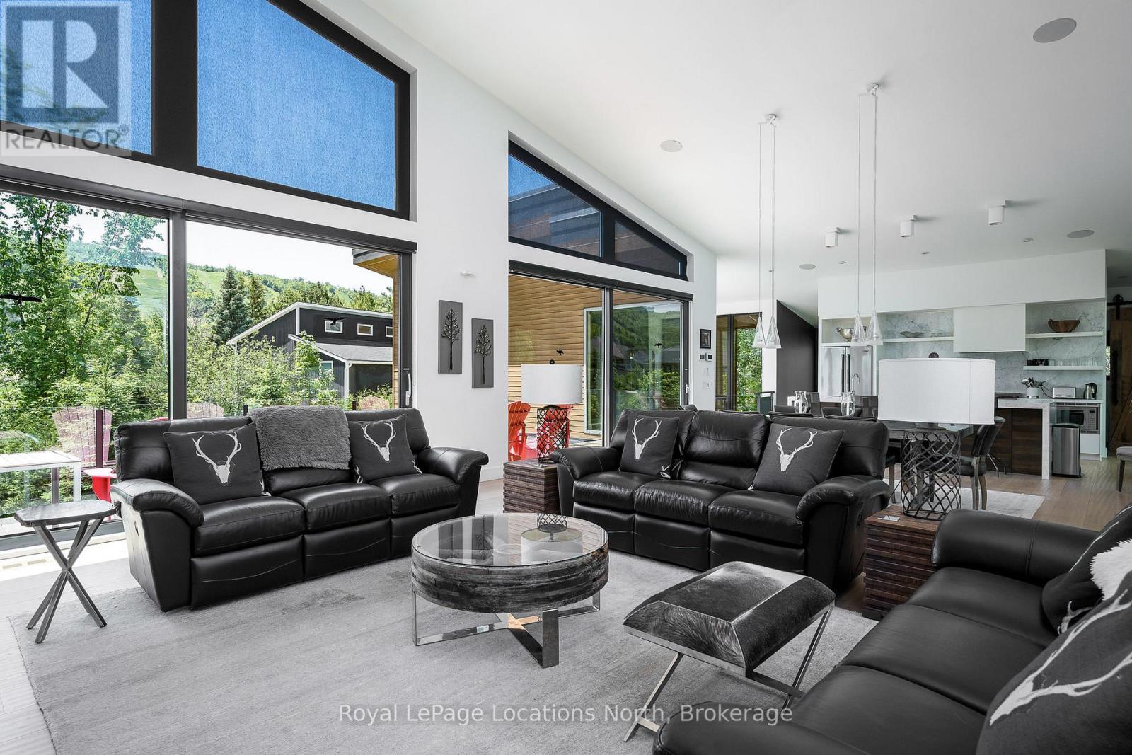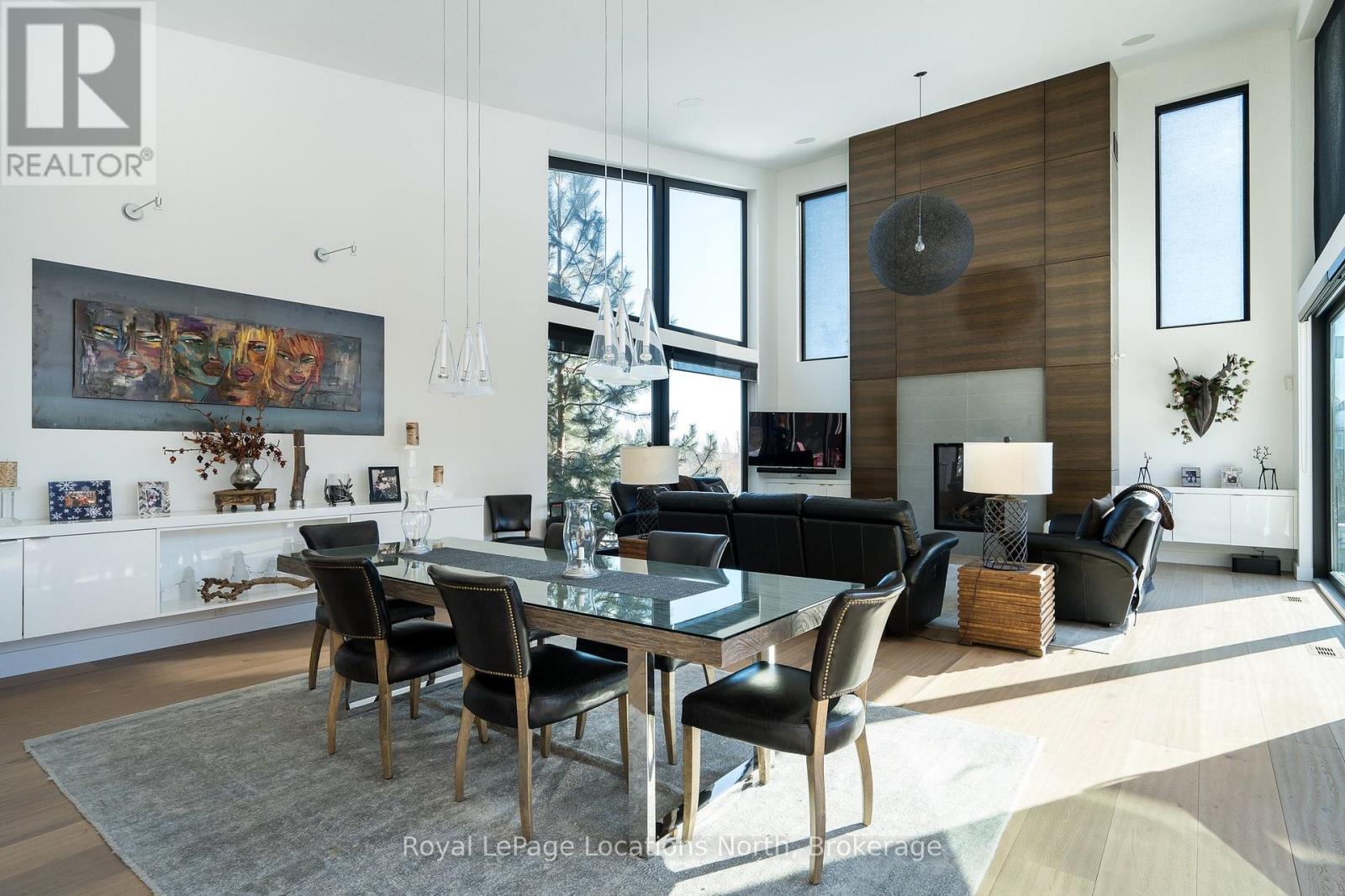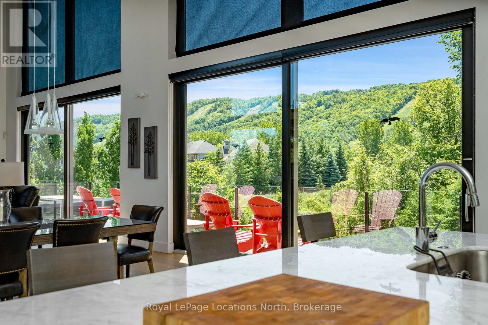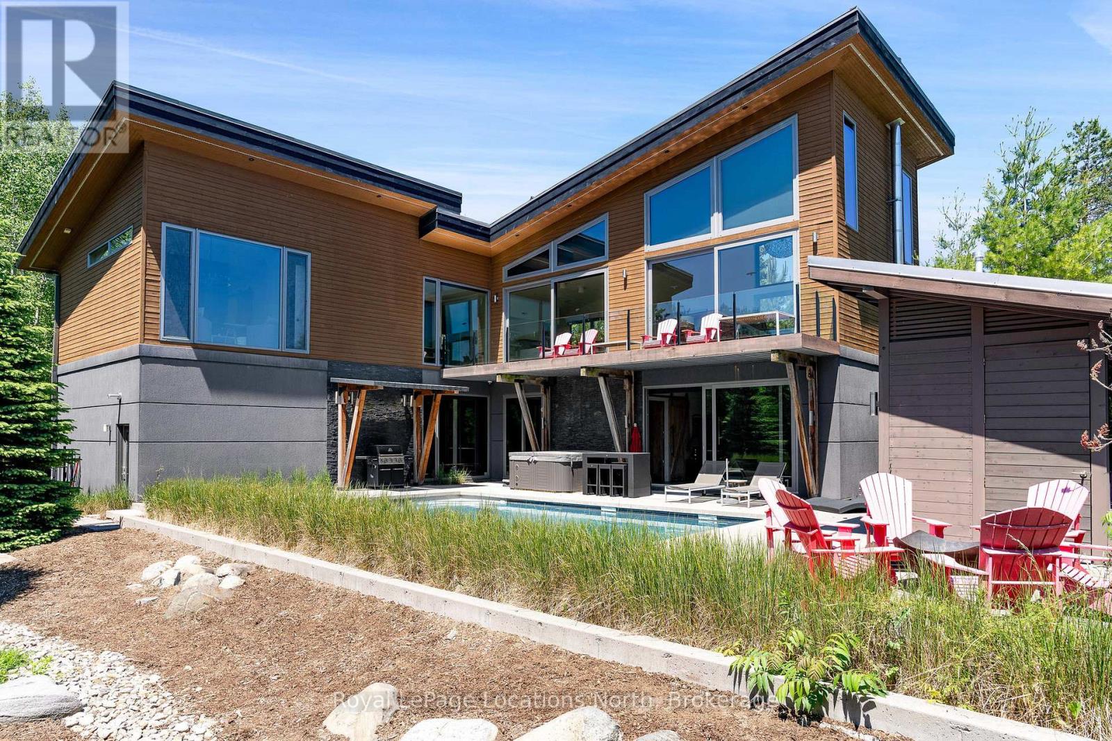 An Architecturally Iconic Luxury Ski Chalet, just steps from Craigleith. This celebrated retreat offers a rare balance of total privacy and effortless access, moments from the ski hills and tennis courts. Set on an expansive 100' x 159' lot backing onto tranquil green space, the property is beautifully landscaped to create a true four-season sanctuary. Designed for elevated mountain living, the chalet features a resort-style swimming pool, pool house, and hot tub, all framed by dramatic TILCO lift-and-slide window walls across two levels, capturing sweeping views of the ski hills and grounds beyond. Spanning three levels, the residence offers six luxurious bedrooms and four bathrooms. The upper-level great room is a showpiece, with soaring 22-foot ceilings, a Rumford-style gas fireplace, and a cantilevered walk-out deck-perfect for après-ski gatherings. The chef's kitchen is outfitted with premium appliances, a striking island, and a walk-in pantry, seamlessly blending form and function.The private primary suite occupies the upper level as well, featuring a distinctive walk-in closet and serene views. On the main floor, a sophisticated media lounge opens directly to the pool deck through expansive sliding doors and includes a wet bar / kitchenette, and fireplace, along with two additional bedrooms and full bath. The lower level completes the home with three generously sized bedrooms and another bath, ideal for hosting family and guests. This exceptional ski chalet is offered for immediate possession - an unparalleled opportunity to own a landmark retreat in one of the area's most coveted locations. (42075247)