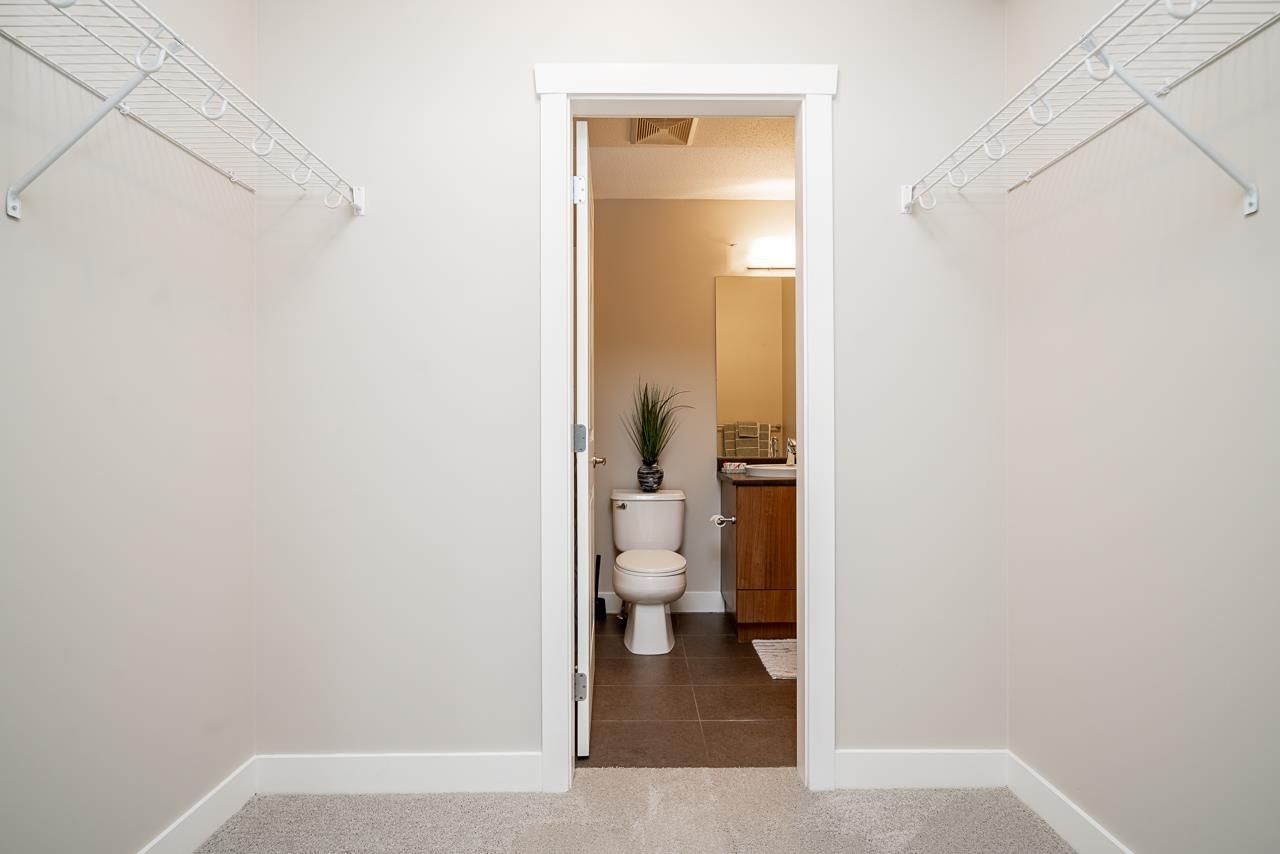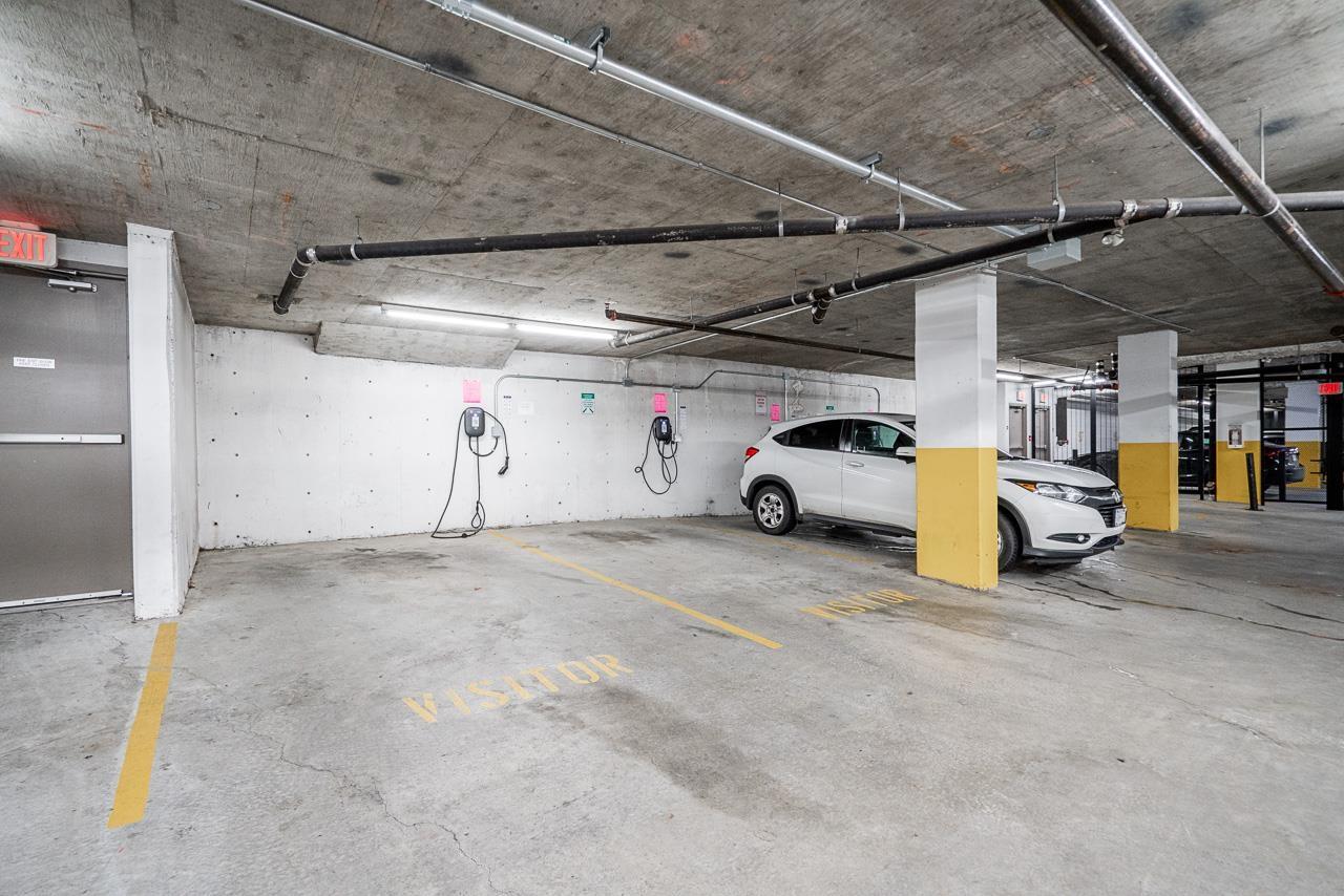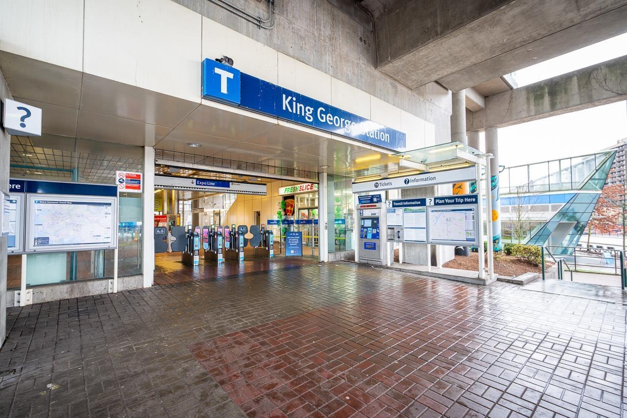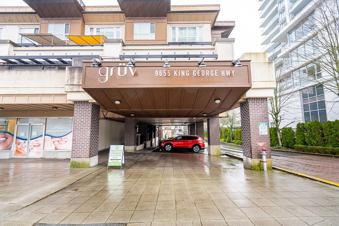 Hurry to view this spotless, quiet, corner apartment at GRUV. Like new condition, both bedrooms are spacious and both have their own bathrooms. Large wrap around covered NW facing balcony overlooking peaceful greenbelt. Stainless steel appliances, granite countertops, new carpets in bedrooms and fresh interior paint throughout. Open plan with breakfast bar, window in kitchen and plenty of natural light. Walk through closet in primary bedroom. Gym and amenity room, central hot water. Plenty of visitor parking with ample EV outlets. Walk to King George Station, SFU, Central City Mall, Holland Park and Surrey Memorial Hospital. Possession anytime. Underground secure parking and bike area. Pet friendly. Competitive price you won't be disappointed. (32406623)