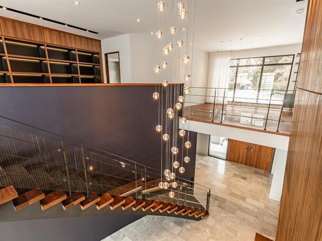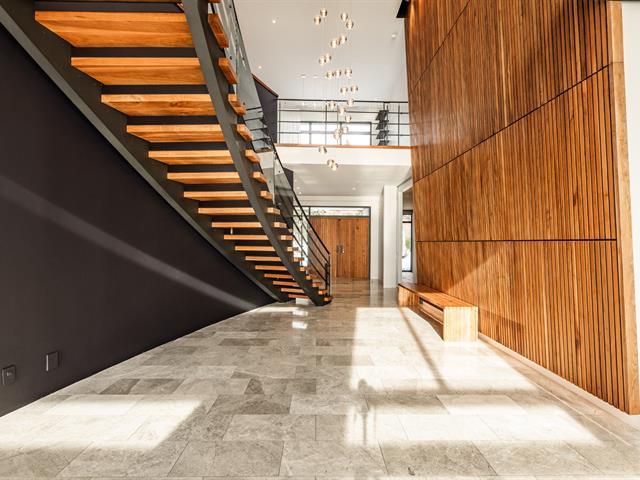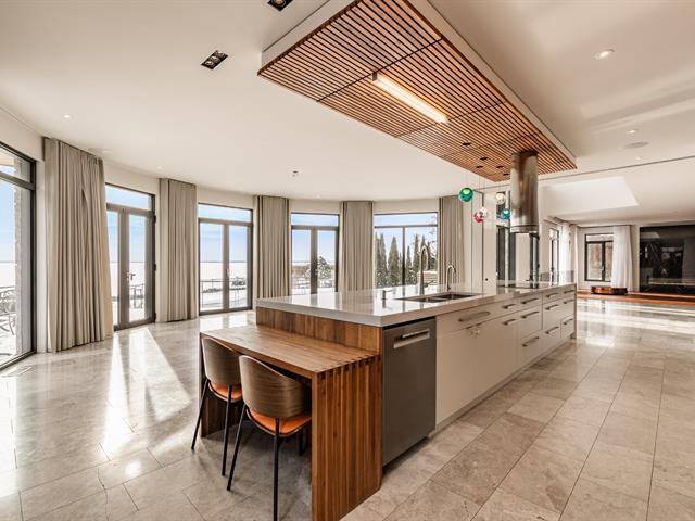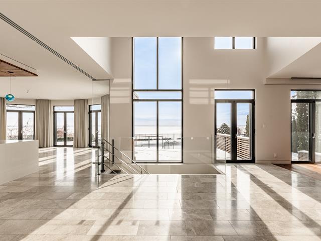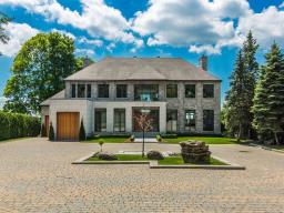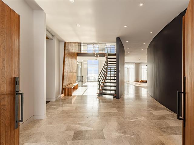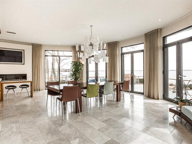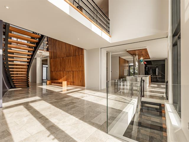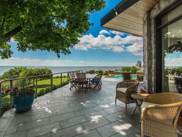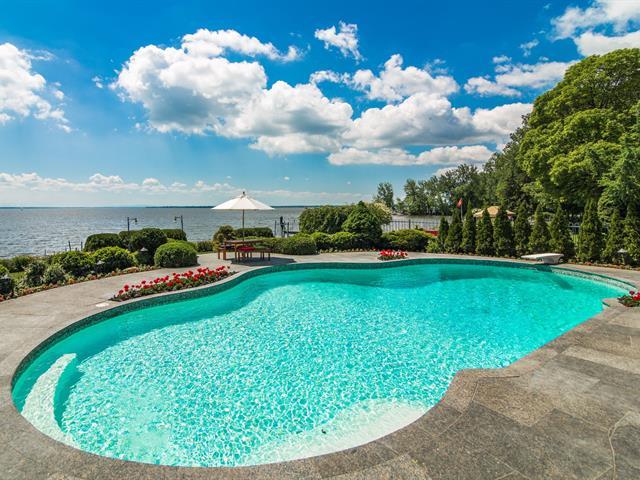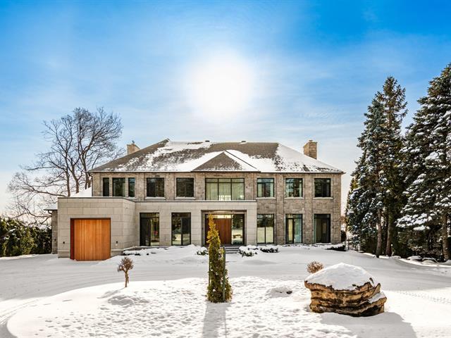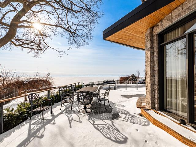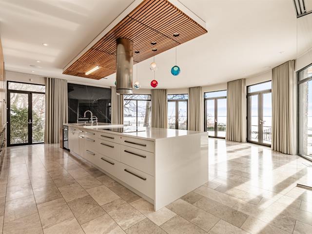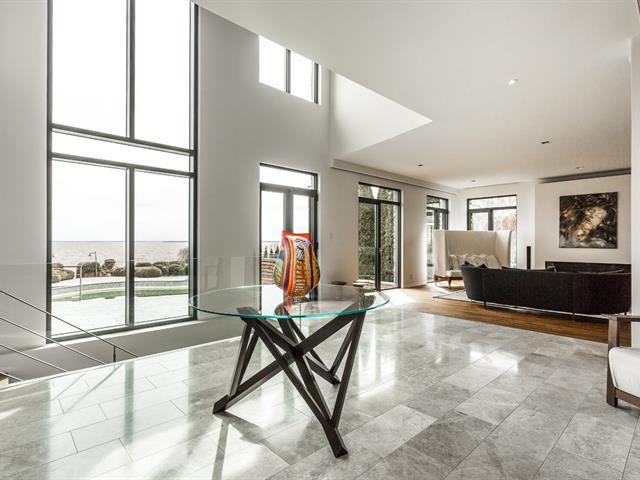 Exceptional contemporary waterfront estate on Lake St. Louis, impeccably renovated with striking architecture and bespoke finishes throughout. Set on nearly 48,000 sqft of private landscaped grounds, this stone residence offers expansive fenestration, abundant natural light, and lake views. Elegant open living spaces extend to terraces and pool. Chef's kitchen, luxurious primary suite with custom walk-ins and spa bath. Spectacular lower level featuring a full second kitchen, private cinema, professional gym, sauna, laundry, and extensive storage. Triple garage with EV charging. A rare fusion of design, scale, and refined waterfront living. (53971152)