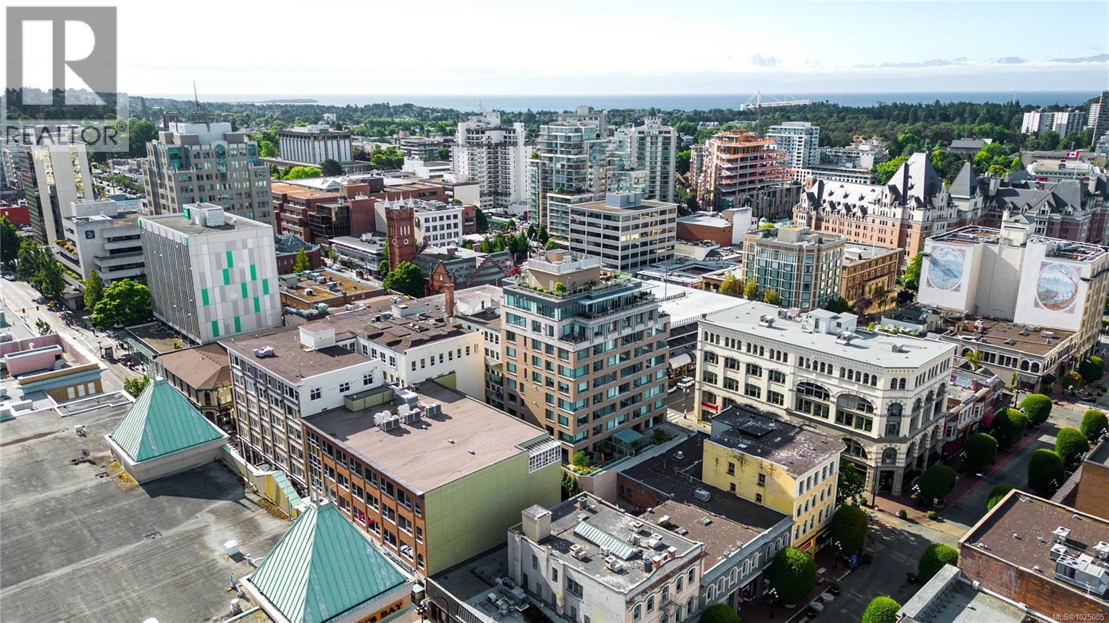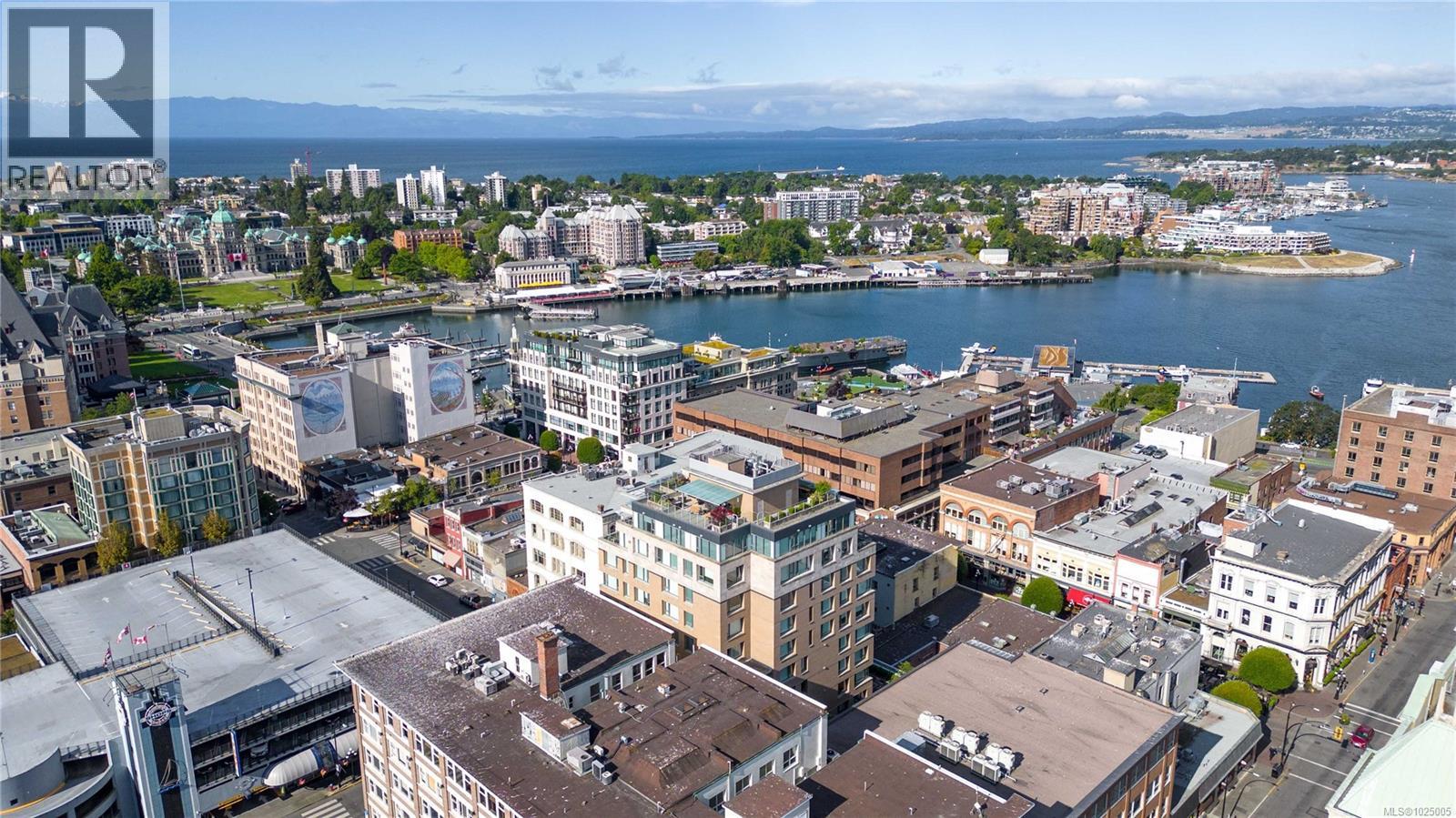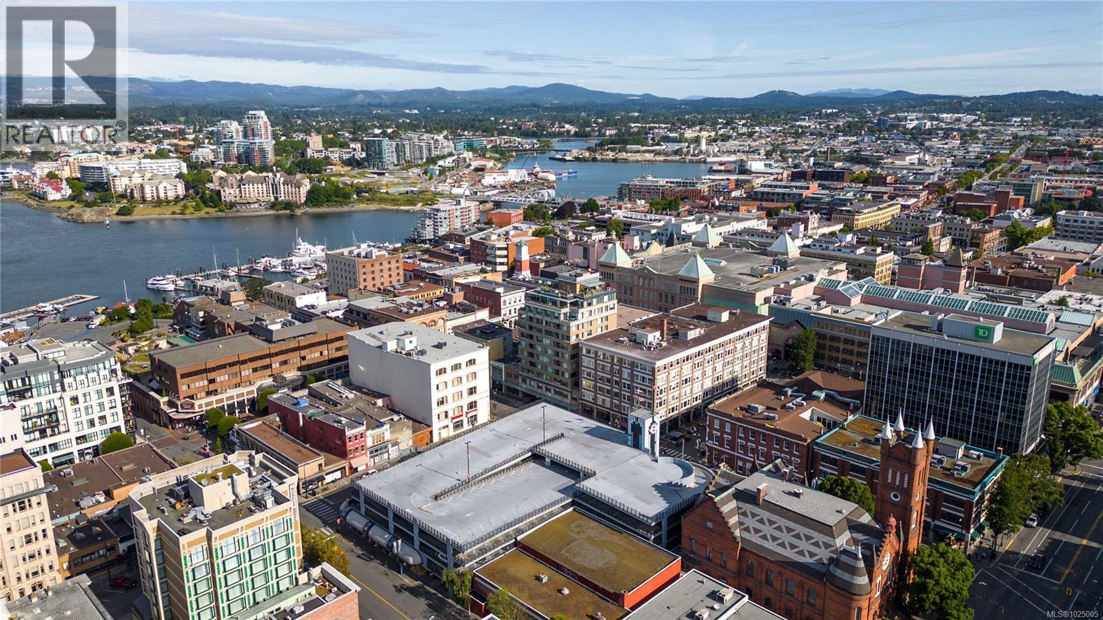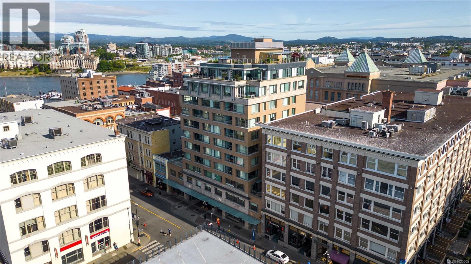 Enjoy city, mountain, and harbour views from this beautifully appointed 2-bedroom, 2-bathroom condo in the prestigious Sovereign, ideally located in the heart of downtown Victoria. Offering nearly 1,000 sq ft of refined living space, this home combines luxury, functionality, and unbeatable walkability—just steps from the Inner Harbour, shops, restaurants, and cultural landmarks. The bright, open-concept layout includes a covered balcony and office nook, while the gourmet kitchen features high-end stainless steel appliances including a gas range, stone countertops, a peninsula with seating for four, full-height cabinetry, and a spacious pantry. The generous primary suite boasts a walk-in closet and a 4 piece ensuite with heated floors and soaker tub. A second full bathroom offers a large walk-in shower, and comfort is assured year-round with energy-efficient air conditioning and perimeter hot water radiant heat. Residents enjoy premium amenities, including a fully furnished guest suite and an impressive 12th-floor rooftop terrace complete with heaters, a gas barbecue, fireplace, and ample seating to take in the panoramic harbour views. Additional features include one secure underground parking stall, a storage locker, secure bike storage, and utilities such as heat, A/C, hot water, and natural gas all included. Pets are welcome. Don’t miss this rare opportunity—book your private viewing today! (30346715)