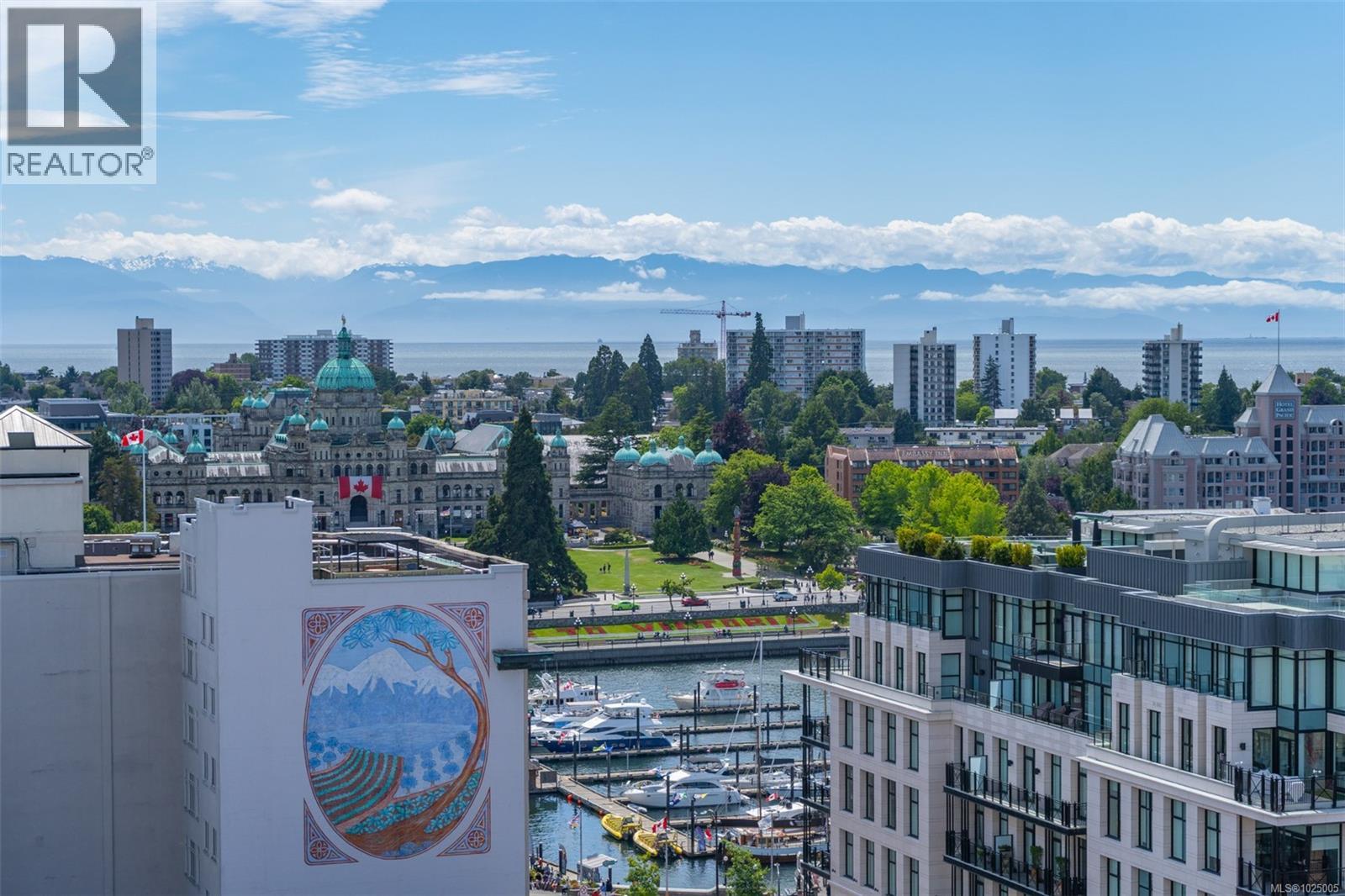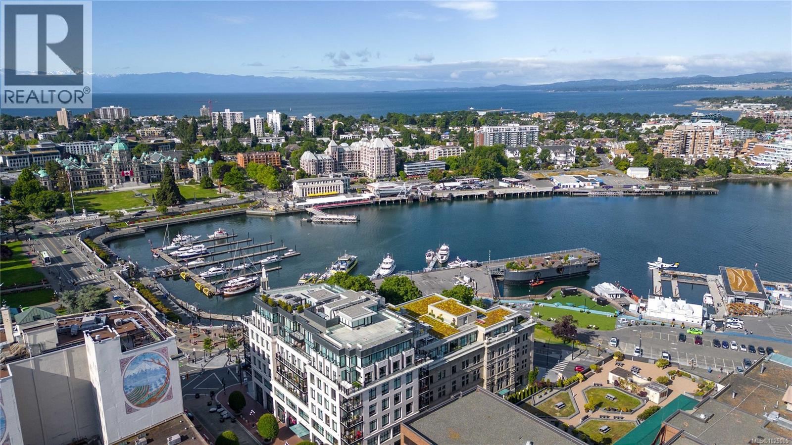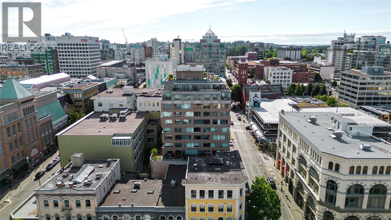 Enjoy city, mountain, and harbour views from this beautifully appointed 2-bedroom, 2-bathroom condo in the prestigious Sovereign, ideally located in the heart of downtown Victoria. Offering nearly 1,000 sq ft of refined living space, this home combines luxury, functionality, and unbeatable walkability—just steps from the Inner Harbour, shops, restaurants, and cultural landmarks. The bright, open-concept layout includes a covered balcony and office nook, while the gourmet kitchen features high-end stainless steel appliances including a gas range, stone countertops, a peninsula with seating for four, full-height cabinetry, and a spacious pantry. The generous primary suite boasts a walk-in closet and a 4 piece ensuite with heated floors and soaker tub. A second full bathroom offers a large walk-in shower, and comfort is assured year-round with energy-efficient air conditioning and perimeter hot water radiant heat. Residents enjoy premium amenities, including a fully furnished guest suite and an impressive 12th-floor rooftop terrace complete with heaters, a gas barbecue, fireplace, and ample seating to take in the panoramic harbour views. Additional features include one secure underground parking stall, a storage locker, secure bike storage, and utilities such as heat, A/C, hot water, and natural gas all included. Pets are welcome. Don’t miss this rare opportunity—book your private viewing today! (30346715)