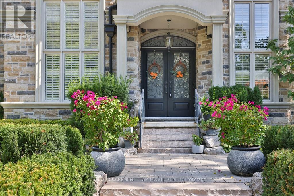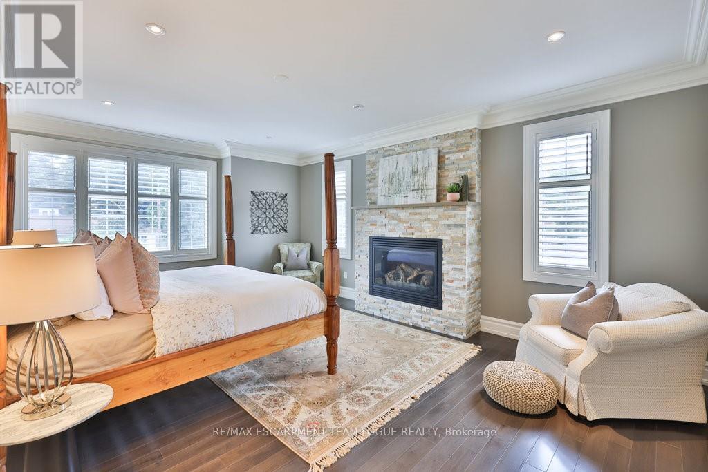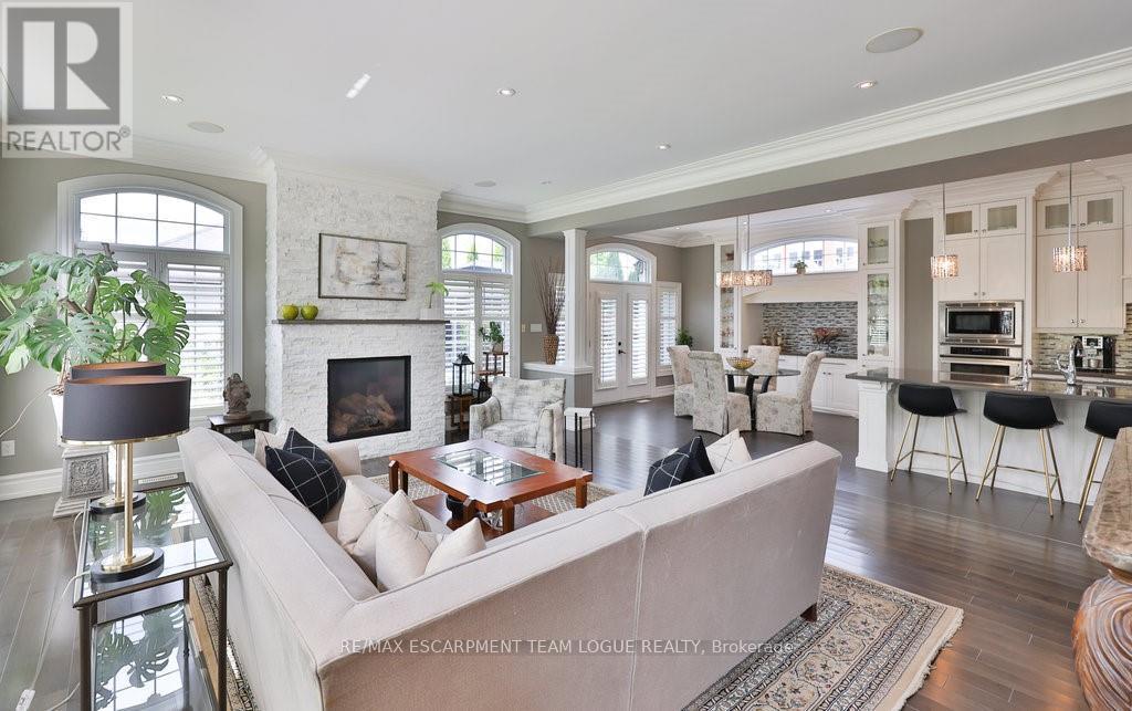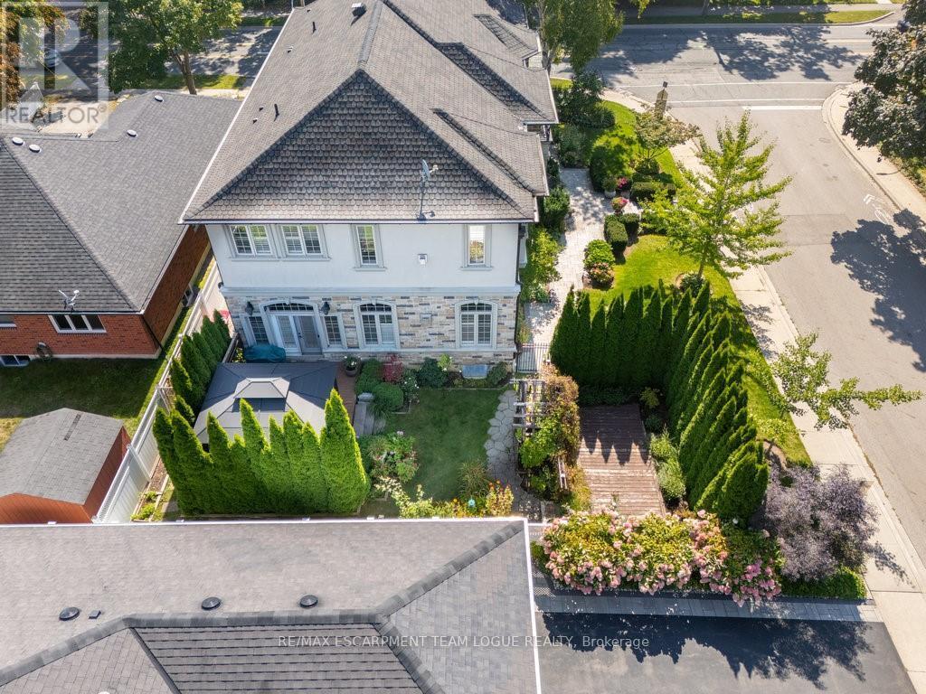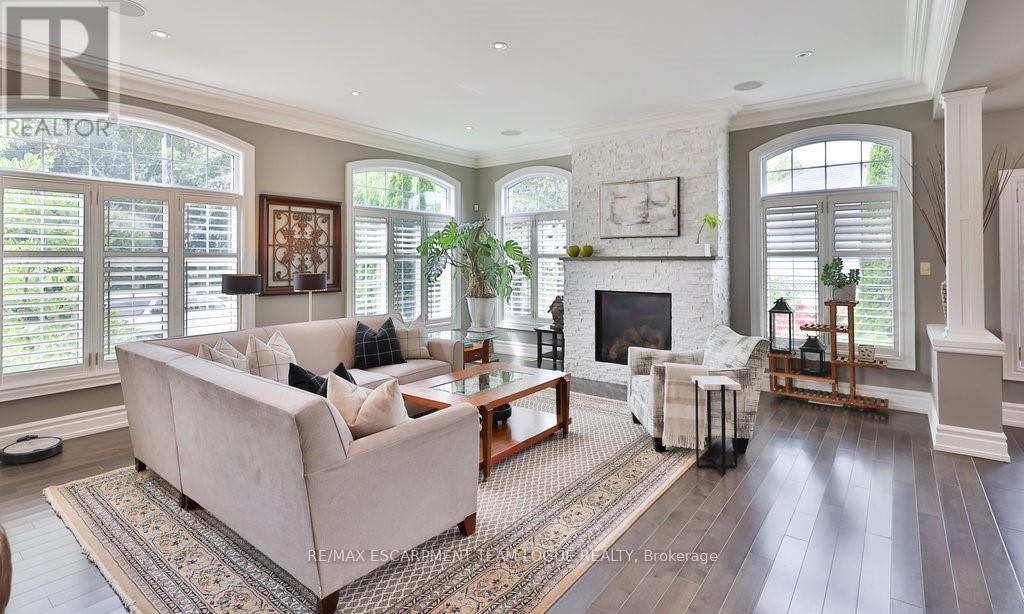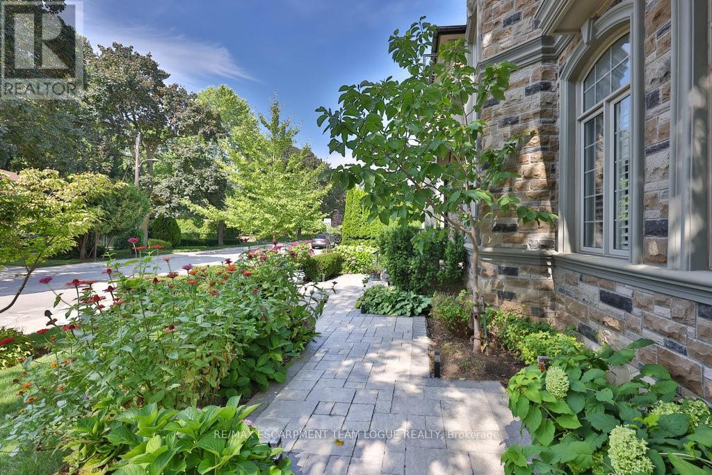 Welcome home. Prestigious Lakeshore address, just steps from the water's edge and a short stroll to Burlington's vibrant downtown core. This custom-built residence showcases timeless elegance and exceptional curb appeal, framed by lush, landscaped gardens. Inside, a grand foyer with soaring ceilings and walls of windows flood the home with natural light, introducing airy and sophisticated interiors. At its heart lies a designer kitchen-an entertainer's dream, featuring a sprawling island with bar seating, quartz countertops, a full wall of refrigeration, premium Thermador appliances (including two dishwashers), abundant storage, and seamless flow into the sunlit dining area. The open-concept layout continues into the expansive great room, anchored by a striking stone fireplace, and transitions effortlessly into the formal dining area. A private office/den, elegant powder room, custom mudroom, and interior access to the oversized double garage complete the main level. Upstairs, the luxurious primary suite offers a cozy fireplace, spa-inspired five-piece ensuite, and spacious walk-in closet. Three additional bedrooms, each with ensuite or semi-ensuite access, provide comfort and privacy, while a convenient laundry room completes this level. Step outside to your private backyard oasis, surrounded by mature, colorful gardens. Two patios, including one with a large pergola, create the perfect setting for relaxation or outdoor entertaining. The lower level presents endless possibilities with soaring ceilings, an expansive open layout, rough-ins for kitchen and bathroom, heated floor hookups, generous storage, and a separate enclosed room ideal for an additional bedroom or flexible living space. Luxury Certified. (42079183)