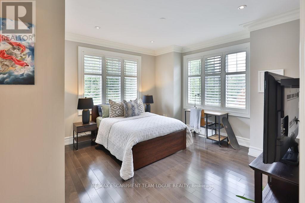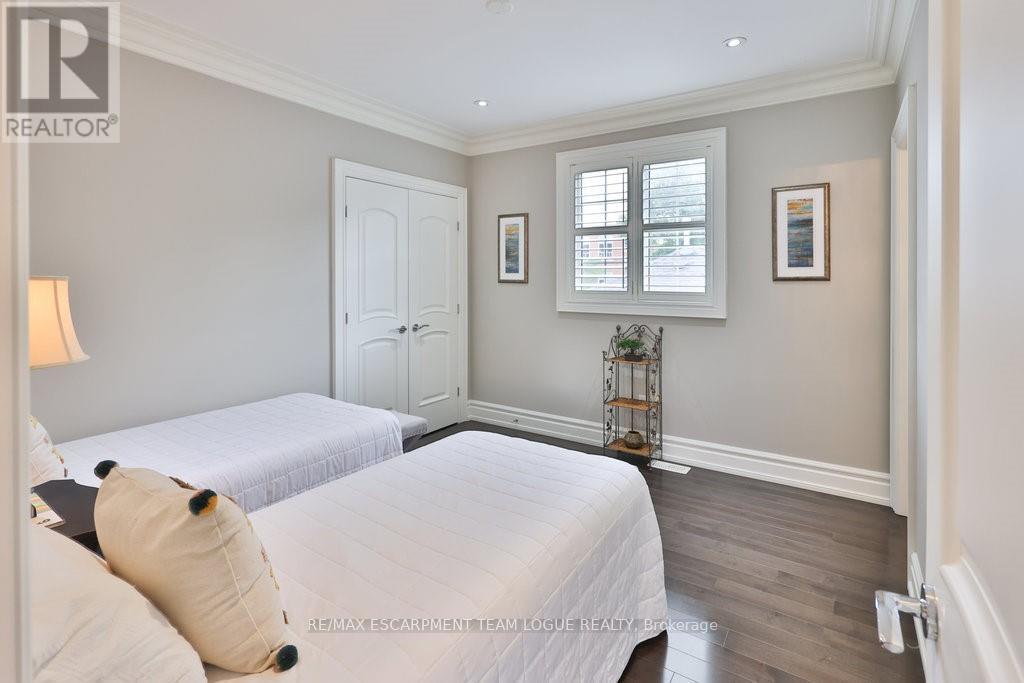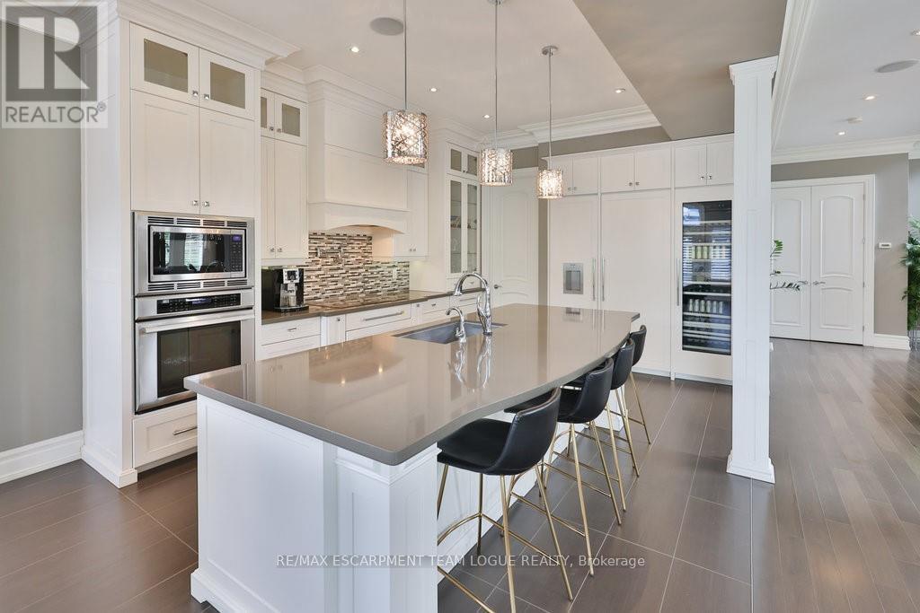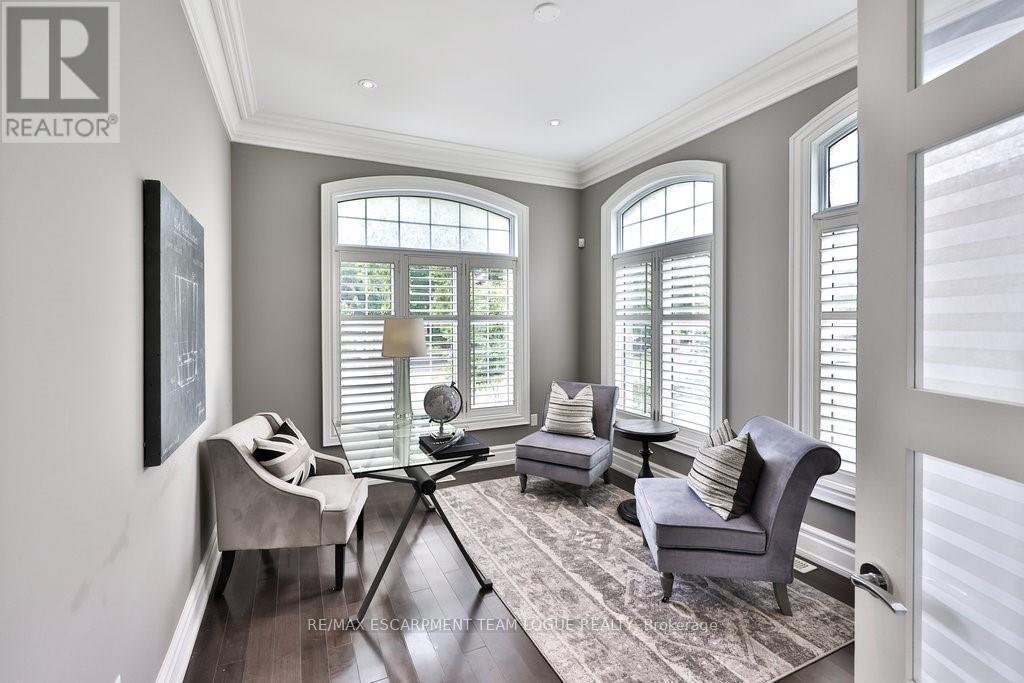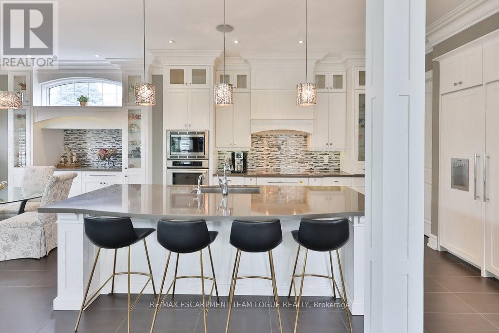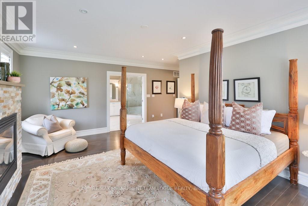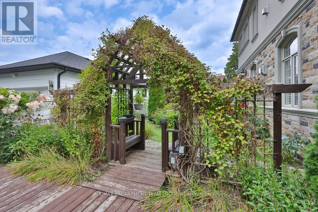 Welcome home. Prestigious Lakeshore address, just steps from the water's edge and a short stroll to Burlington's vibrant downtown core. This custom-built residence showcases timeless elegance and exceptional curb appeal, framed by lush, landscaped gardens. Inside, a grand foyer with soaring ceilings and walls of windows flood the home with natural light, introducing airy and sophisticated interiors. At its heart lies a designer kitchen-an entertainer's dream, featuring a sprawling island with bar seating, quartz countertops, a full wall of refrigeration, premium Thermador appliances (including two dishwashers), abundant storage, and seamless flow into the sunlit dining area. The open-concept layout continues into the expansive great room, anchored by a striking stone fireplace, and transitions effortlessly into the formal dining area. A private office/den, elegant powder room, custom mudroom, and interior access to the oversized double garage complete the main level. Upstairs, the luxurious primary suite offers a cozy fireplace, spa-inspired five-piece ensuite, and spacious walk-in closet. Three additional bedrooms, each with ensuite or semi-ensuite access, provide comfort and privacy, while a convenient laundry room completes this level. Step outside to your private backyard oasis, surrounded by mature, colorful gardens. Two patios, including one with a large pergola, create the perfect setting for relaxation or outdoor entertaining. The lower level presents endless possibilities with soaring ceilings, an expansive open layout, rough-ins for kitchen and bathroom, heated floor hookups, generous storage, and a separate enclosed room ideal for an additional bedroom or flexible living space. Luxury Certified. (42079183)