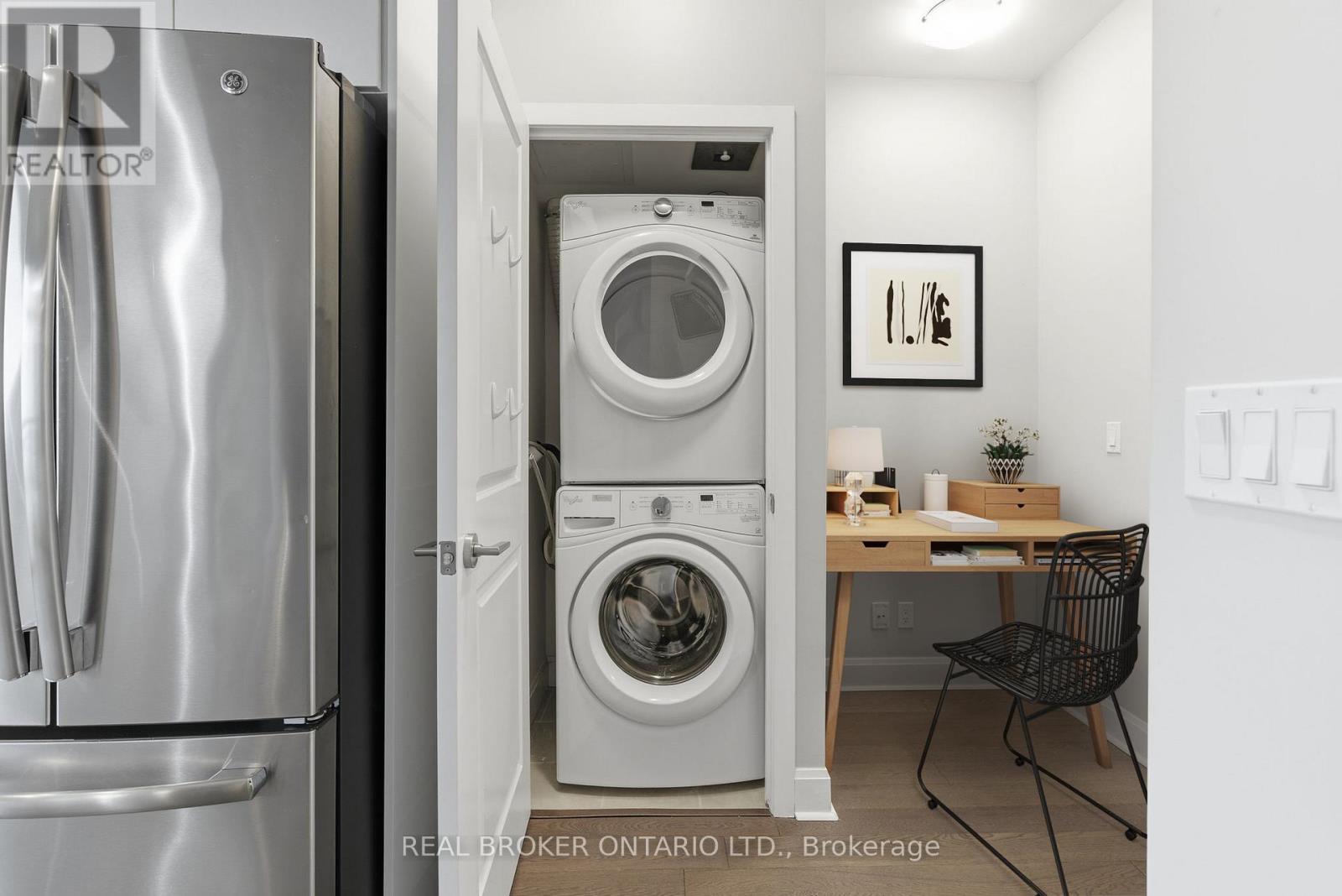 Wake up to stunning water views through floor-to-ceiling windows in this thoughtfully designed 1-bedroom, 1-bathroom suite at Jade Waterfront Condos, where contemporary style meets relaxed lakeside living. This refreshed condo invites you to settle in and start your next chapter with ease. The open-concept layout is bright and effortless, with rich engineered hardwood floors and anchored by a modern galley-style kitchen featuring stainless steel appliances, a deep sink, and sleek lacquered cabinetry with under-cabinet lighting. Every detail has been considered, from soft-close drawers to a dedicated filtered water tap. The kitchen flows seamlessly into the living area, creating the perfect space for quiet mornings or evenings spent entertaining with the lake as your backdrop. The spacious queen-sized bedroom offers balcony access, Hunter Douglas blackout blinds, and something truly special: this is the only 1-bedroom layout in the building with a full walk-in closet, and it's large. The beautifully finished bathroom features elegant marble finishes, a deep soaker tub, and glass shower doors designed for calm and comfort. Work from home with ease in the pre-wired media alcove, ideal as a home office while staying connected to the flow of the suite. In-suite laundry with a full-sized GE washer and dryer adds convenience, and owned parking plus a spacious locker located directly behind the parking spot, make everyday living simple. Step outside onto your 30-foot full-length balcony with southwesterly views of Lake Ontario. With 620 sq. ft. inside and 144 sq. ft. outside, this suite offers 764 sq. ft. of thoughtfully designed living. Enjoy resort-style amenities including 24-hour concierge, pool, BBQ area, gym, virtual golf, theatre, party room, guest suites, billiards lounge, and pet grooming station. Cafés, restaurants, groceries, transit, and waterfront trails are all just steps away. This is more than a condo, it's easy, elevated lakeside living. (42079979)