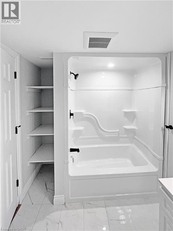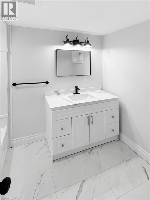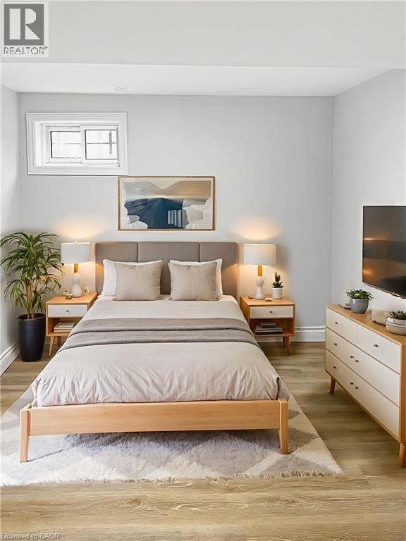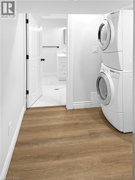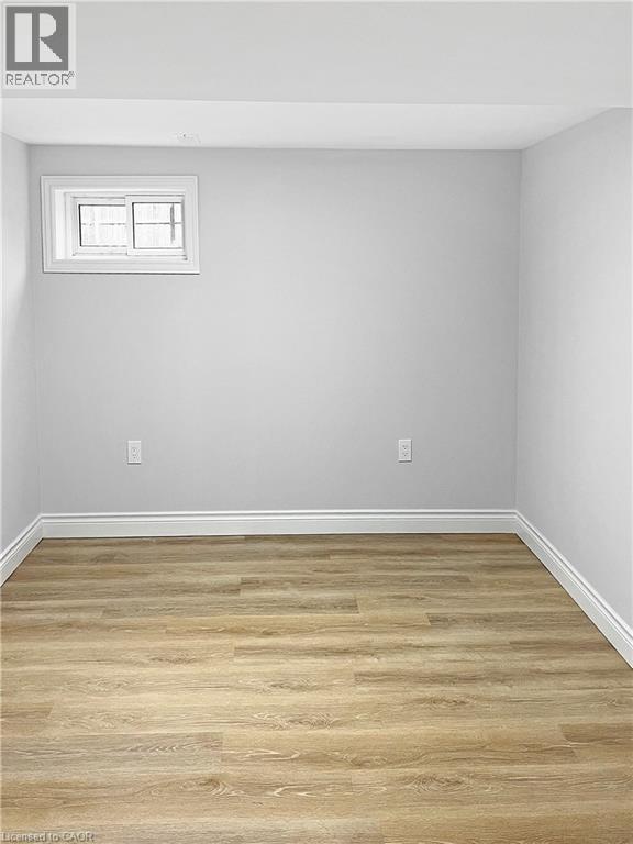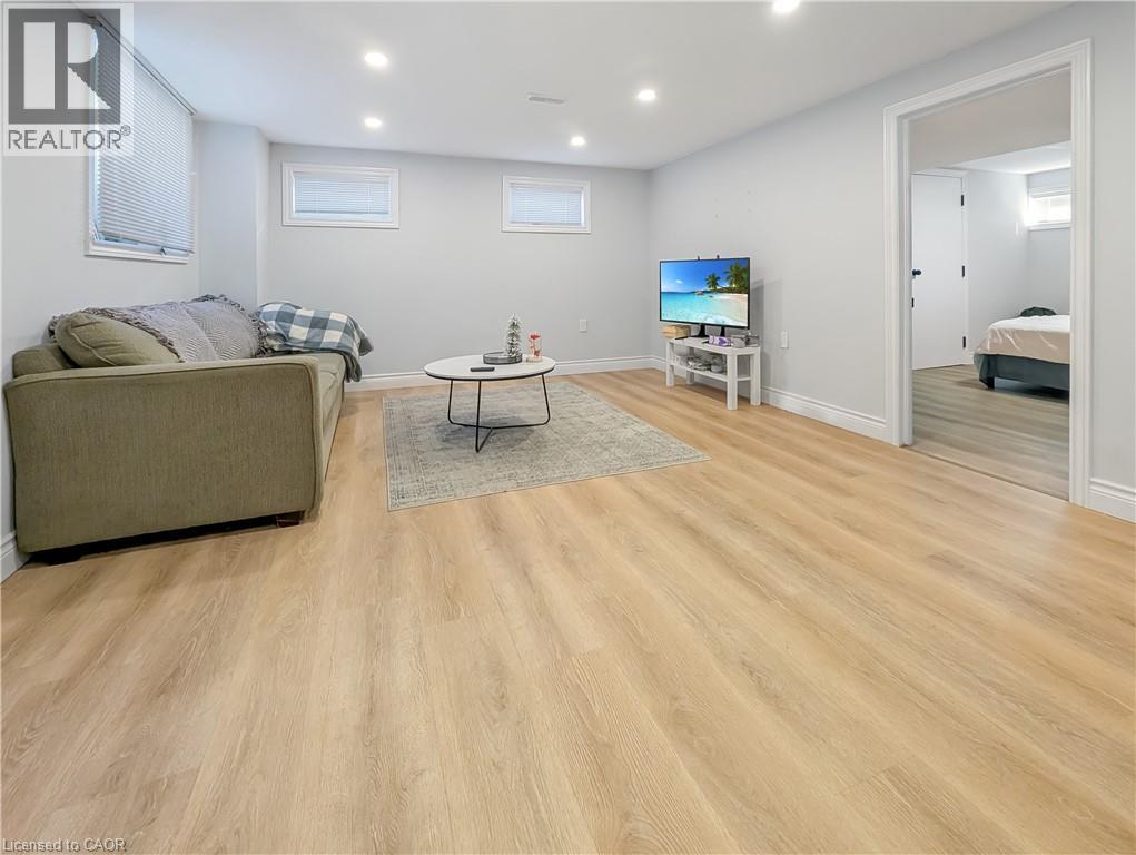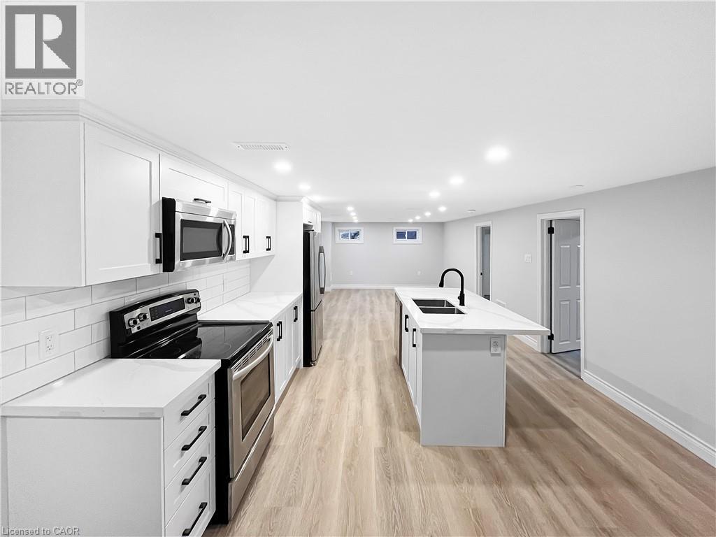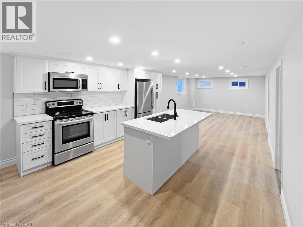 Welcome to this charming basement unit in the family-friendly Hampton Heights neighbourhood! Completely updated in 2023, you'll be greeted by a bright, airy, open-concept layout, where the kitchen seamlessly flows into the living room. The kitchen boasts timeless white cabinetry, a convenient centre island with dishwasher, sleek stainless steel appliances including a built-in microwave and, complemented by stylish vinyl flooring, pot lighting, and a ceramic backsplash. Enjoy the ease of in-suite laundry. Features two comfortable bedrooms, all with vinyl flooring, and a well-appointed 4-piece bathroom. Outside, a fenced and gated shared yard offers a secure space, and you'll have the convenience of 2-car parking on the right side of the driveway. Utilities are split 40% with the main level unit, averaging approximately $100 monthly. This wonderful location offers a short drive to the scenic Escarpment Rail Trail and easy highway access for commuters. Requirements: minimum Equifax credit score of 670 and combined income of $60,000. Virtually staged. (70126178)