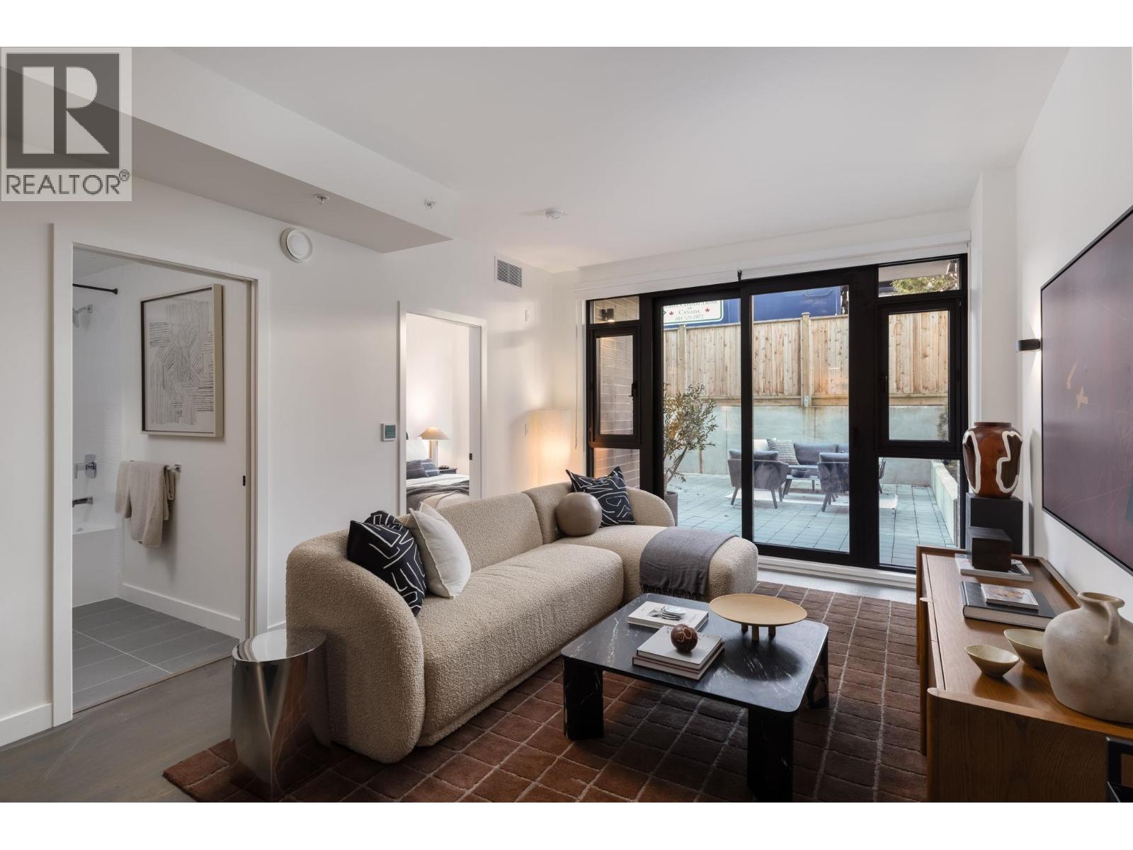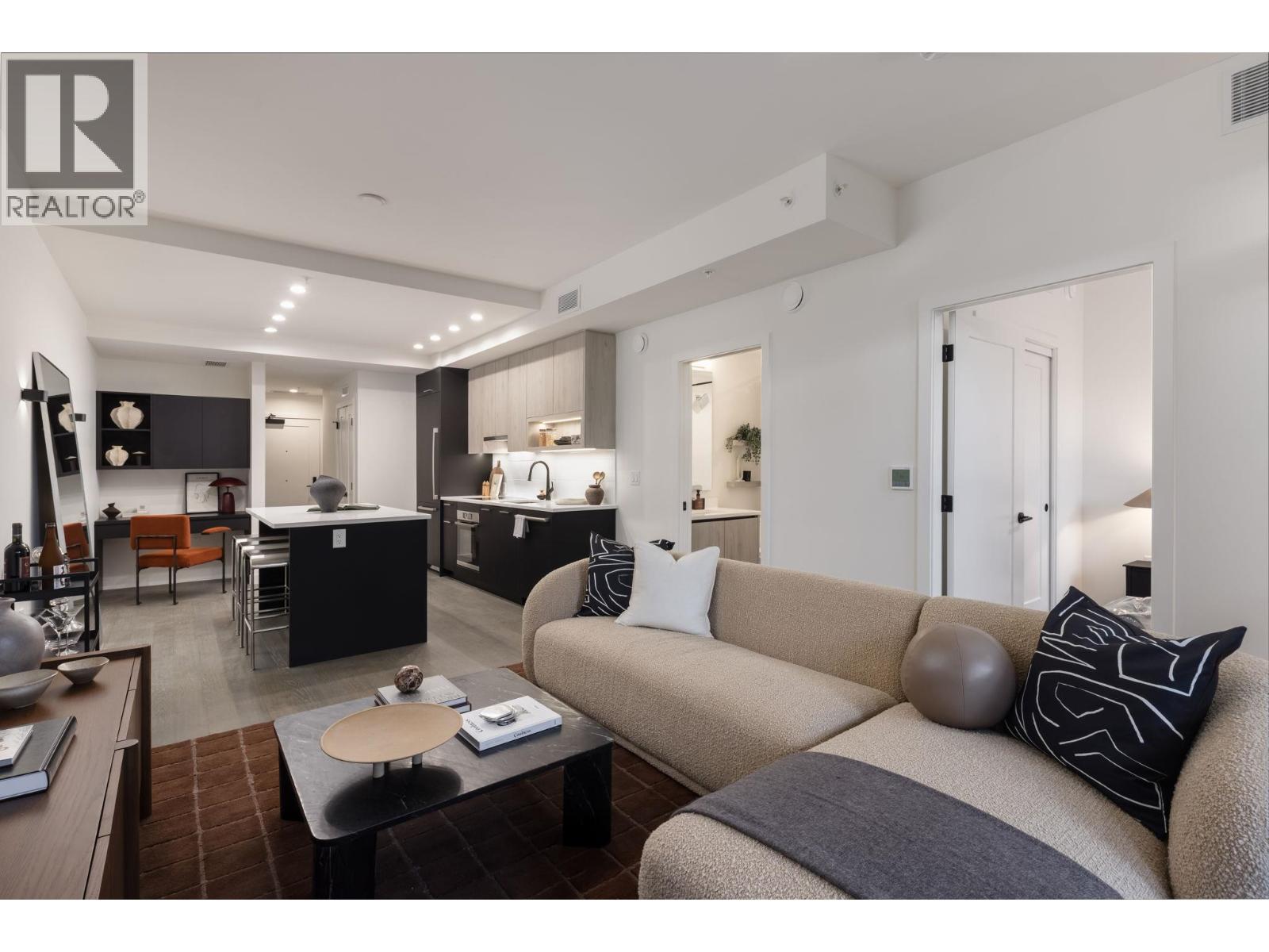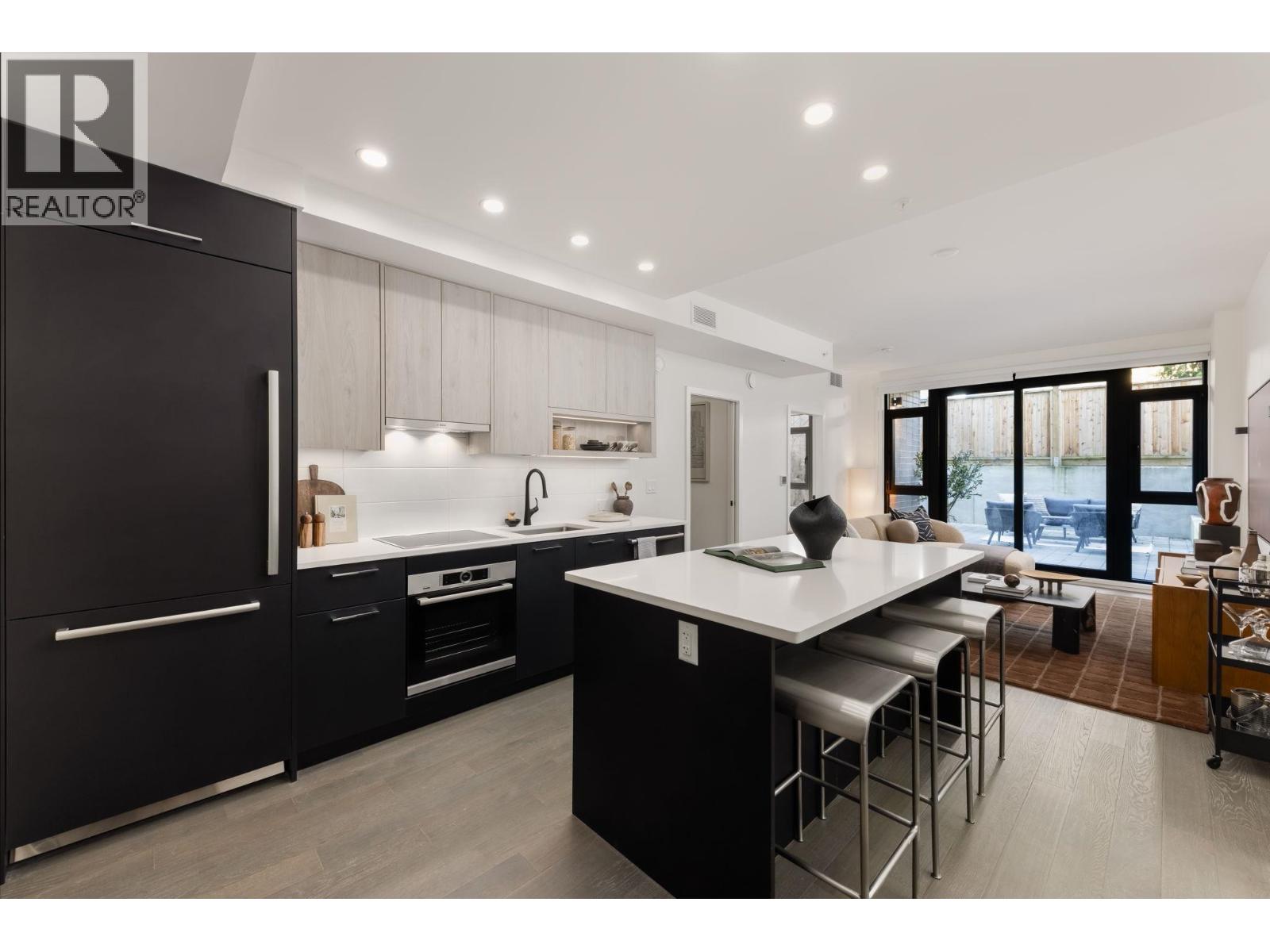 This beautifully designed 1-bedroom + den ground-level home offers a smart, functional layout and an exceptional 414 square ft private walkout patio for year-round living and entertaining. Floor-to-ceiling windows bring in natural light, while the kitchen features smart storage, a dining island, and a full-size 30" integrated Bosch appliance package with. 9' ceilings, engineered hardwood, A/C, and a full-sized LG washer and dryer complete the home. Located in South Oak, near Marine Gateway and Oakridge Centre for shopping and dining. Open house on Feb 7 and 8 between 1-4pm. Please call and ask about our limited-time incentives. (32410628)