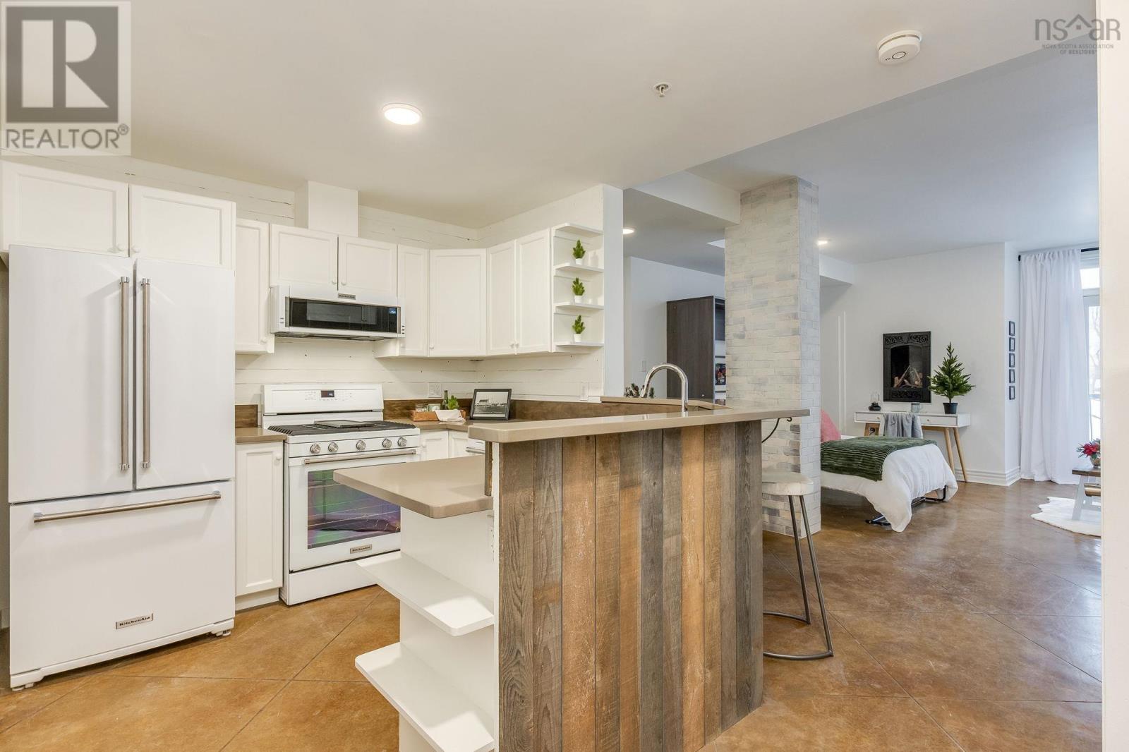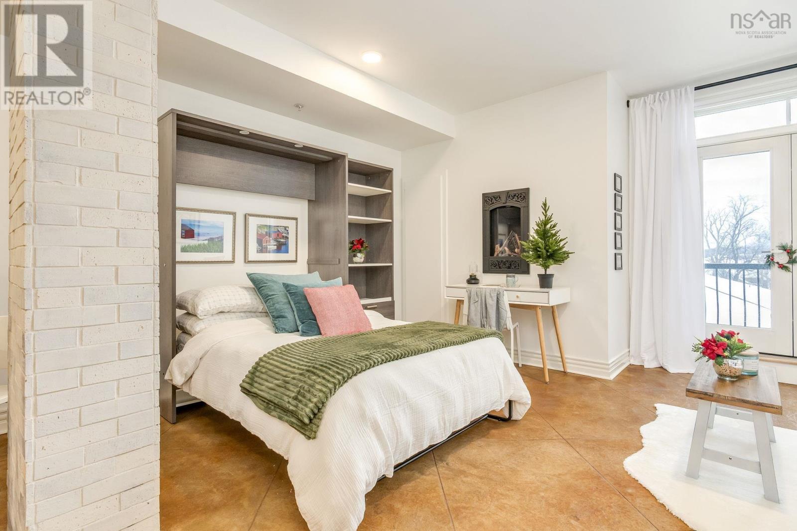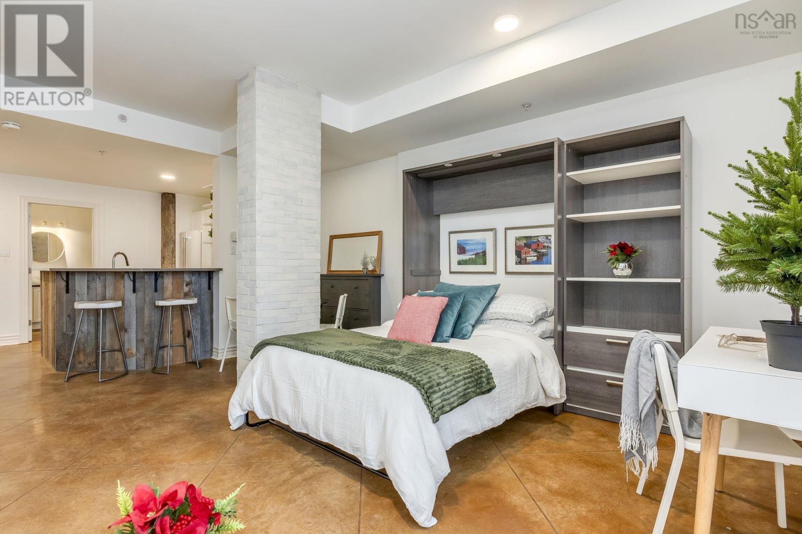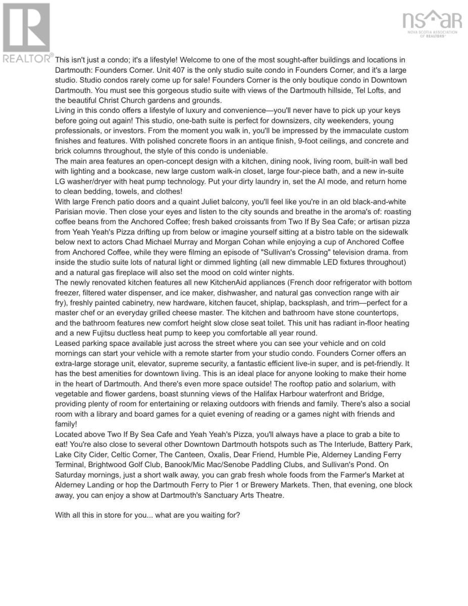 Welcome to one of the most sought-after buildings and locations in Dartmouth: Founders Corner. The only studio in the building, this suite offers a lifestyle of luxury and convenience, and is perfect for downsizers, city weekenders, young professionals, or investors. With polished concrete floors in an antique finish, 9-foot ceilings, and concrete and brick columns throughout, the style of this condo is undeniable. The main area features an open-concept design with a kitchen, dining nook, living room, built-in wall bed with lighting and a bookcase, new large custom walk-in closet, large four-piece bath, and a new in-suite LG washer/dryer with heat pump technology. The large French patio doors to the quaint Juliet balcony allow in lots of natural light, while the all new dimmable LED fixtures throughout and natural gas fireplace will also set the mood on cold winter nights. The newly renovated kitchen features all new appliances, freshly painted cabinetry, new hardware, faucet, shiplap, backsplash, and trim. The kitchen and bathroom both feature stone countertops. Radiant in-floor heating and a new Fujitsu ductless heat pump keep you comfortable all year round. Leased parking space is available just across the street. Amenities include an extra-large storage unit, elevator, security, live-in super, and the building is pet-friendly. The rooftop patio and solarium, with gardens, boast stunning views and provide plenty of room for entertaining or relaxing outdoors with friends and family. There's also a social room with a library and board games. Located above Two If By Sea Cafe and Yeah Yeah's Pizza, you're also close to several other Downtown Dartmouth hotspots as well as the ferry terminal, Brightwood Golf Club, paddling clubs, and Sullivan's Pond. On Saturday mornings, just a short walk away, you can grab fresh whole foods from the Farmer's Market at Alderney Landing or hop the Dartmouth Ferry to Pier 1 or Brewery Markets. (231927384)