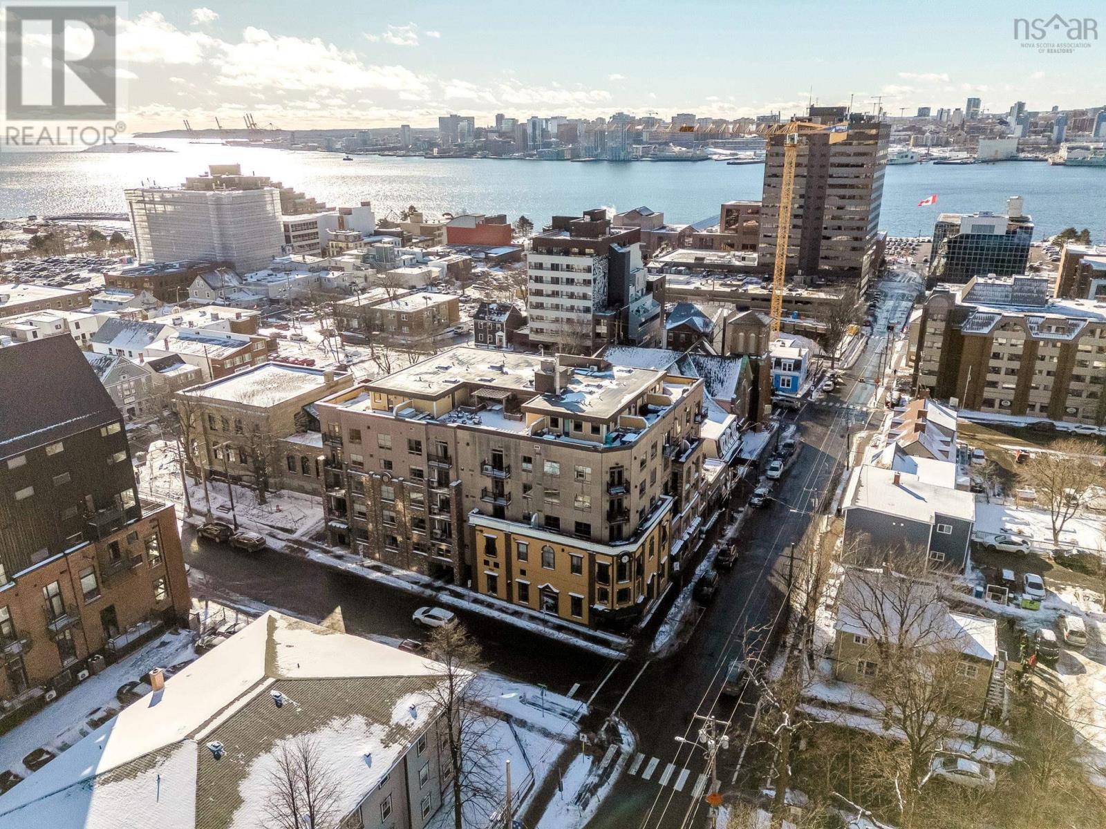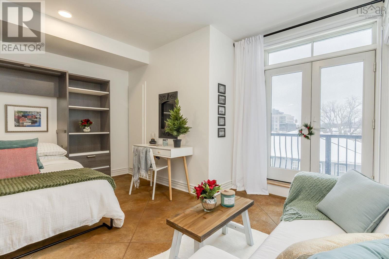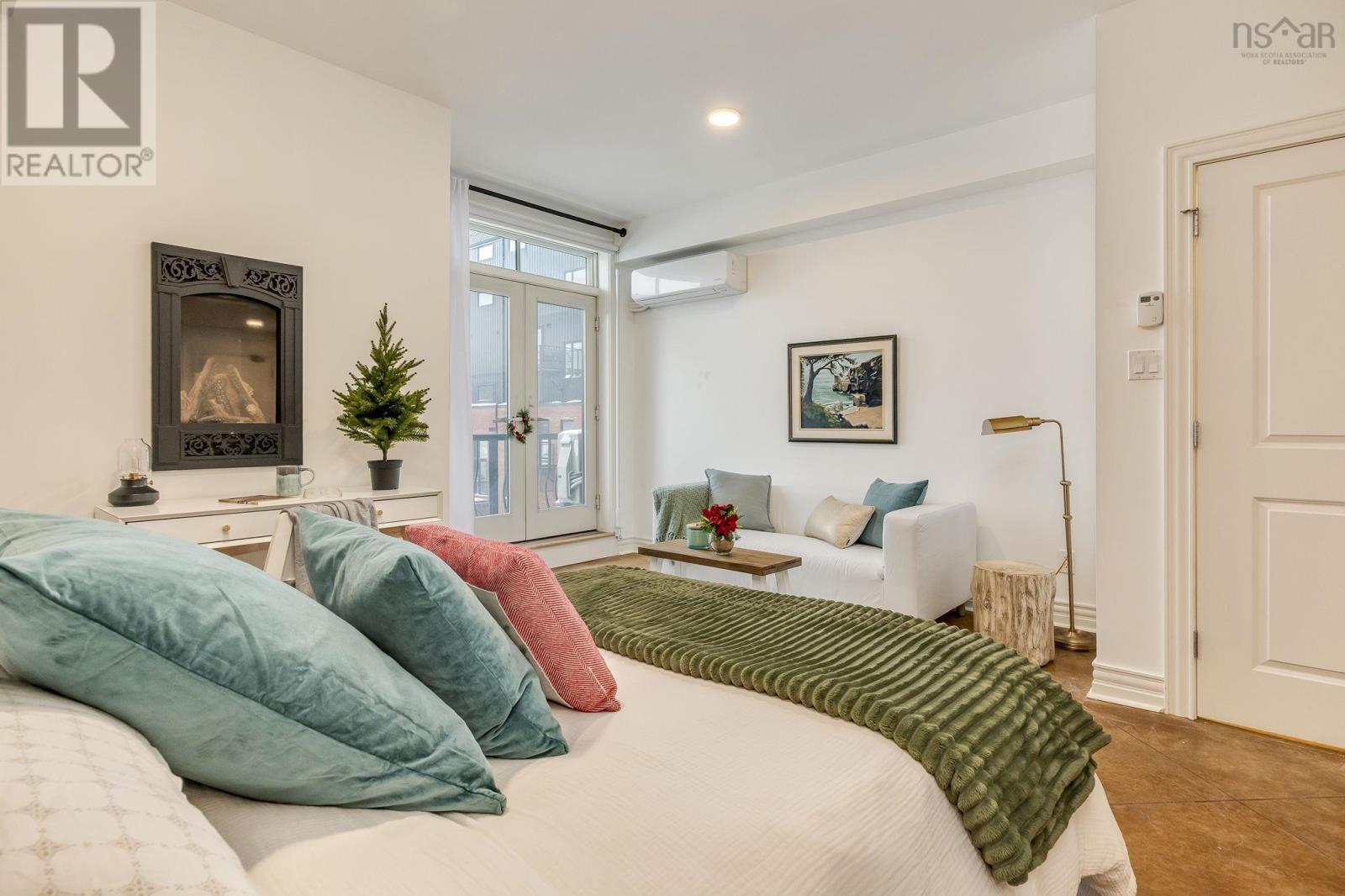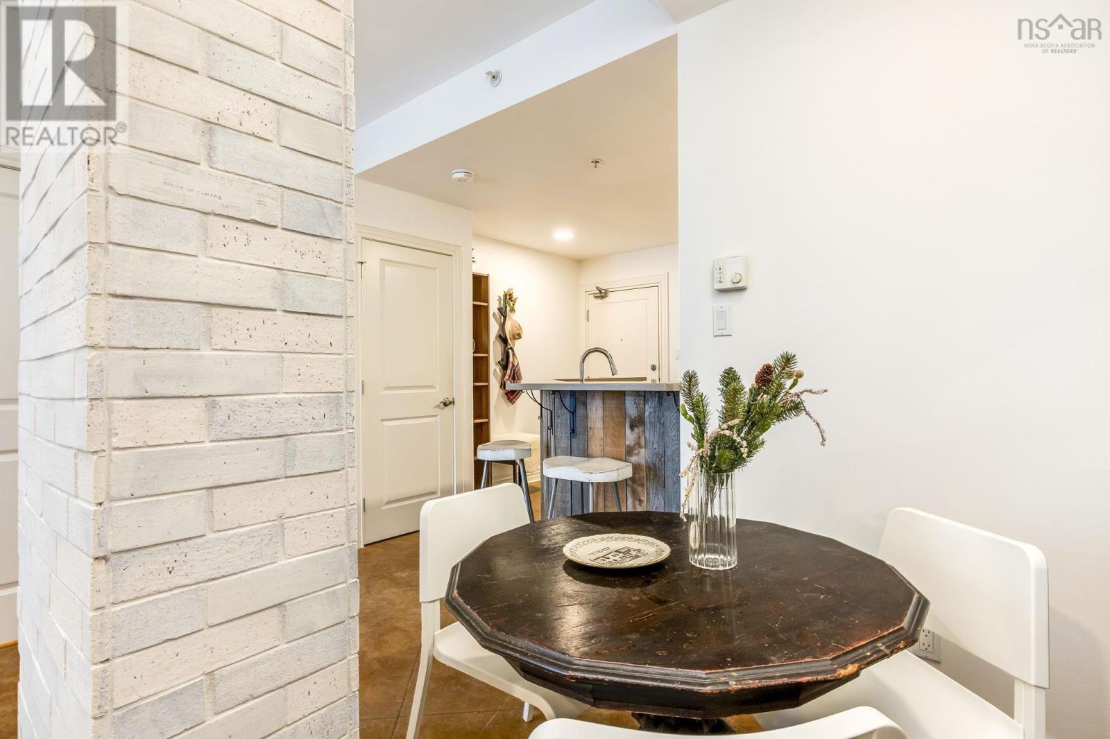 Welcome to one of the most sought-after buildings and locations in Dartmouth: Founders Corner. The only studio in the building, this suite offers a lifestyle of luxury and convenience, and is perfect for downsizers, city weekenders, young professionals, or investors. With polished concrete floors in an antique finish, 9-foot ceilings, and concrete and brick columns throughout, the style of this condo is undeniable. The main area features an open-concept design with a kitchen, dining nook, living room, built-in wall bed with lighting and a bookcase, new large custom walk-in closet, large four-piece bath, and a new in-suite LG washer/dryer with heat pump technology. The large French patio doors to the quaint Juliet balcony allow in lots of natural light, while the all new dimmable LED fixtures throughout and natural gas fireplace will also set the mood on cold winter nights. The newly renovated kitchen features all new appliances, freshly painted cabinetry, new hardware, faucet, shiplap, backsplash, and trim. The kitchen and bathroom both feature stone countertops. Radiant in-floor heating and a new Fujitsu ductless heat pump keep you comfortable all year round. Leased parking space is available just across the street. Amenities include an extra-large storage unit, elevator, security, live-in super, and the building is pet-friendly. The rooftop patio and solarium, with gardens, boast stunning views and provide plenty of room for entertaining or relaxing outdoors with friends and family. There's also a social room with a library and board games. Located above Two If By Sea Cafe and Yeah Yeah's Pizza, you're also close to several other Downtown Dartmouth hotspots as well as the ferry terminal, Brightwood Golf Club, paddling clubs, and Sullivan's Pond. On Saturday mornings, just a short walk away, you can grab fresh whole foods from the Farmer's Market at Alderney Landing or hop the Dartmouth Ferry to Pier 1 or Brewery Markets. (231927384)