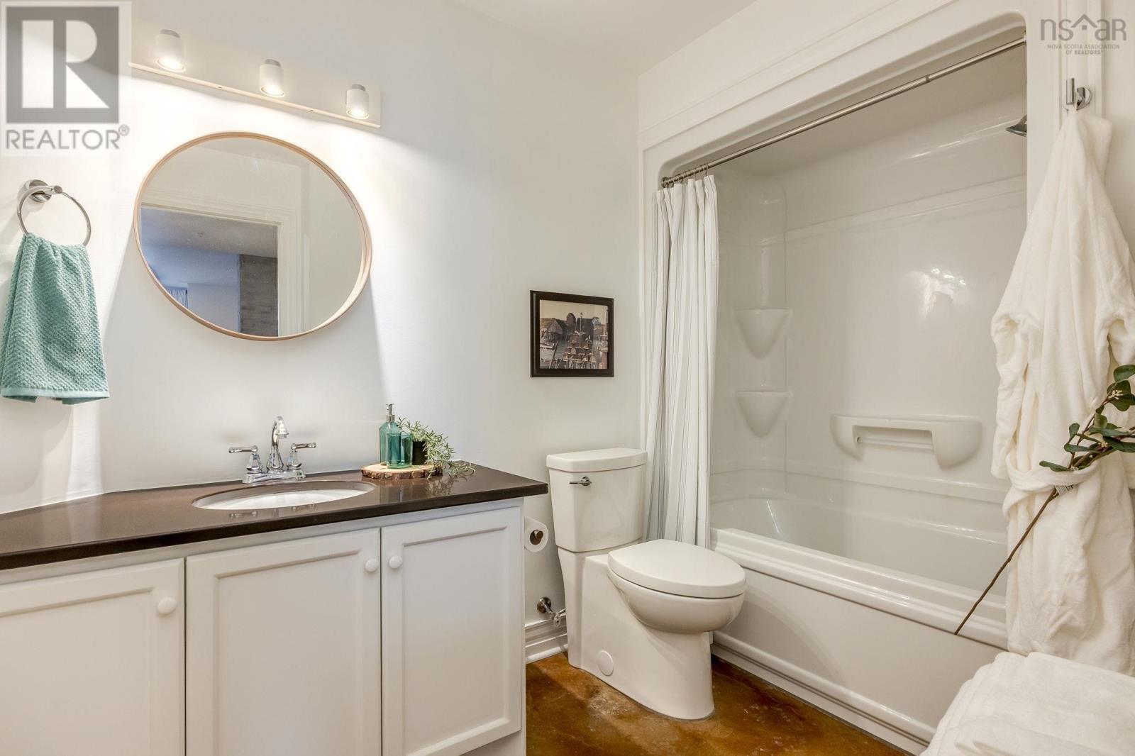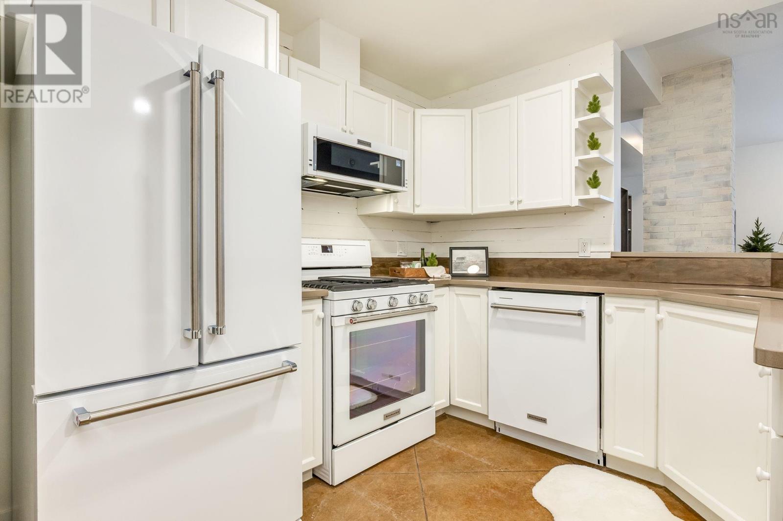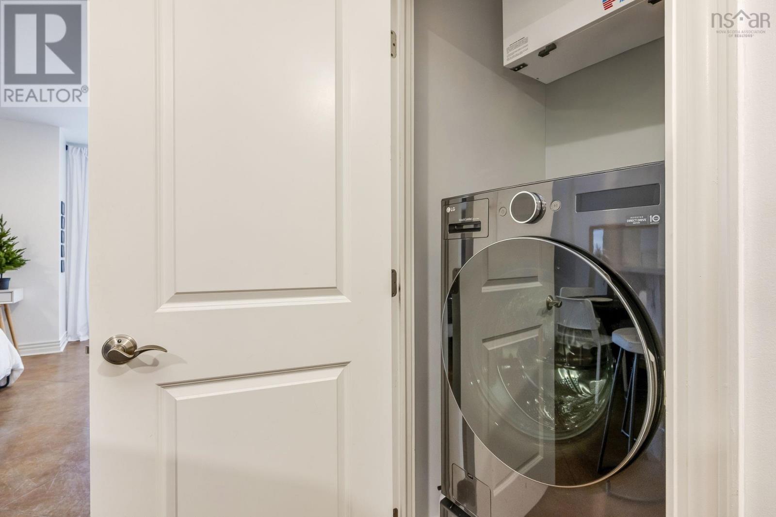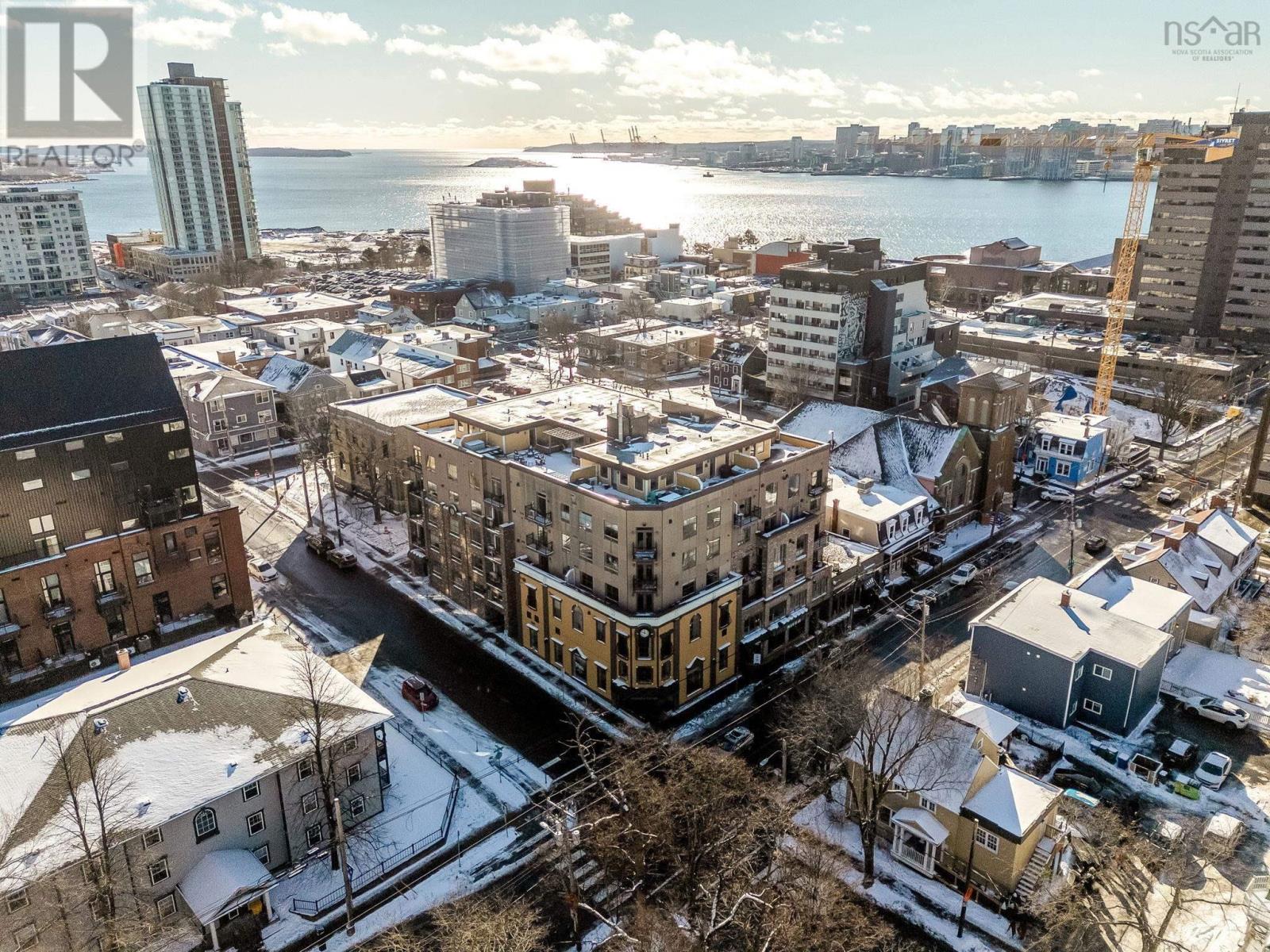Welcome to one of the most sought-after buildings and locations in Dartmouth: Founders Corner. The only studio in the building, this suite offers a lifestyle of luxury and convenience, and is perfect for downsizers, city weekenders, young professionals, or investors. With polished concrete floors in an antique finish, 9-foot ceilings, and concrete and brick columns throughout, the style of this condo is undeniable. The main area features an open-concept design with a kitchen, dining nook, living room, built-in wall bed with lighting and a bookcase, new large custom walk-in closet, large four-piece bath, and a new in-suite LG washer/dryer with heat pump technology. The large French patio doors to the quaint Juliet balcony allow in lots of natural light, while the all new dimmable LED fixtures throughout and natural gas fireplace will also set the mood on cold winter nights. The newly renovated kitchen features all new appliances, freshly painted cabinetry, new hardware, faucet, shiplap, backsplash, and trim. The kitchen and bathroom both feature stone countertops. Radiant in-floor heating and a new Fujitsu ductless heat pump keep you comfortable all year round. Leased parking space is available just across the street. Amenities include an extra-large storage unit, elevator, security, live-in super, and the building is pet-friendly. The rooftop patio and solarium, with gardens, boast stunning views and provide plenty of room for entertaining or relaxing outdoors with friends and family. There's also a social room with a library and board games. Located above Two If By Sea Cafe and Yeah Yeah's Pizza, you're also close to several other Downtown Dartmouth hotspots as well as the ferry terminal, Brightwood Golf Club, paddling clubs, and Sullivan's Pond. On Saturday mornings, just a short walk away, you can grab fresh whole foods from the Farmer's Market at Alderney Landing or hop the Dartmouth Ferry to Pier 1 or Brewery Markets. (231927384)