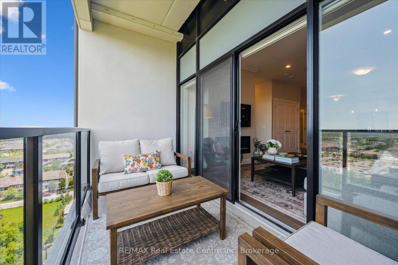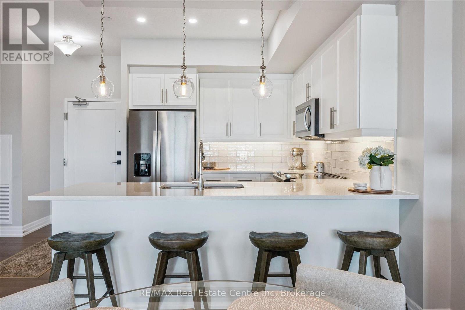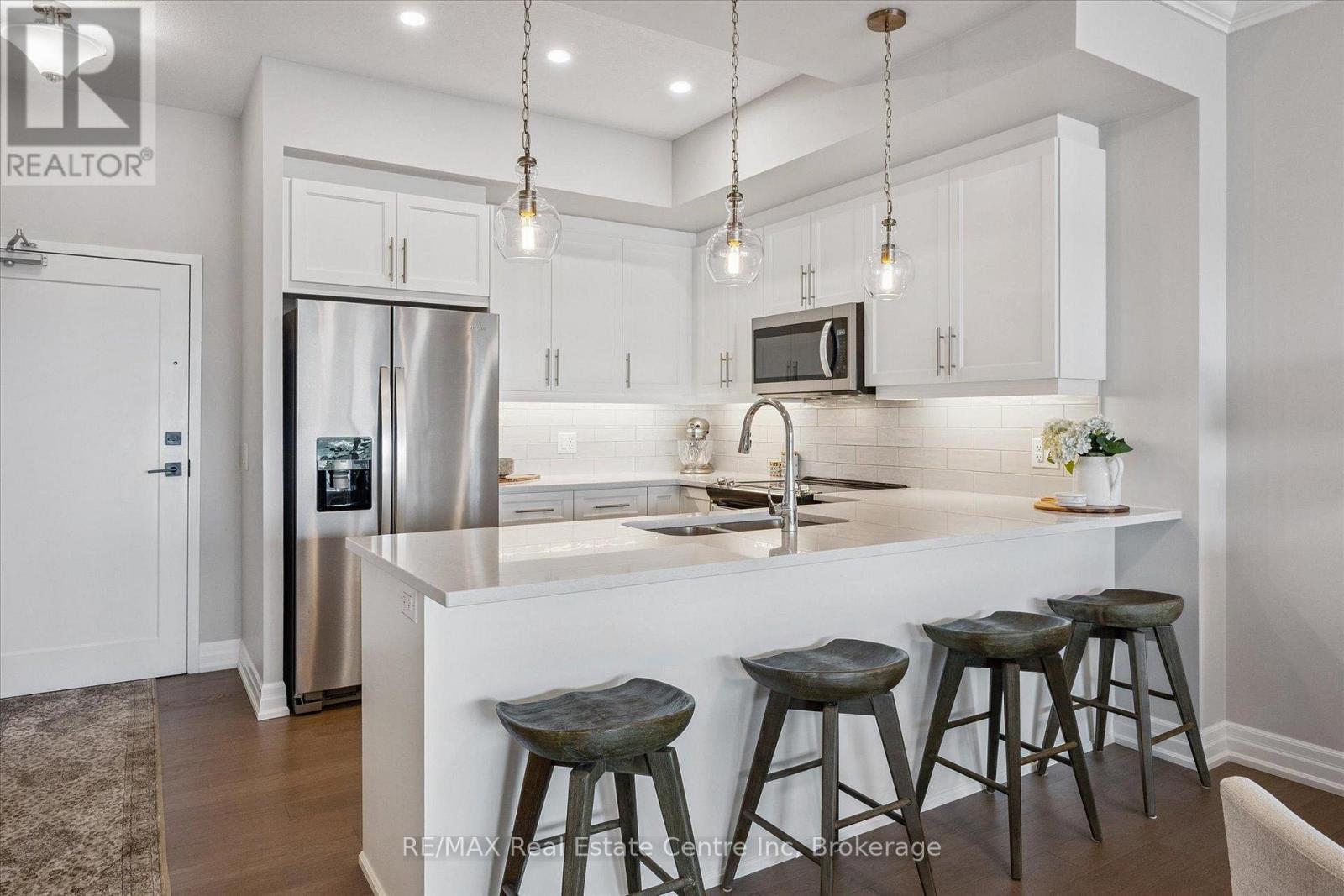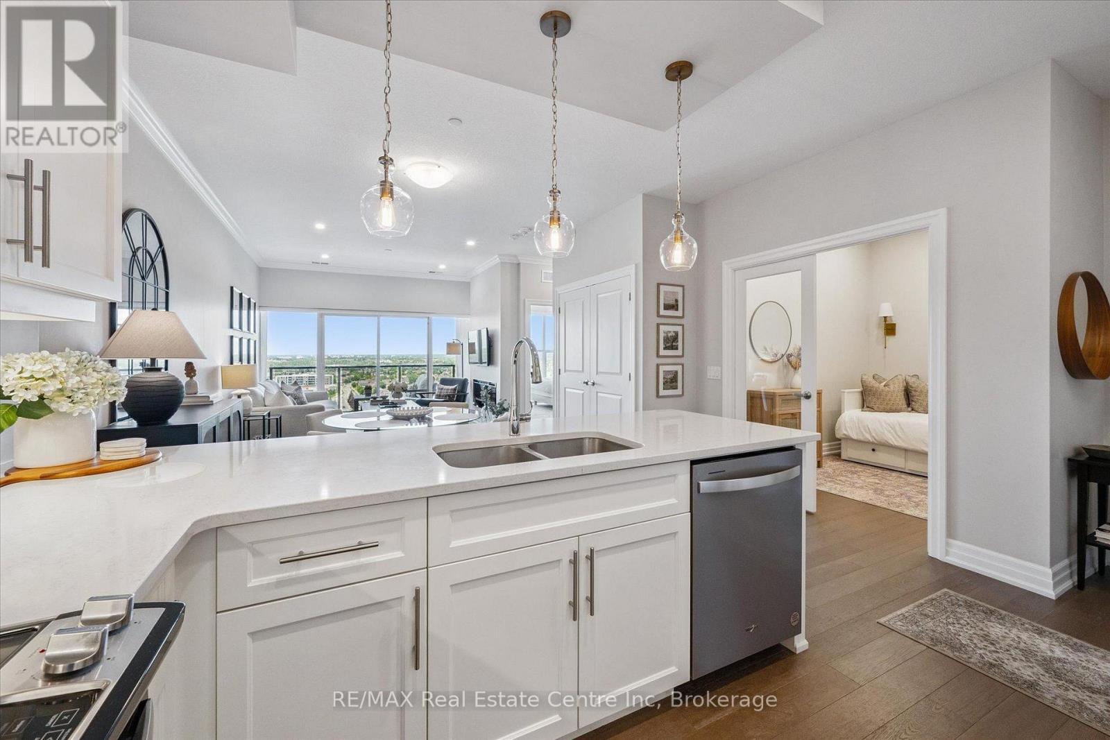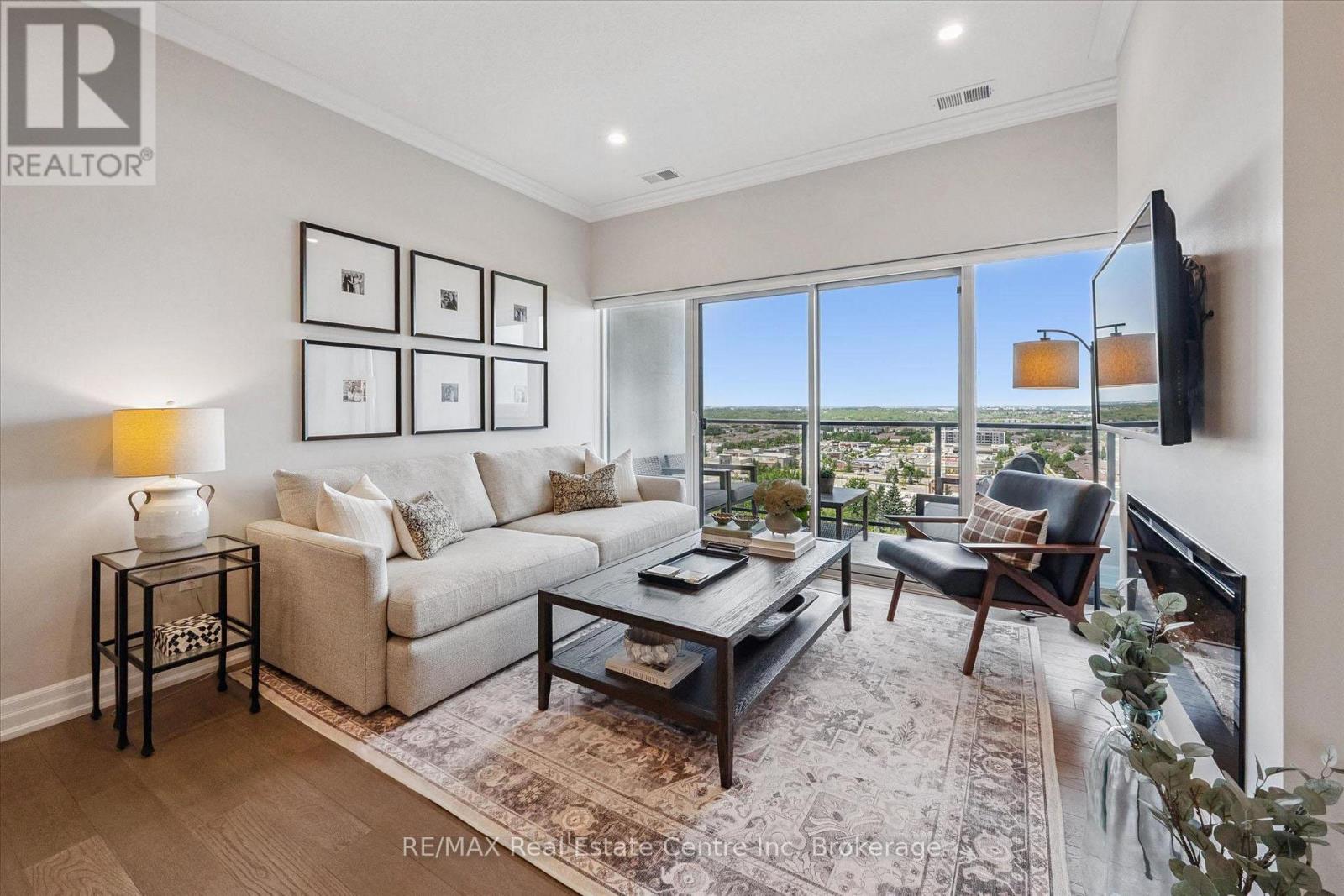 Set high above Guelph's vibrant south-end this suite showcases impressive 941sqft, 1-bdrm + den where modern elegance meets breathtaking views! Bathed in natural light this unit captures sweeping vistas of treetops & city skyline offering serene backdrop for everyday living. At this price point it offers exceptional value per sqft in one of Guelph's desirable neighbourhoods. Designed W/upscale finishes this modern suite exudes comfort & sophistication. Soaring ceilings & wide-plank engineered hardwood create airy ambience that flows seamlessly through the open-concept living space. Relax by fireplace in living room or step onto private balcony-ideal spot to sip morning coffee or unwind & take in city views. Gourmet kitchen W/white cabinetry, quartz counters, backsplash & S/S appliances. Oversized breakfast bar W/pendant lighting invites casual dining & entertaining. Primary bdrm W/floor-to-ceiling windows deliver breathtaking vistas. Luxurious 4pc bath W/oversized vanity, quartz counters & soaker tub surrounded by marble-inspired tile. French doors reveal versatile den-ideal as home office, guest room or creative studio. W/I closet in entryway & pantry off dining area keep everything organized & within reach. Live, work & play without leaving home! Residents enjoy amenities: state-of-the-art fitness, golf simulator lounge W/bar, social spaces W/kitchen, billiards, lounge seating & outdoor terrace. Underground parking for yr-round convenience! For parents of U of G students this suite is a smart alternative to renting. Invest in an appreciating asset 10-min from campus W/direct bus access. 24/7 on-site mgmt & controlled entry, you'll have peace of mind knowing your child is living safely while your investment grows in value. Steps to Pergola Commons for access to groceries, restaurants & shops. Quick access to 401 for commuters. Whether you're picking up produce, meeting friends for dinner or exploring parks & trails, this neighbourhood has it all! (42084730)