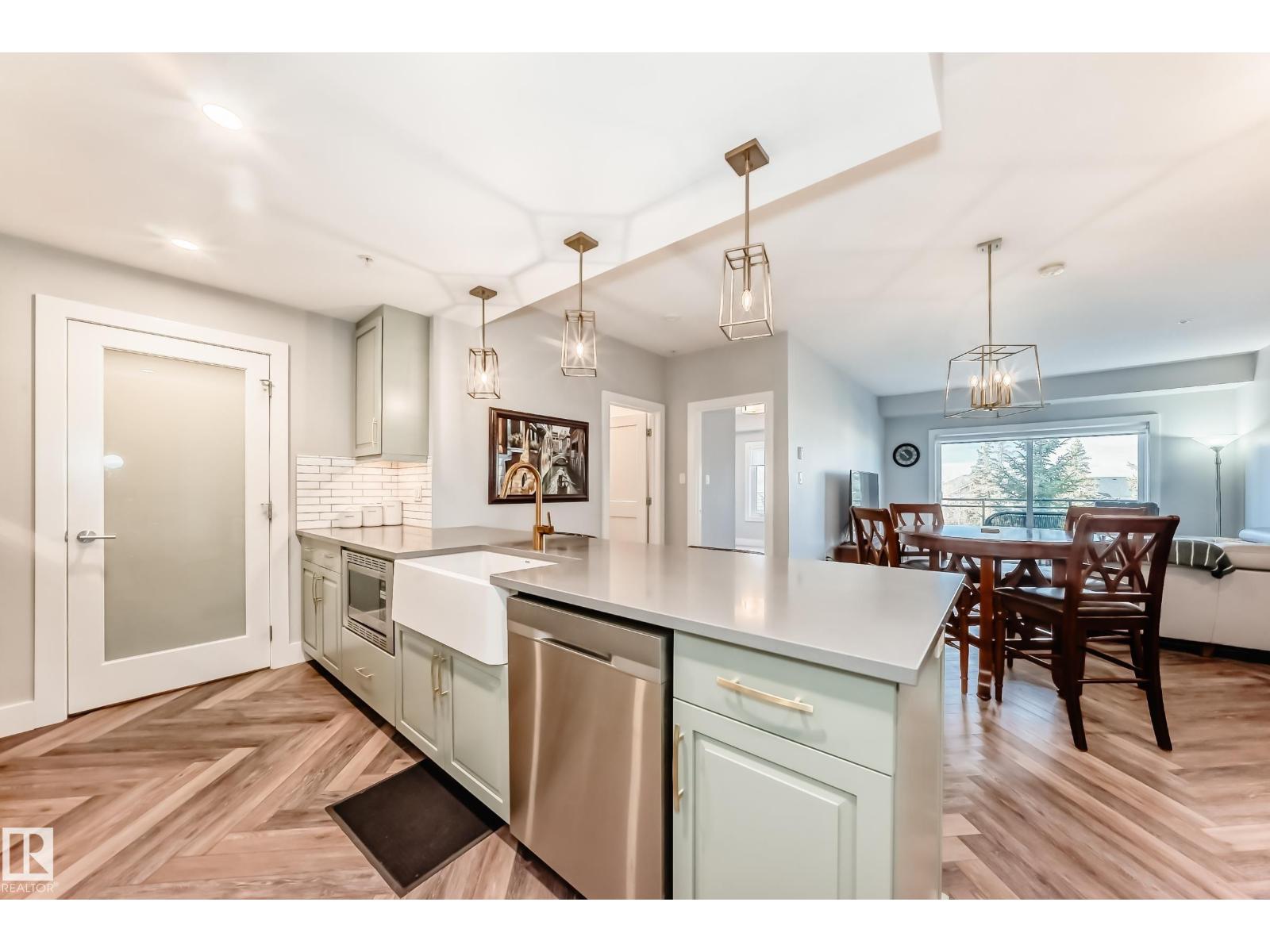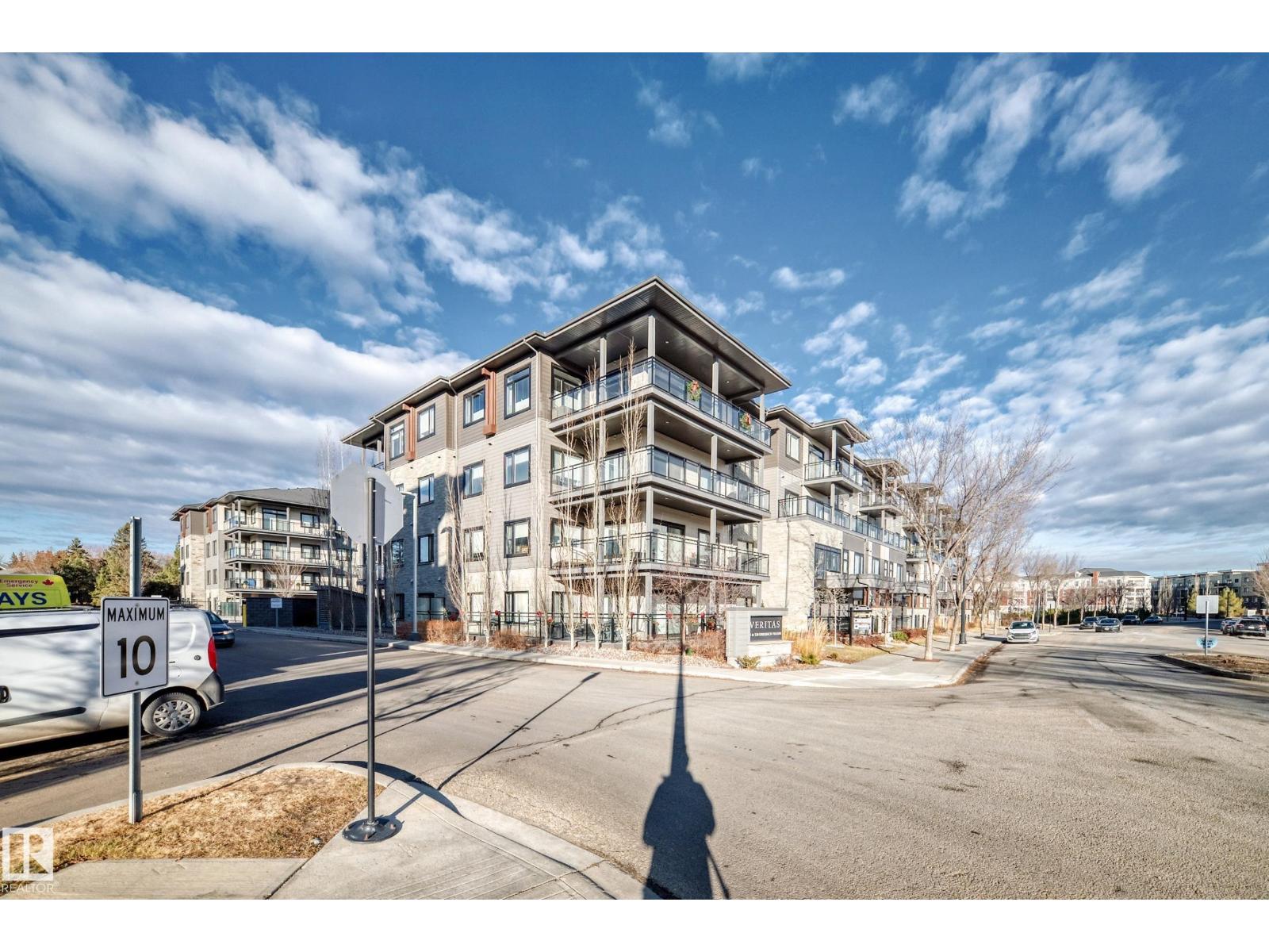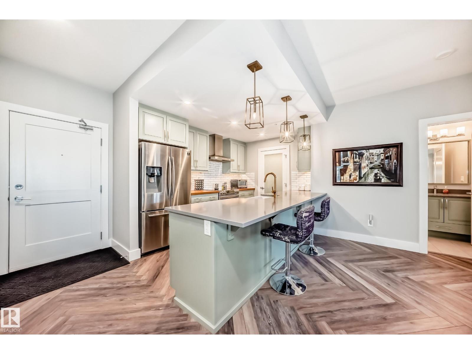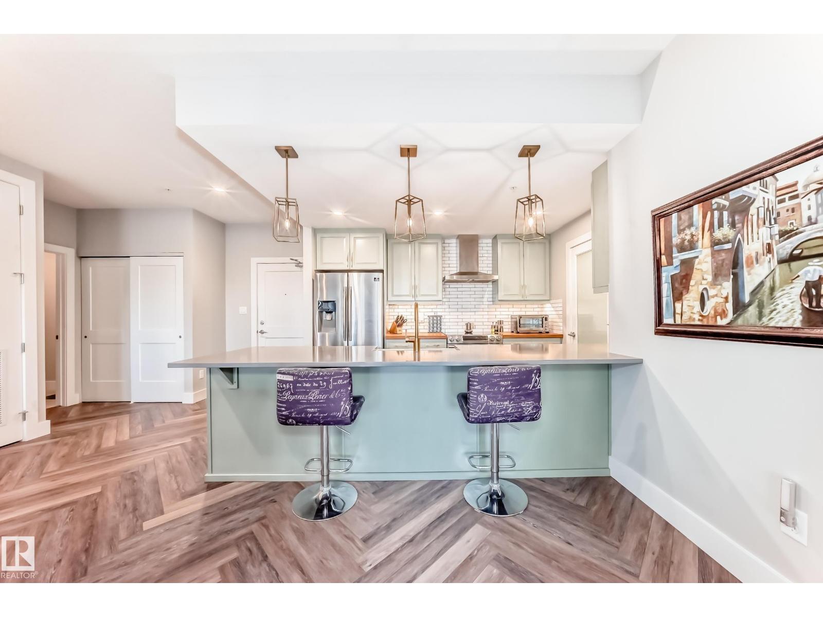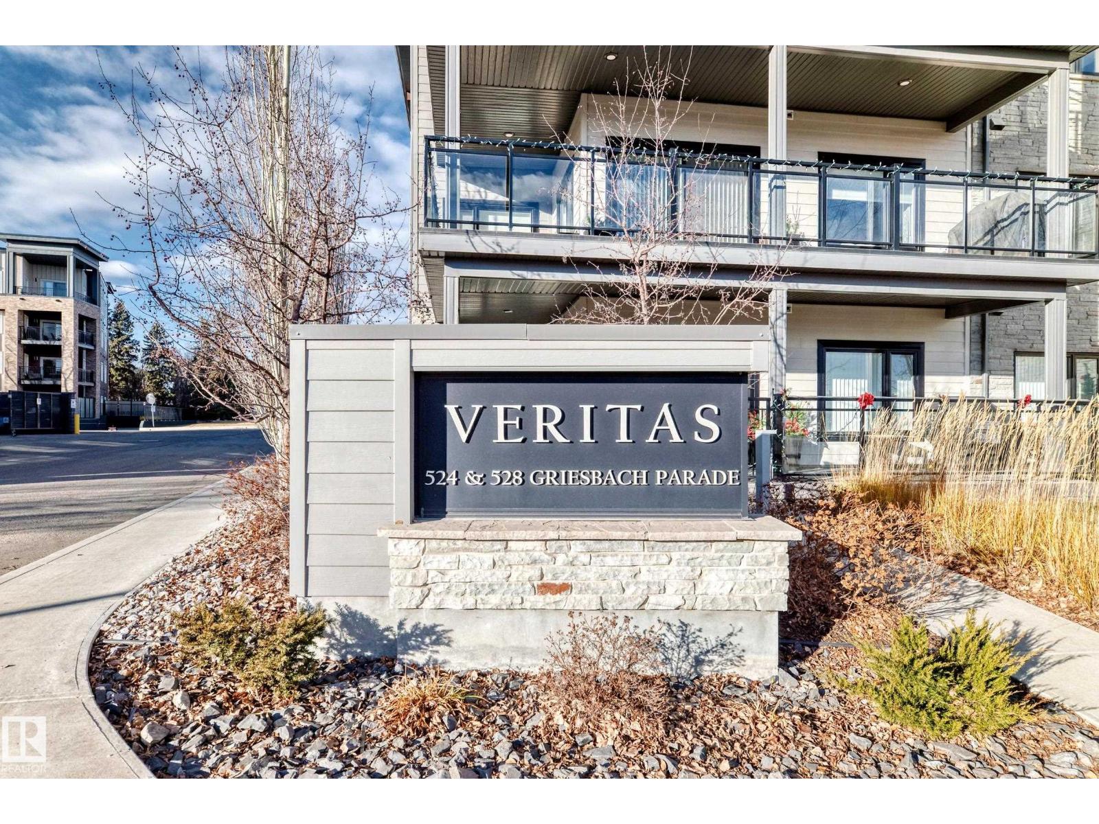 Beautiful Griesbach executive style 1,130 square foot, 2 bedroom, 2 bathroom, 2018 built, 3rd floor condo, in and incredible location backing onto greenspace and lake. The main floor has vinyl plank flooring, separate wet bar with mini fridge, and a great open floor plan with eat up island style kitchen having 2 tone cabinets, quartz countertops, upgraded stainless appliances, walk in pantry & sliding doors to a large balcony. The spacious primary bedroom has walk-through closets, and a 4 piece bathroom. The second bedroom is located close to the main 4 piece bathroom. There are 2 titled parking stalls included underground #98 and surface stall #11. The area has many amenities just minutes away, including shopping, transportation, schools, walking trails, and much more. The Veritas condominium complex has a beautiful front entrance and many extras including, fitness room, air conditioning, guest room, social room, & visitor parking out front. This unit shows pride of ownership and shows a 10 out of 10 (33798609)