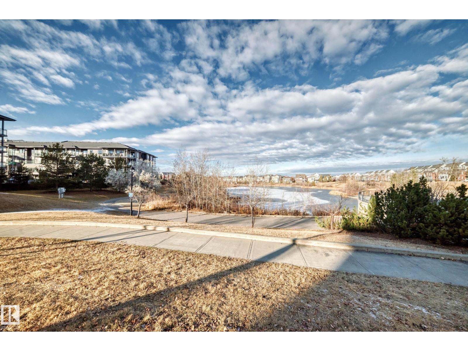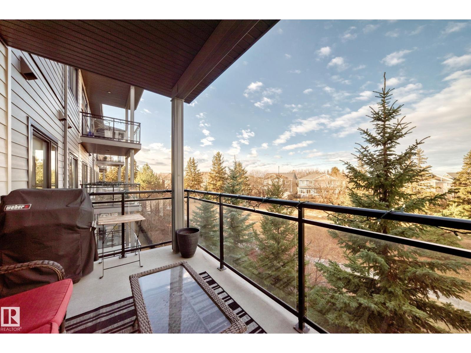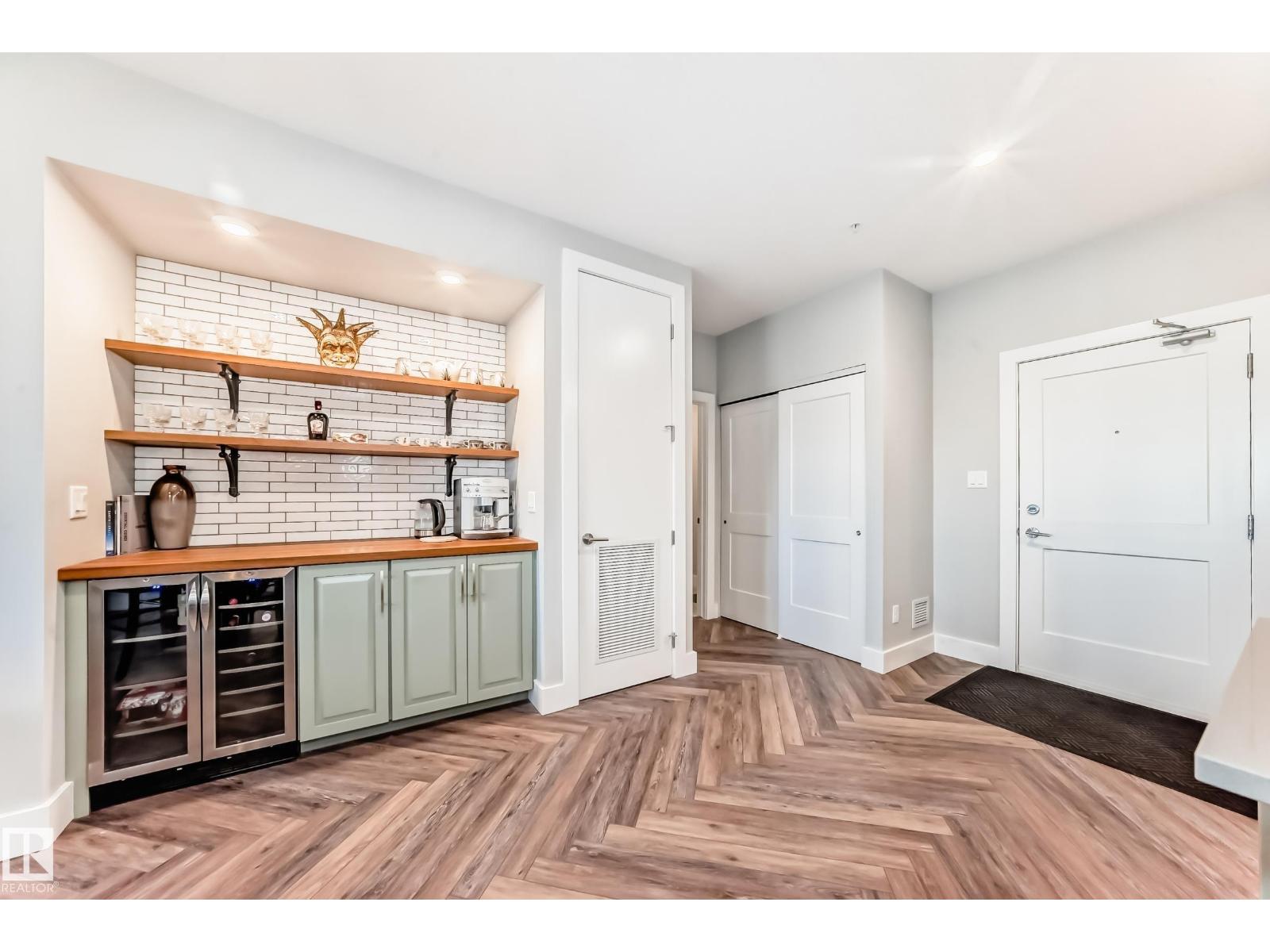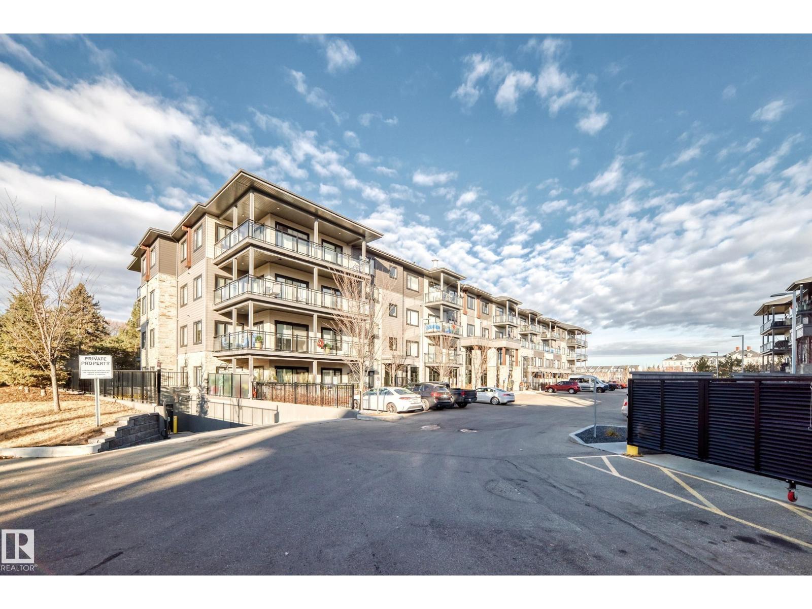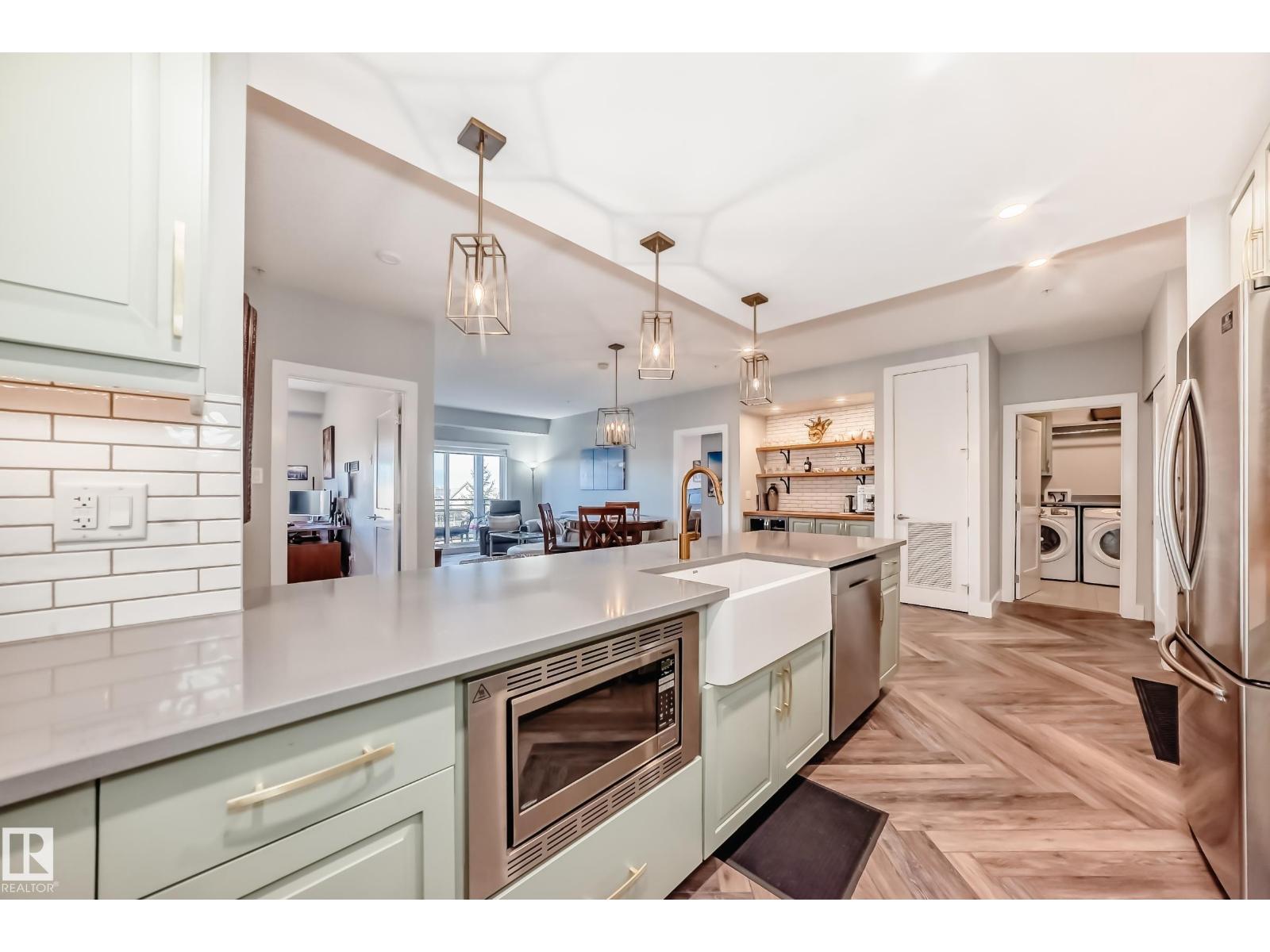Beautiful Griesbach executive style 1,130 square foot, 2 bedroom, 2 bathroom, 2018 built, 3rd floor condo, in and incredible location backing onto greenspace and lake. The main floor has vinyl plank flooring, separate wet bar with mini fridge, and a great open floor plan with eat up island style kitchen having 2 tone cabinets, quartz countertops, upgraded stainless appliances, walk in pantry & sliding doors to a large balcony. The spacious primary bedroom has walk-through closets, and a 4 piece bathroom. The second bedroom is located close to the main 4 piece bathroom. There are 2 titled parking stalls included underground #98 and surface stall #11. The area has many amenities just minutes away, including shopping, transportation, schools, walking trails, and much more. The Veritas condominium complex has a beautiful front entrance and many extras including, fitness room, air conditioning, guest room, social room, & visitor parking out front. This unit shows pride of ownership and shows a 10 out of 10 (33798609)