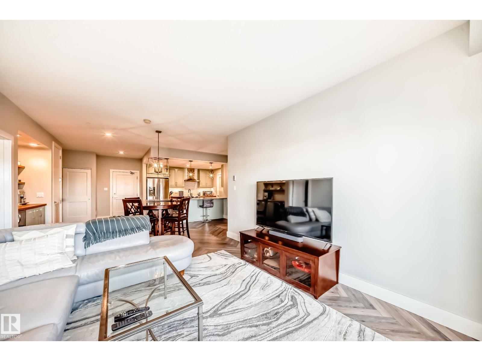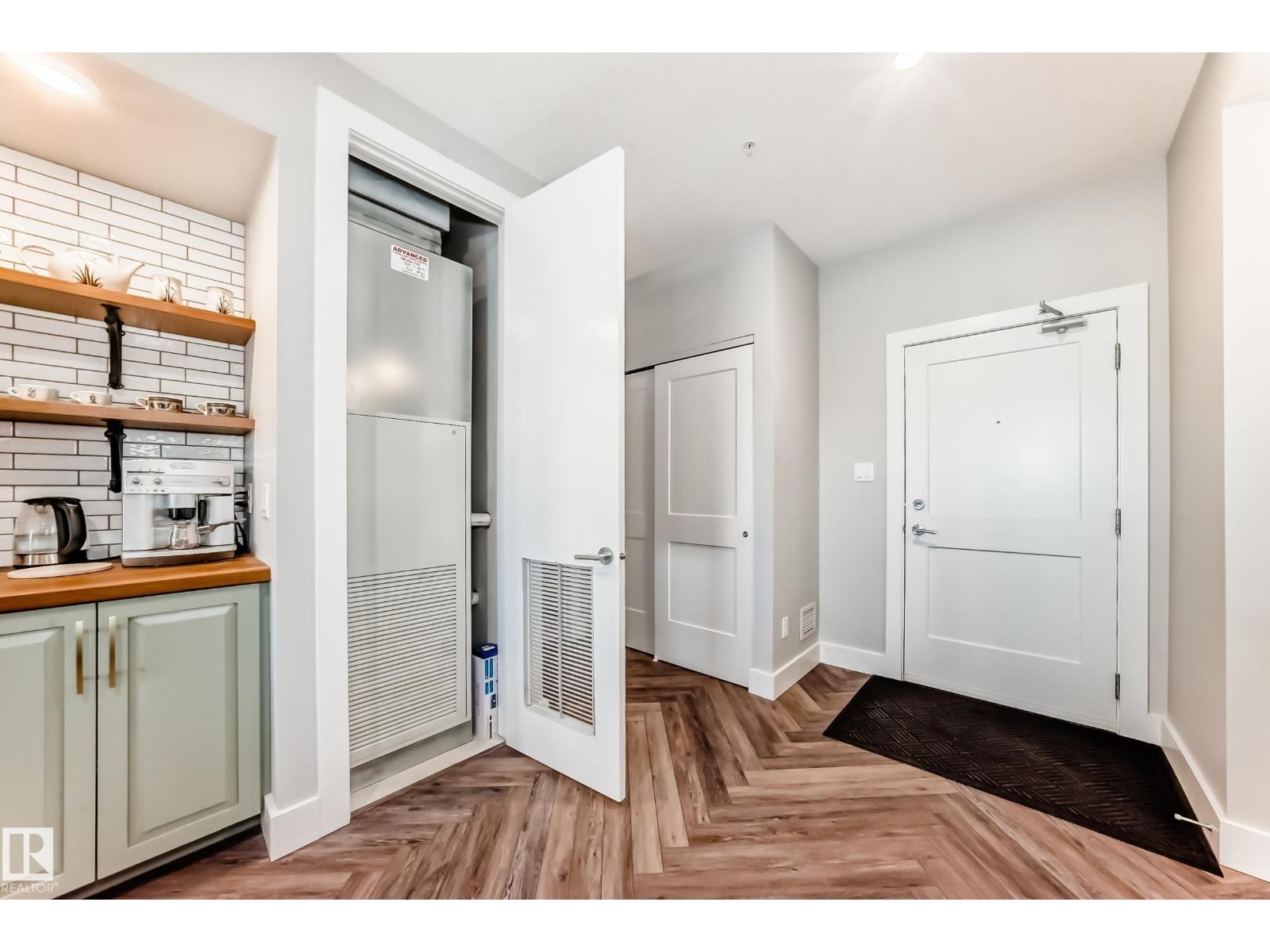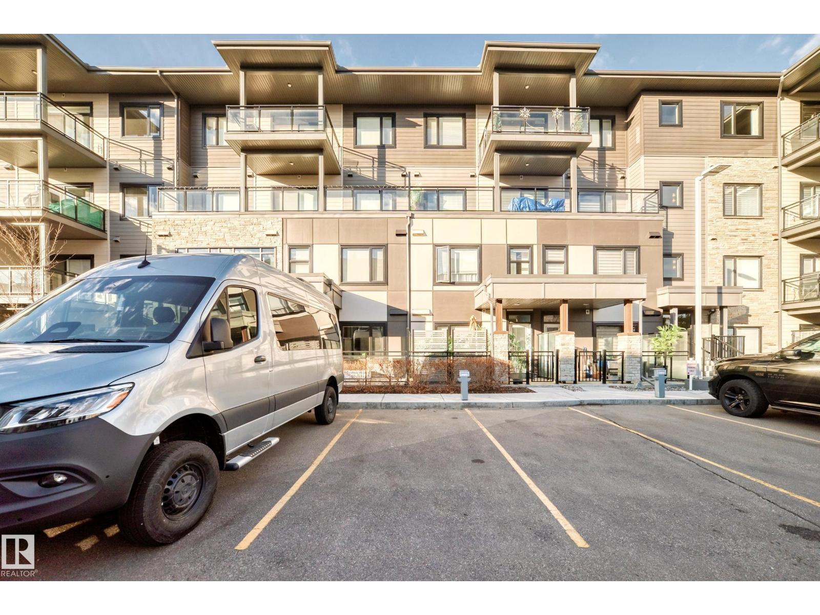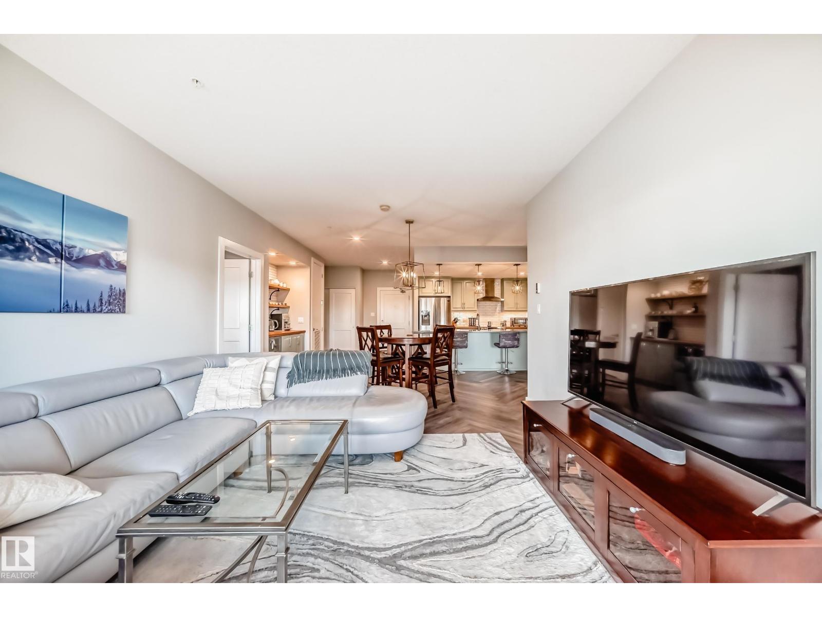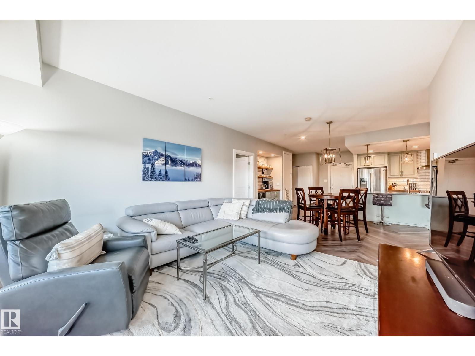 Beautiful Griesbach executive style 1,130 square foot, 2 bedroom, 2 bathroom, 2018 built, 3rd floor condo, in and incredible location backing onto greenspace and lake. The main floor has vinyl plank flooring, separate wet bar with mini fridge, and a great open floor plan with eat up island style kitchen having 2 tone cabinets, quartz countertops, upgraded stainless appliances, walk in pantry & sliding doors to a large balcony. The spacious primary bedroom has walk-through closets, and a 4 piece bathroom. The second bedroom is located close to the main 4 piece bathroom. There are 2 titled parking stalls included underground #98 and surface stall #11. The area has many amenities just minutes away, including shopping, transportation, schools, walking trails, and much more. The Veritas condominium complex has a beautiful front entrance and many extras including, fitness room, air conditioning, guest room, social room, & visitor parking out front. This unit shows pride of ownership and shows a 10 out of 10 (33798609)