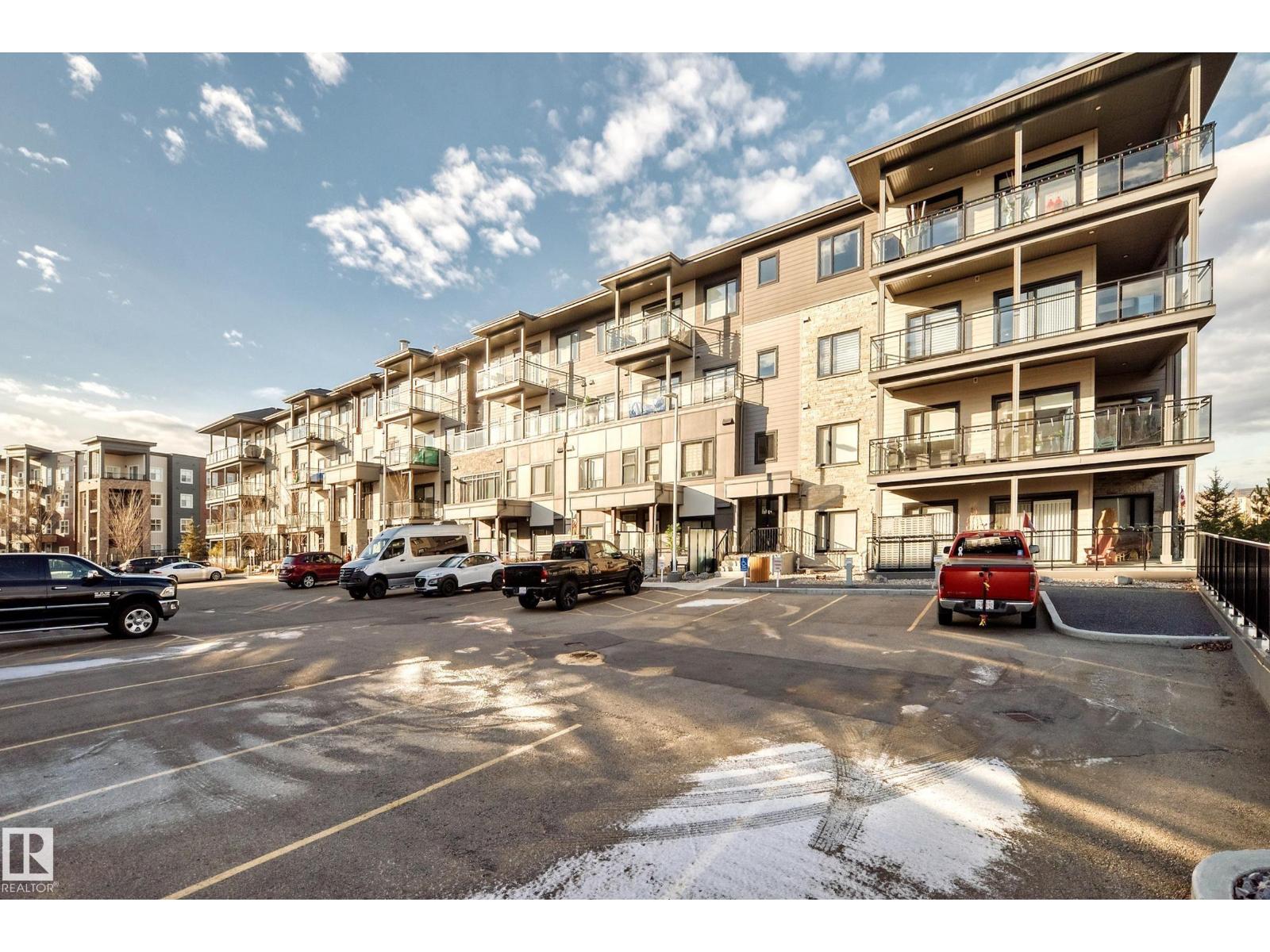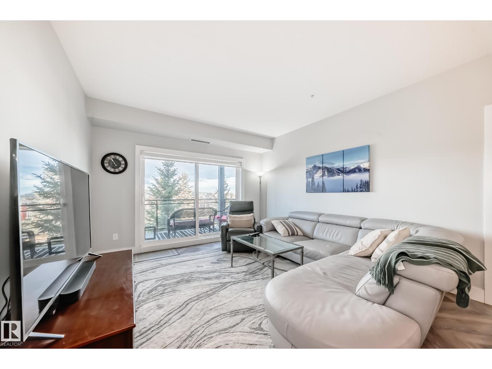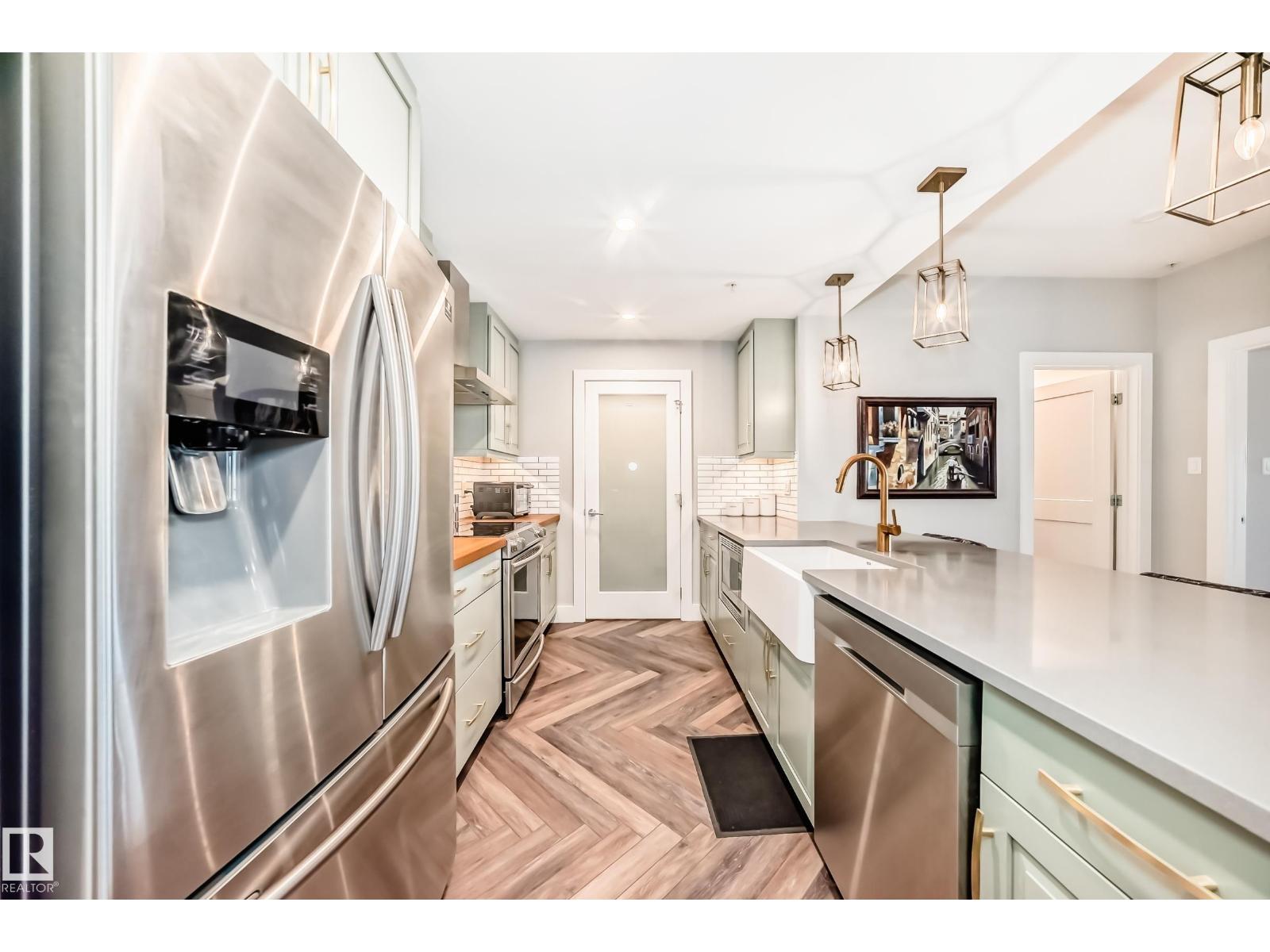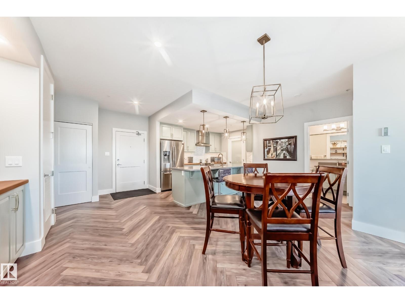 Beautiful Griesbach executive style 1,130 square foot, 2 bedroom, 2 bathroom, 2018 built, 3rd floor condo, in and incredible location backing onto greenspace and lake. The main floor has vinyl plank flooring, separate wet bar with mini fridge, and a great open floor plan with eat up island style kitchen having 2 tone cabinets, quartz countertops, upgraded stainless appliances, walk in pantry & sliding doors to a large balcony. The spacious primary bedroom has walk-through closets, and a 4 piece bathroom. The second bedroom is located close to the main 4 piece bathroom. There are 2 titled parking stalls included underground #98 and surface stall #11. The area has many amenities just minutes away, including shopping, transportation, schools, walking trails, and much more. The Veritas condominium complex has a beautiful front entrance and many extras including, fitness room, air conditioning, guest room, social room, & visitor parking out front. This unit shows pride of ownership and shows a 10 out of 10 (33798609)