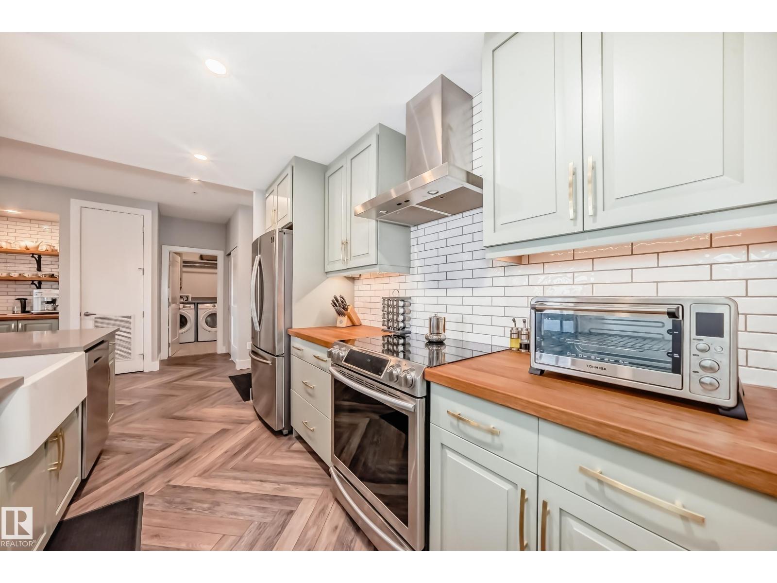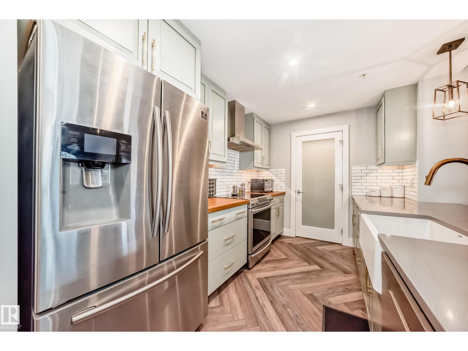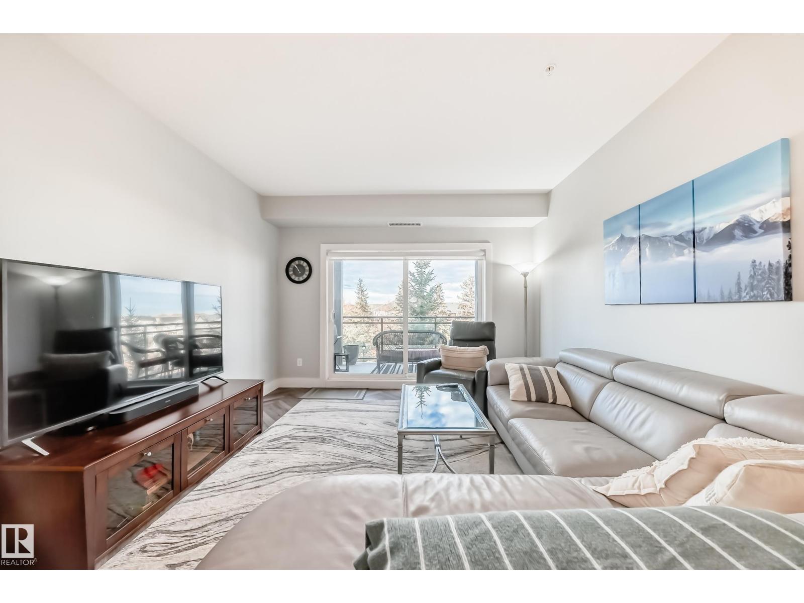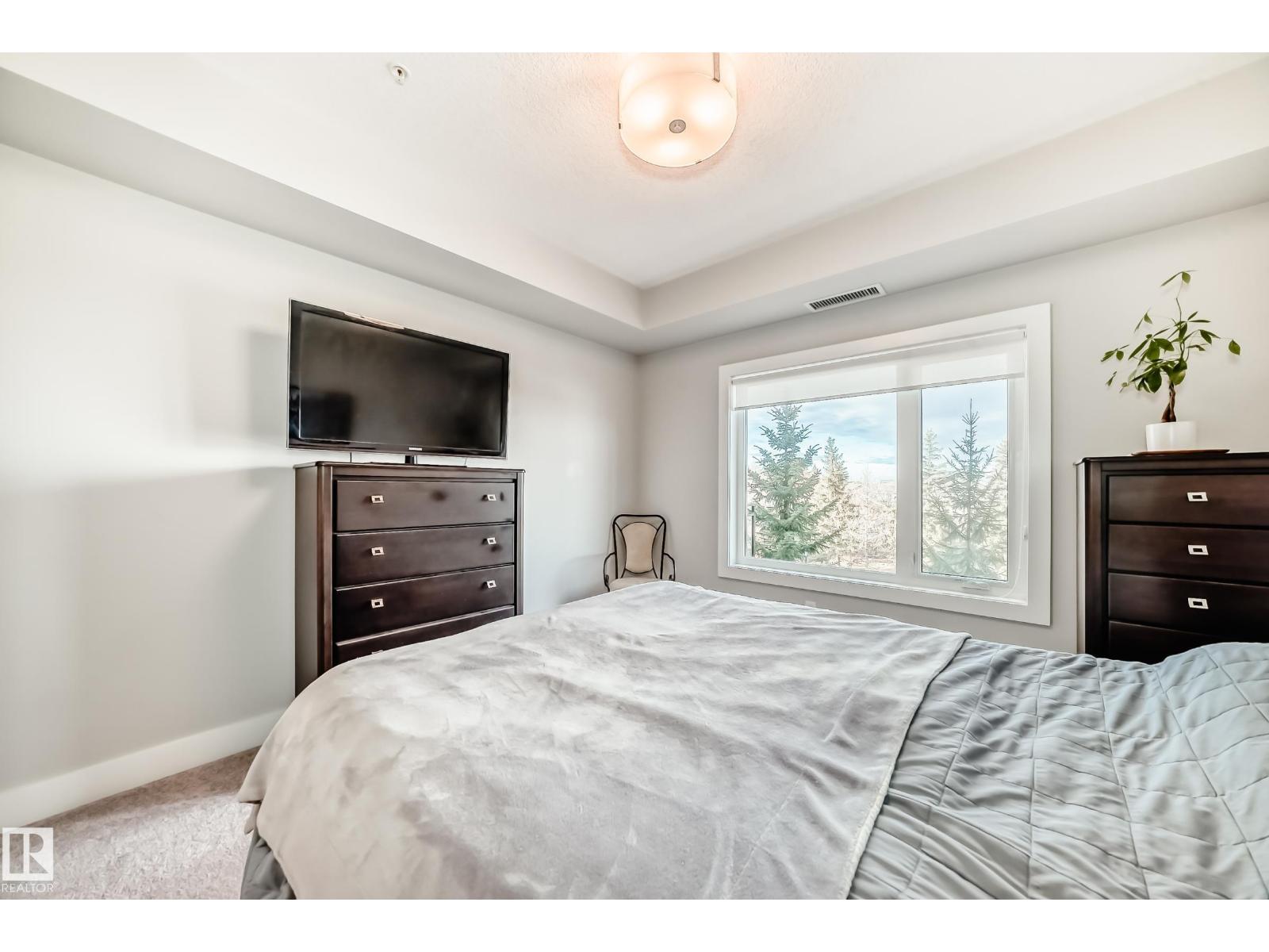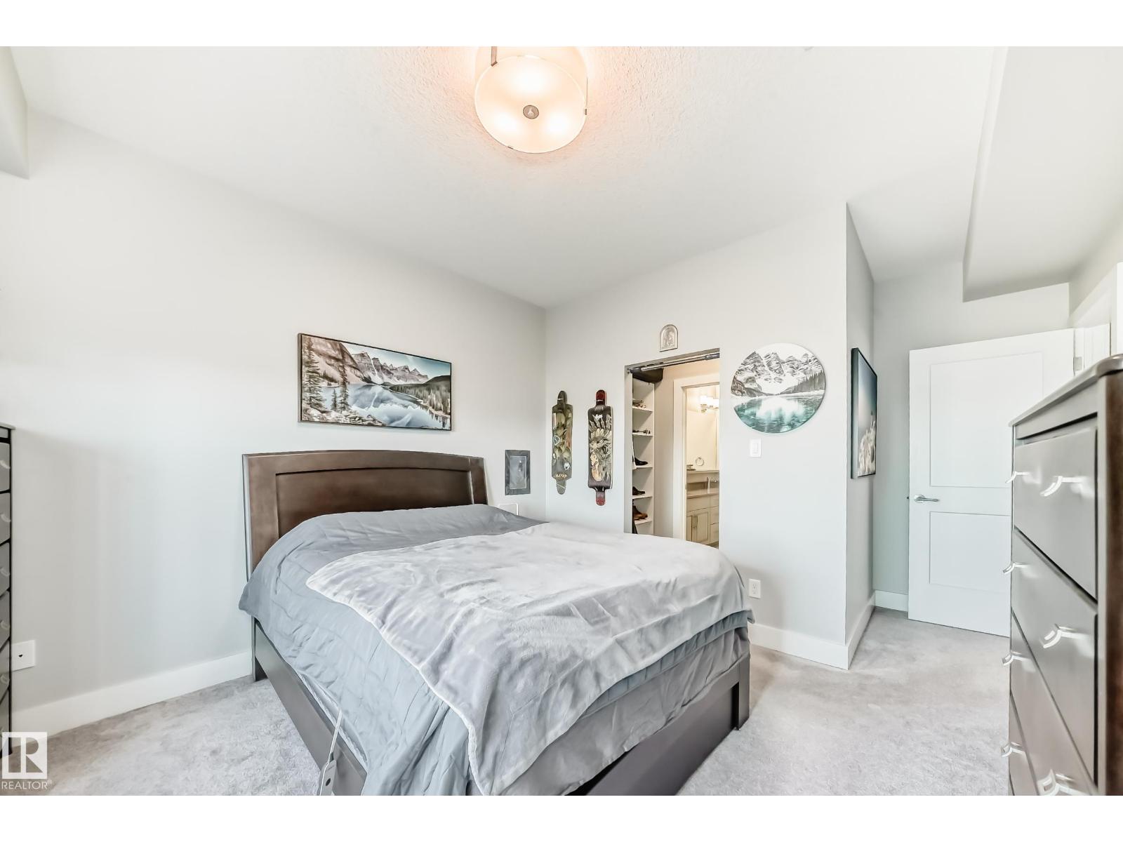 Beautiful Griesbach executive style 1,130 square foot, 2 bedroom, 2 bathroom, 2018 built, 3rd floor condo, in and incredible location backing onto greenspace and lake. The main floor has vinyl plank flooring, separate wet bar with mini fridge, and a great open floor plan with eat up island style kitchen having 2 tone cabinets, quartz countertops, upgraded stainless appliances, walk in pantry & sliding doors to a large balcony. The spacious primary bedroom has walk-through closets, and a 4 piece bathroom. The second bedroom is located close to the main 4 piece bathroom. There are 2 titled parking stalls included underground #98 and surface stall #11. The area has many amenities just minutes away, including shopping, transportation, schools, walking trails, and much more. The Veritas condominium complex has a beautiful front entrance and many extras including, fitness room, air conditioning, guest room, social room, & visitor parking out front. This unit shows pride of ownership and shows a 10 out of 10 (33798609)