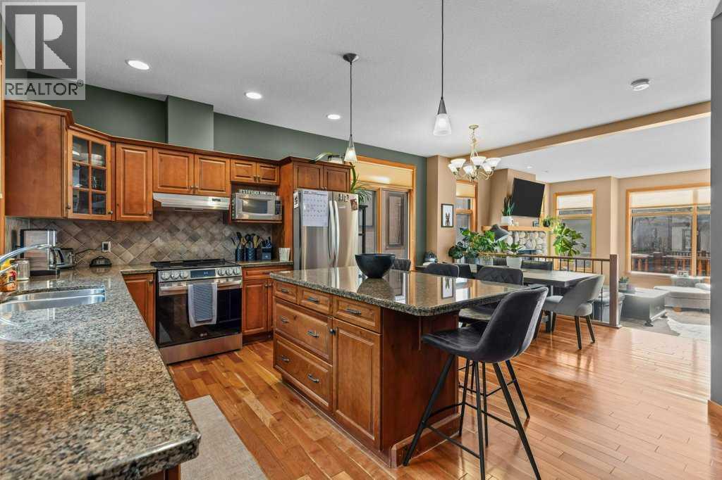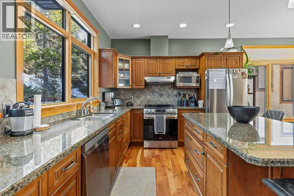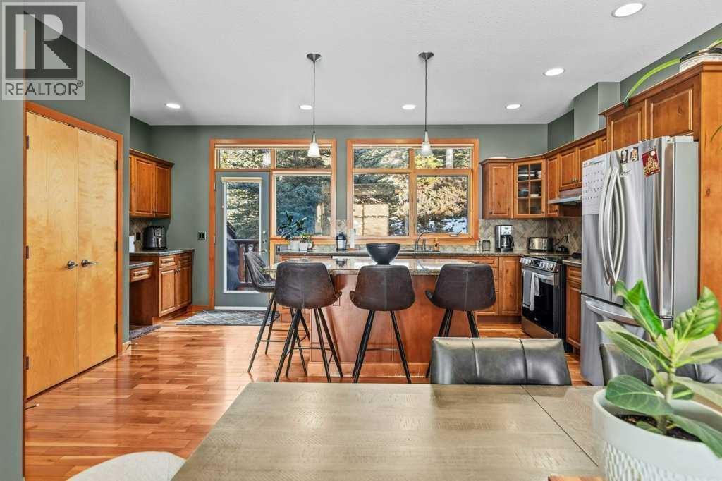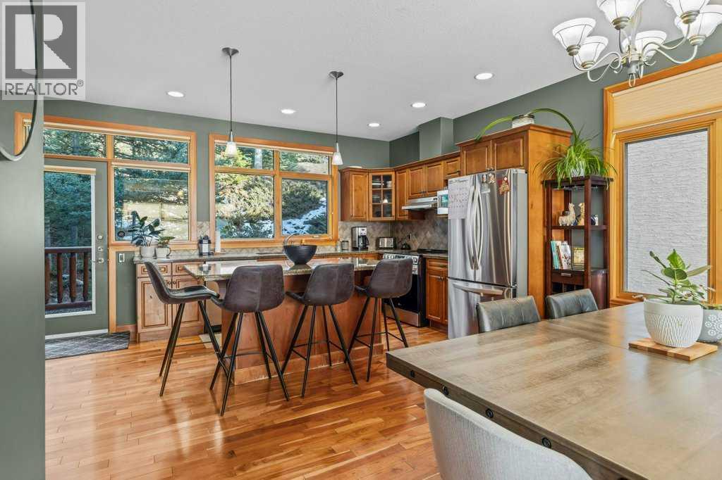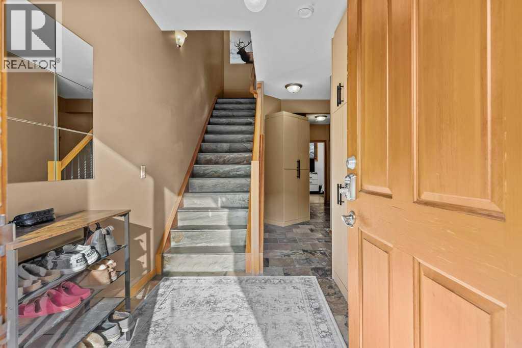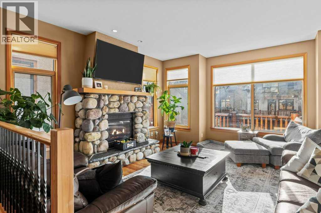 Over 2,000 Sqft of refined living await in this elegant three-level townhome in the quiet, impeccably maintained Eagle Terrace. Mountain-inspired details shine throughout, from the slate tile entry and staircase to the rich hardwood floors and dramatic river rock fireplace. Expansive windows fill the home with natural light, creating a warm yet sophisticated atmosphere. The first floor features in-floor heating, custom built storage, and a large bedroom. On the main floor, an open-concept kitchen, dining, and living area anchored by a large quartz island are perfect for entertaining. Step out onto the spacious decks to relax and take in the fresh mountain air. Upstairs, additional spacious bedrooms with walk-in closets offer comfort and privacy. Just minutes from downtown Canmore, enjoy walking access to restaurants, the Bow River, nearby trails, and Cougar Creek. Experience the best of mountain living in the heart of Canmore (31610738)