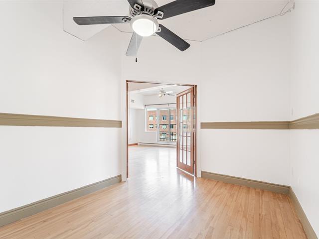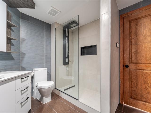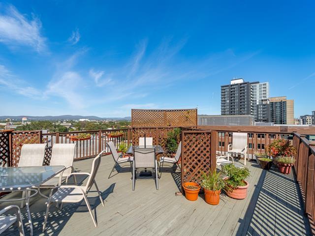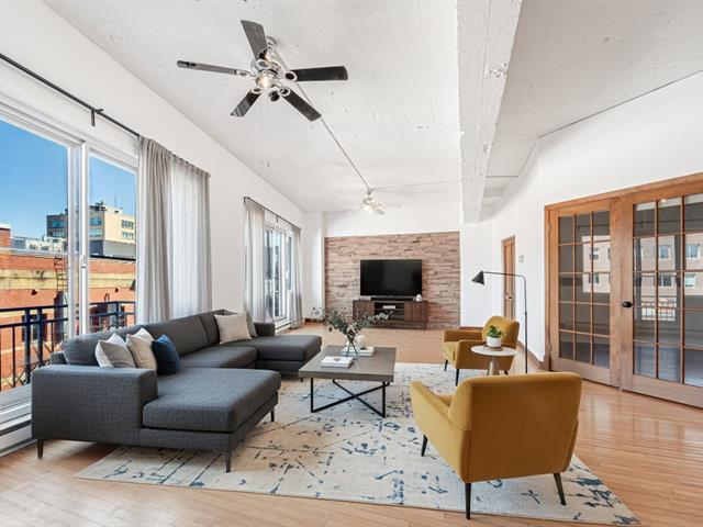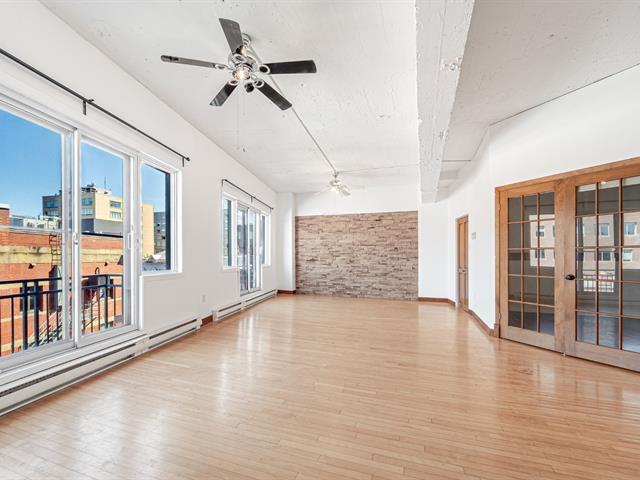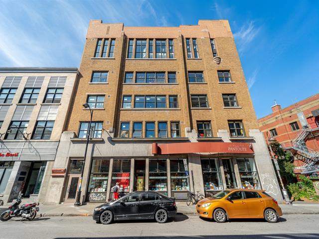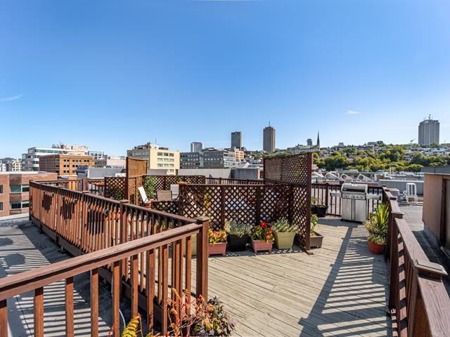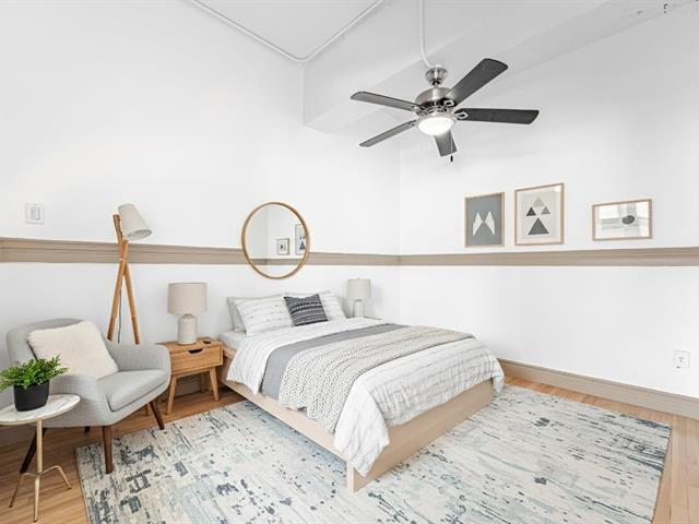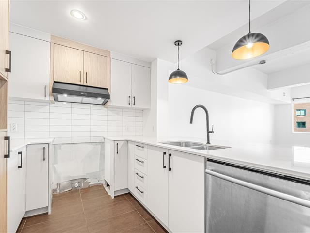Stunning 955 sq. ft. loft-style condo offering an impressive open-concept living space that immediately captivates with its high concrete ceilings, wood moldings, abundant light, and urban charm. Features 1 closed bedroom, separate laundry room with walk-in, modern new kitchen with quartz counters, and renovated bathroom with walk-in shower. Located on the 4th floor of a secure building with elevator, intercom, gym, storage and bike space. Enjoy a magnificent shared rooftop terrace with a BBQ and a 360° view with the city on one side and the mountains on the other. Prime location in a vibrant neighborhood, everything within walking distance! (42138991)